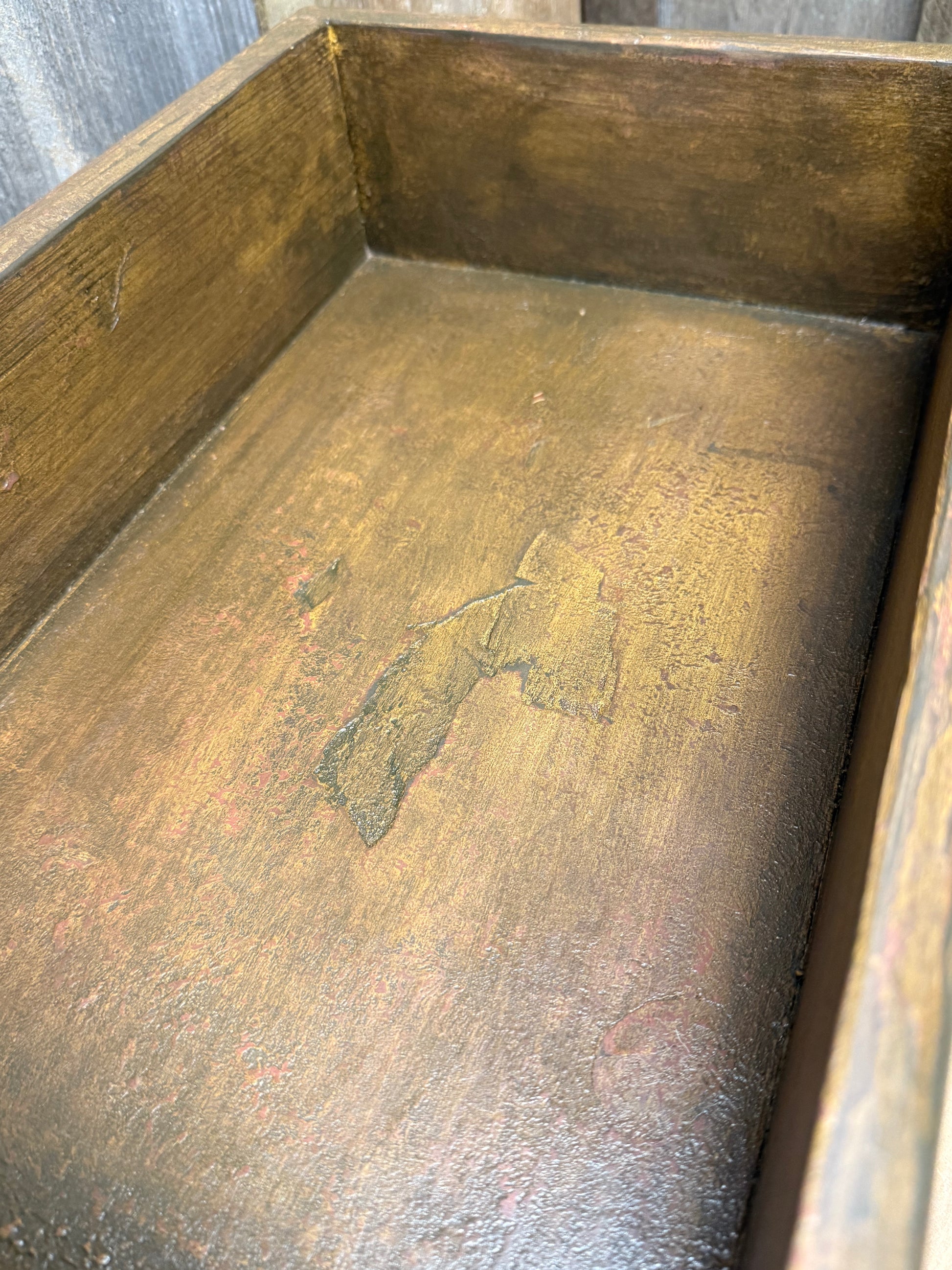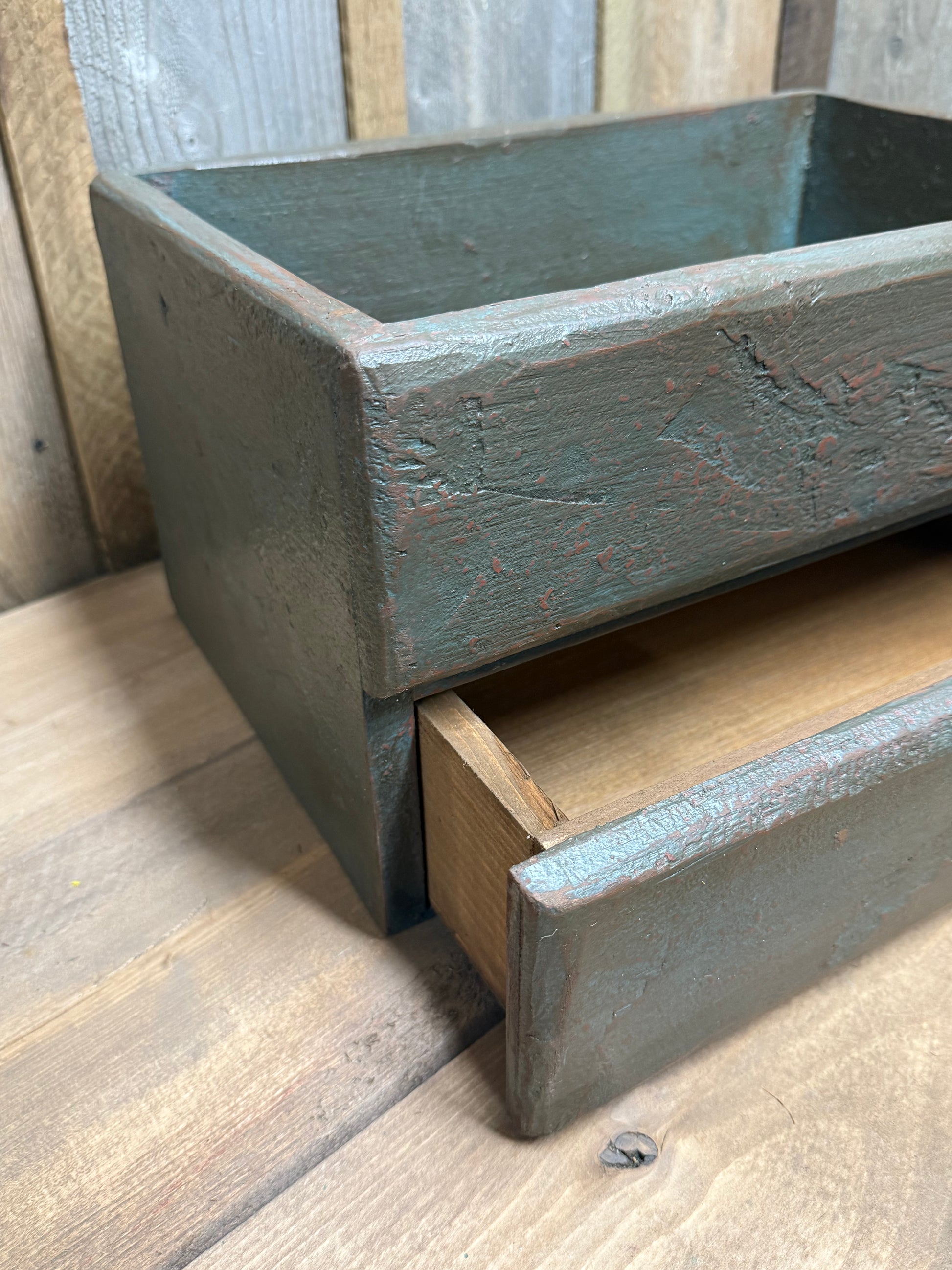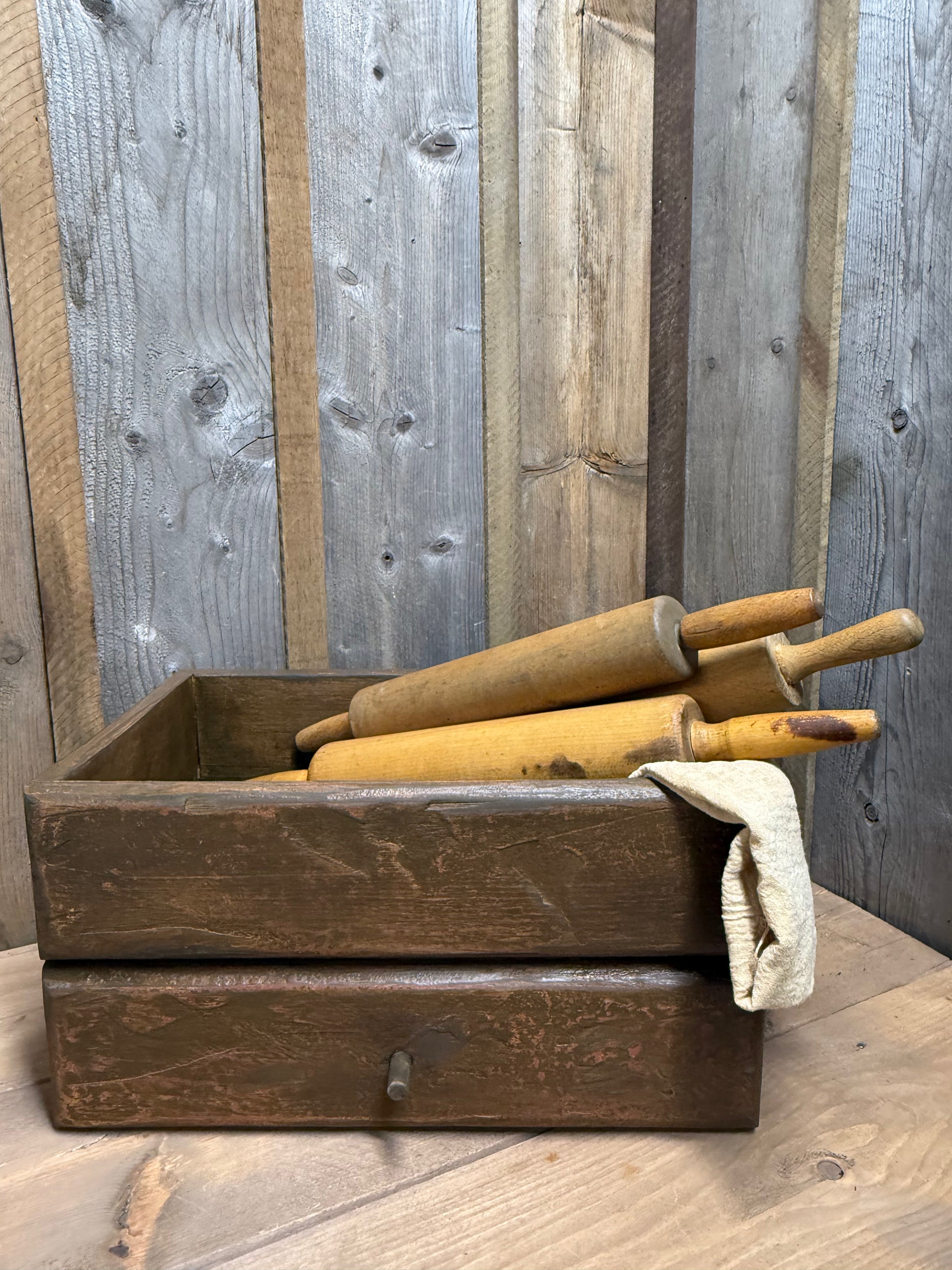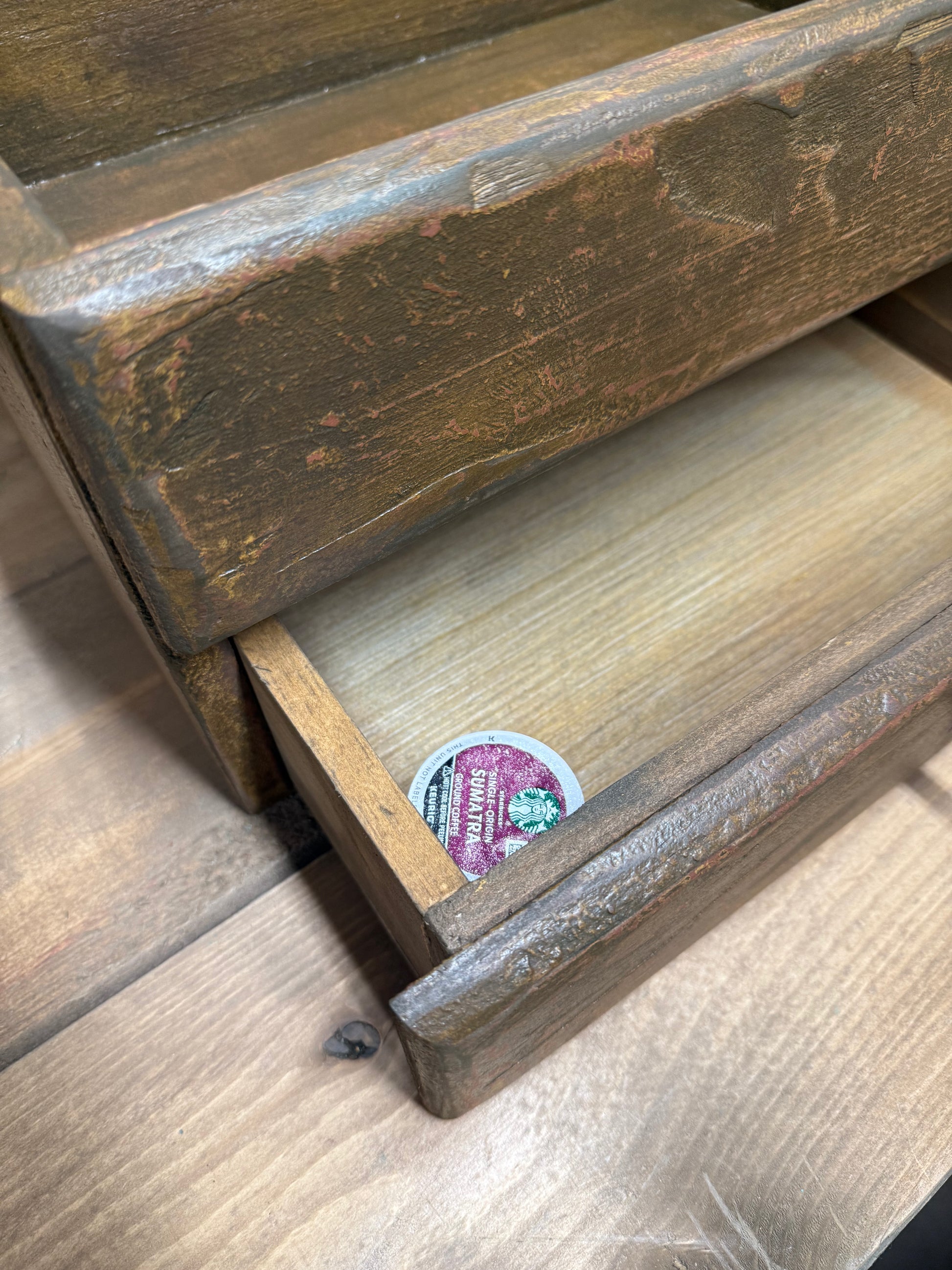 So many uses and what a great look. We started out with our "Local Guy" designing the cabinet and raw wood. A little bit of distressing... well, a lot of distressing, a coat of our special textured paint, a top coat of paint, sanding and then staining to get a primitive look. It will fit K Cups or any other storage you may need. Made by LVP in PA. Measures 16"x 10.5"x 8". Caddy only, rolling pins and flour sack not included.
