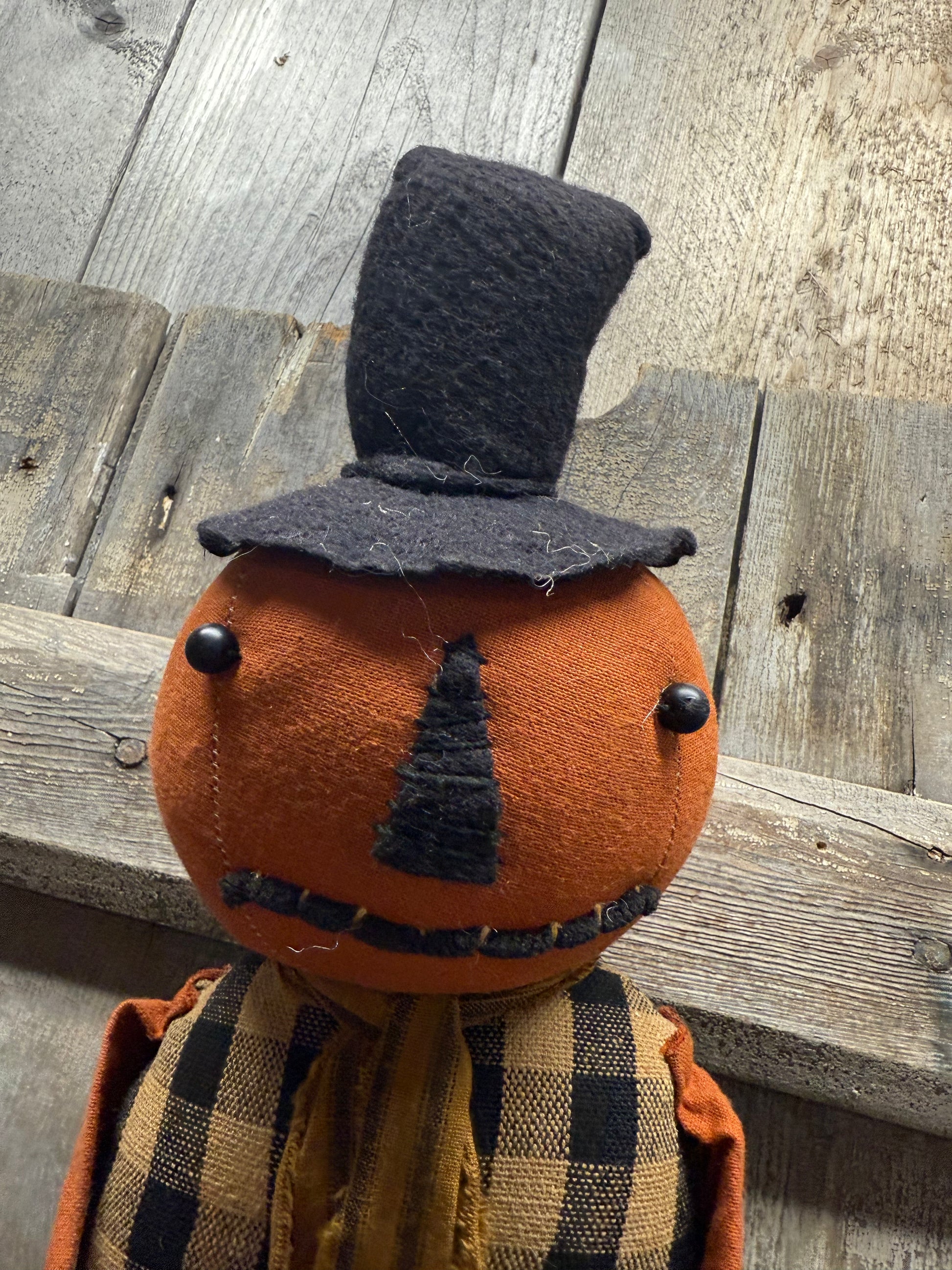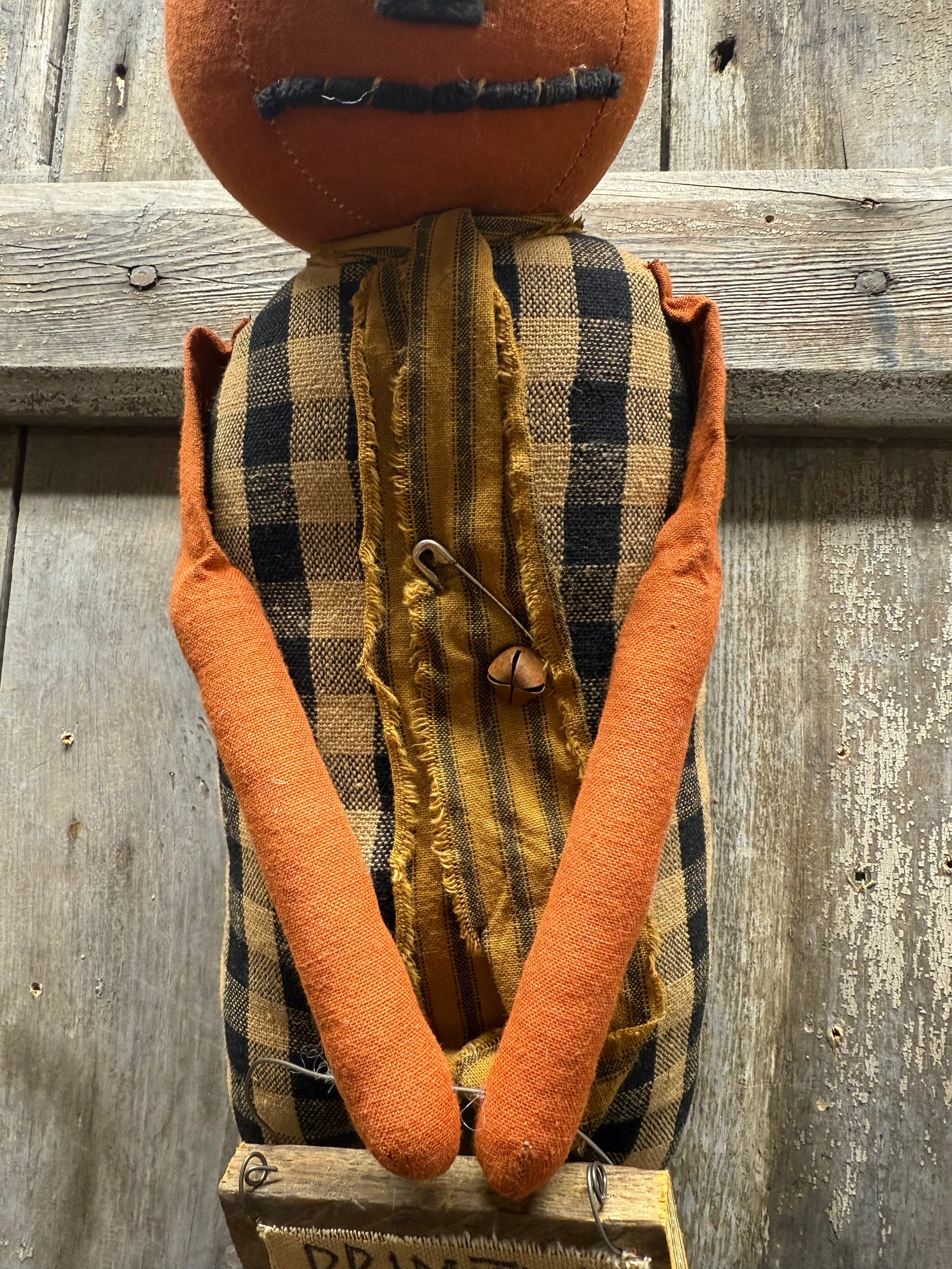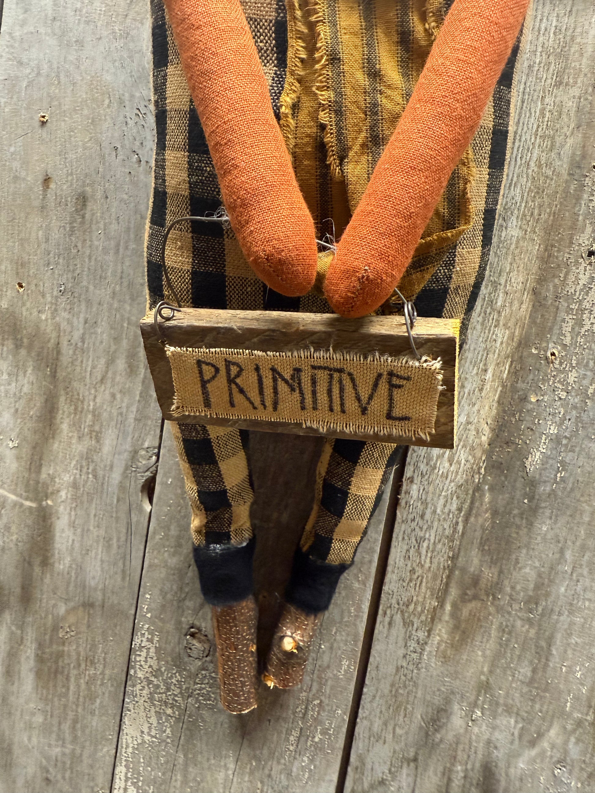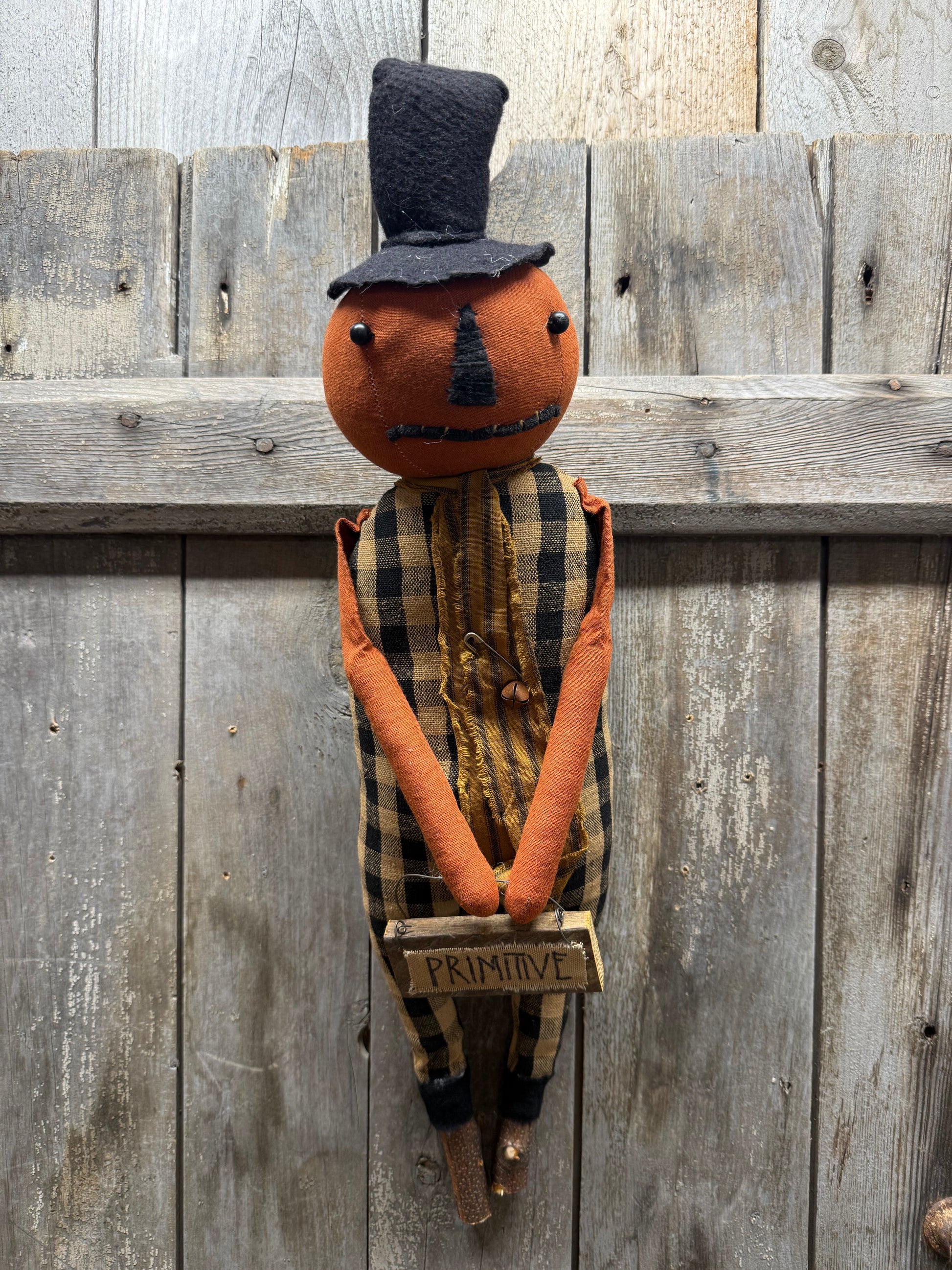 So fun! Stuffed tight, Henry had a hand stitched face, a black top hat and holds a "primitive" sign. Measures 21"x 5" and meant to hang. Made in PA.