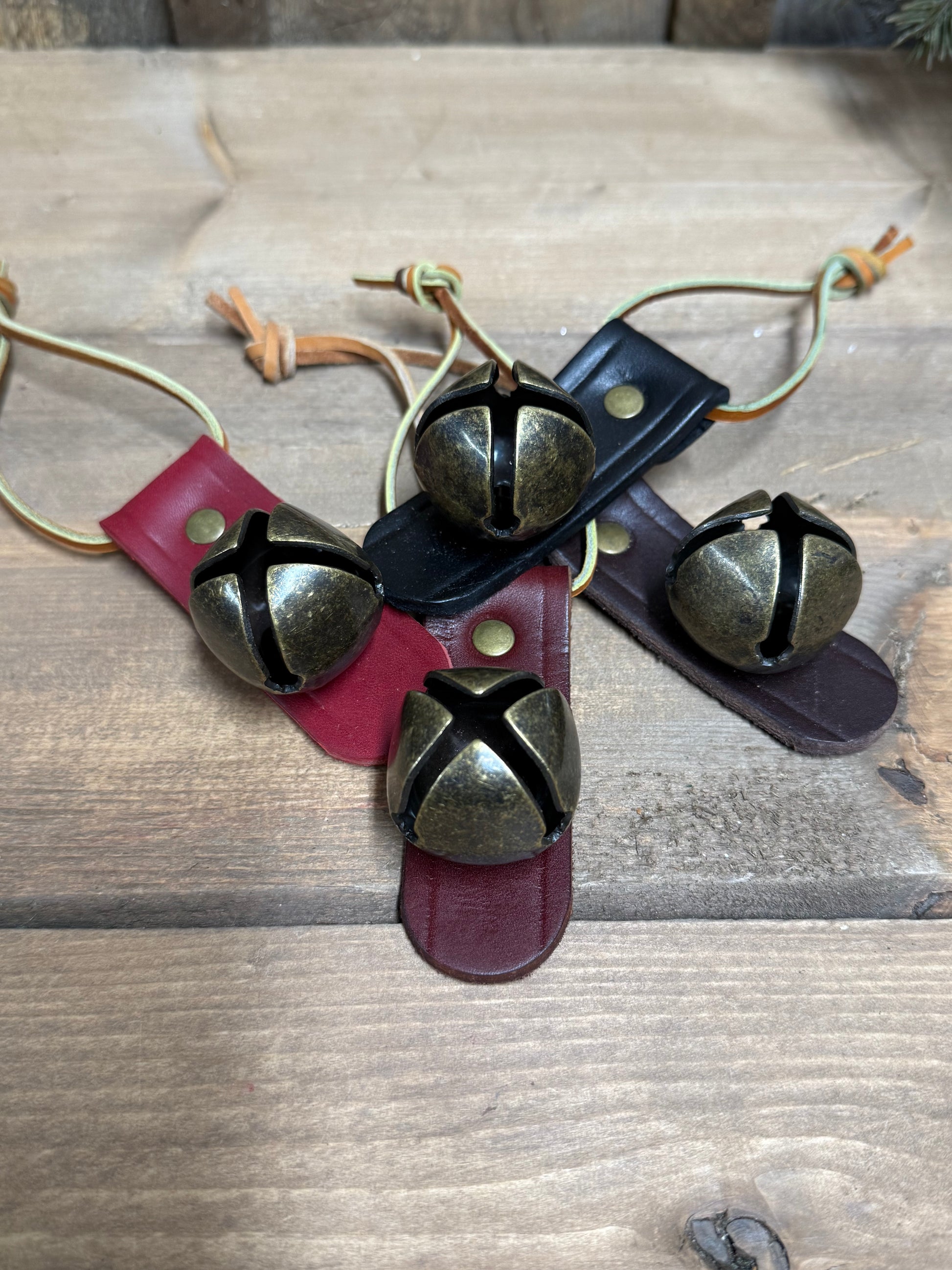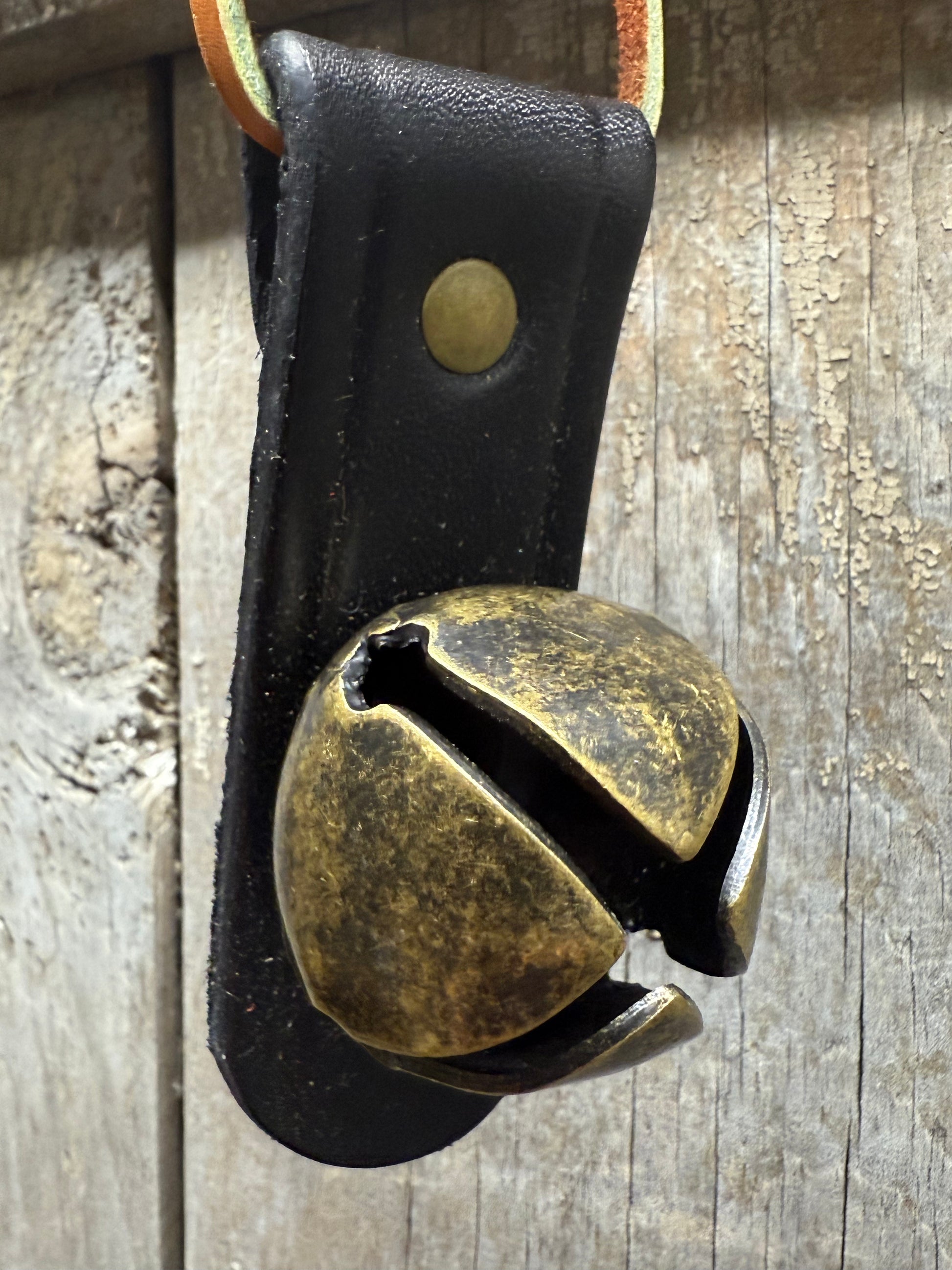 Pennsylvania made and beautiful! The combination of leather strap and antique brass bells is such a lovely addition your holiday decorations or all year long. Strap is 3.5" long including raw hide hanger.