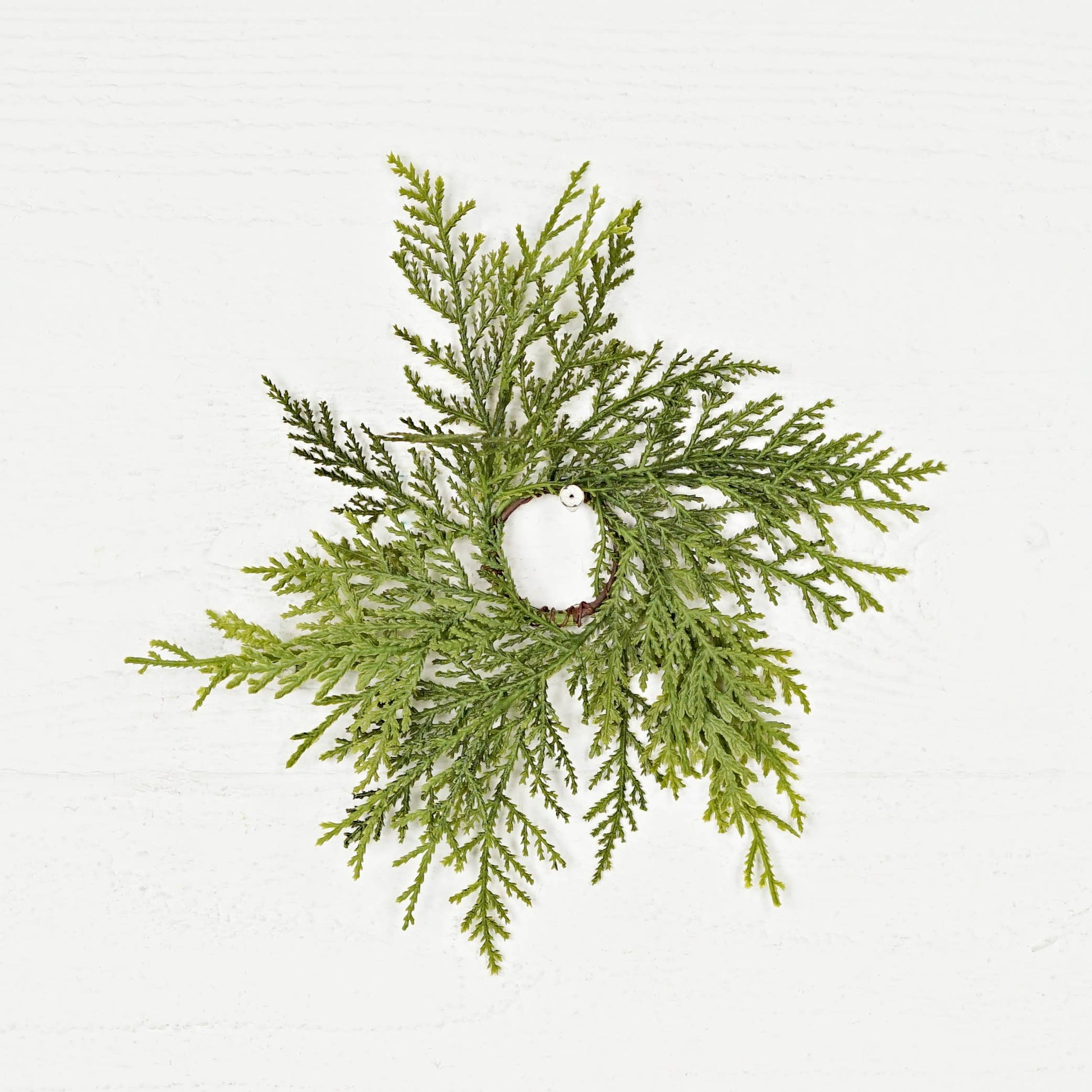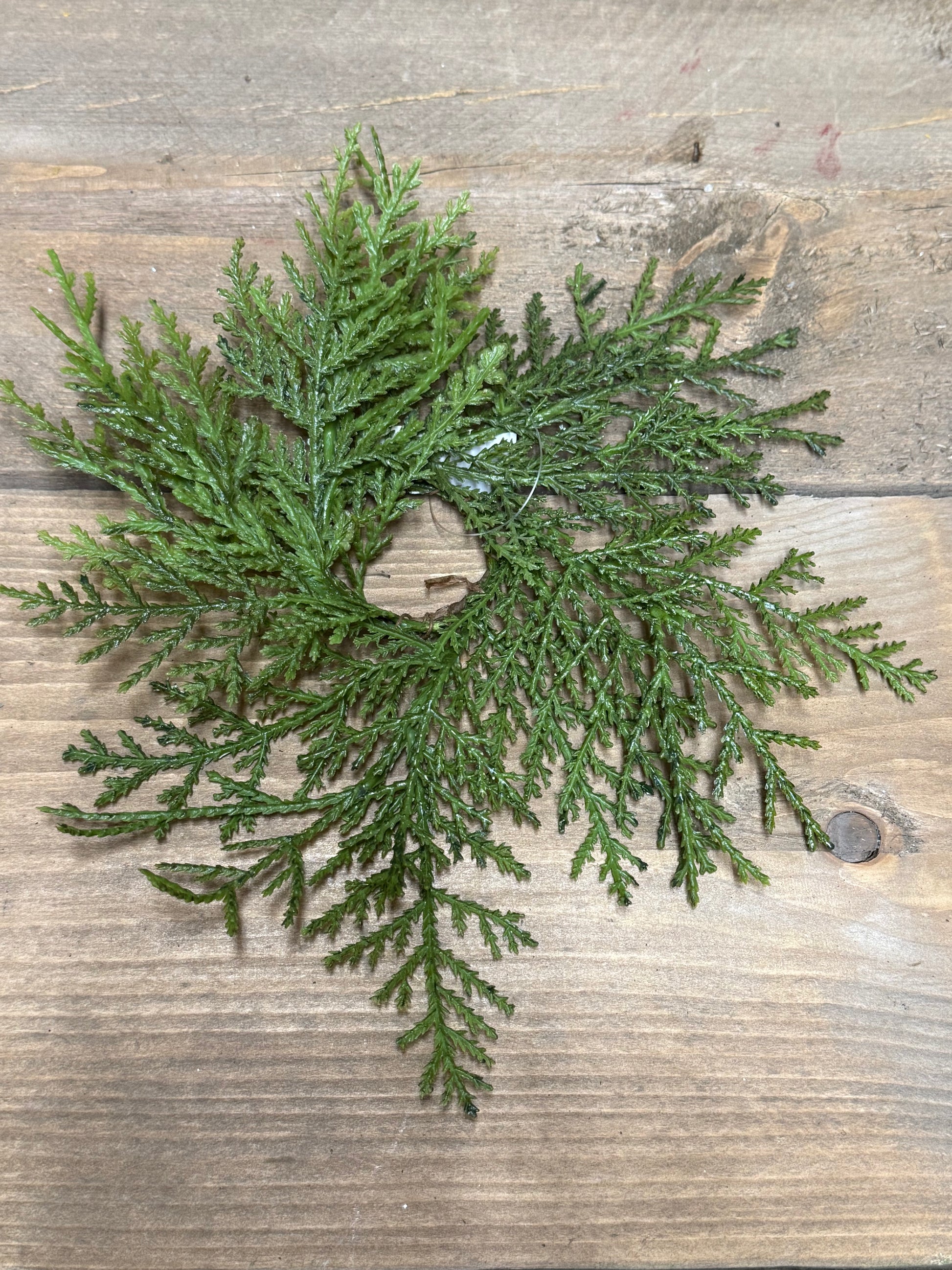 Perfect for Taper candles and chandeliers. A less "bulky" cedar ring that lasts all season long. Inner ring measures 1.5"; about 6" overall. Also shown with the 5’ Garland.