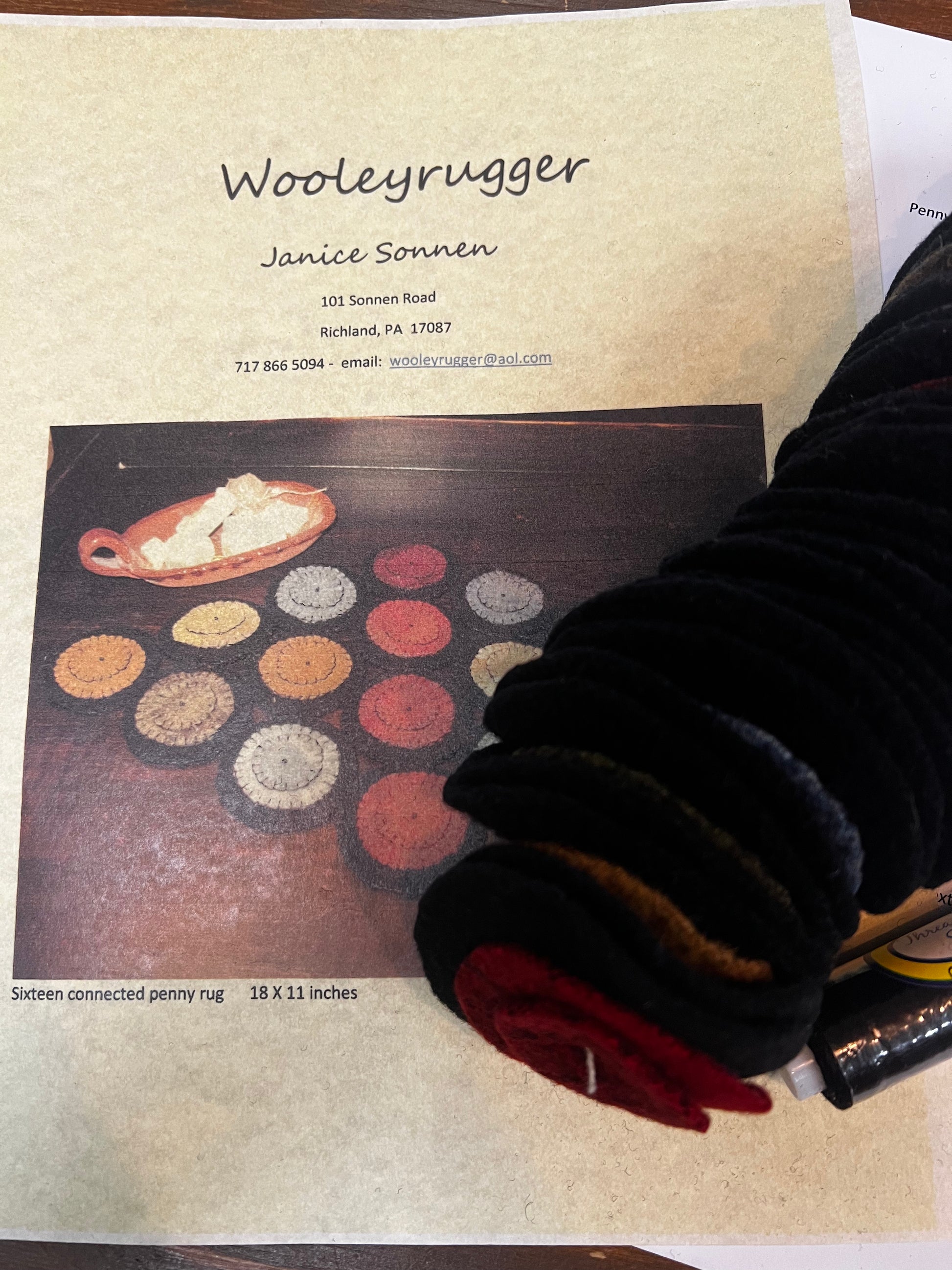 You will receive pre cut wool and shapes to complete this adorable wool candle mat. Instructions included for stitches. Includes both Black and accent gold Perle cotton. Designed by Janice Sonnen