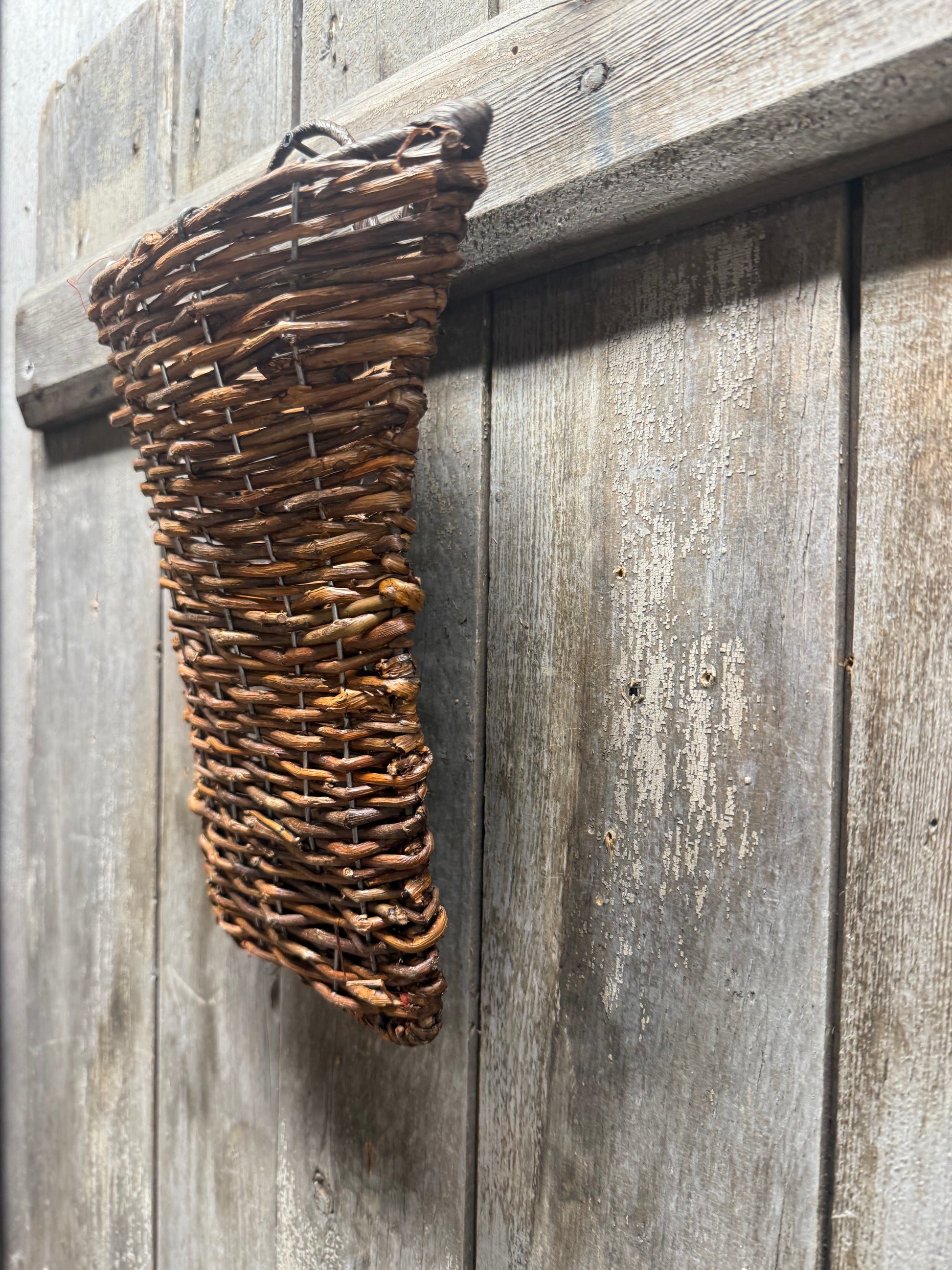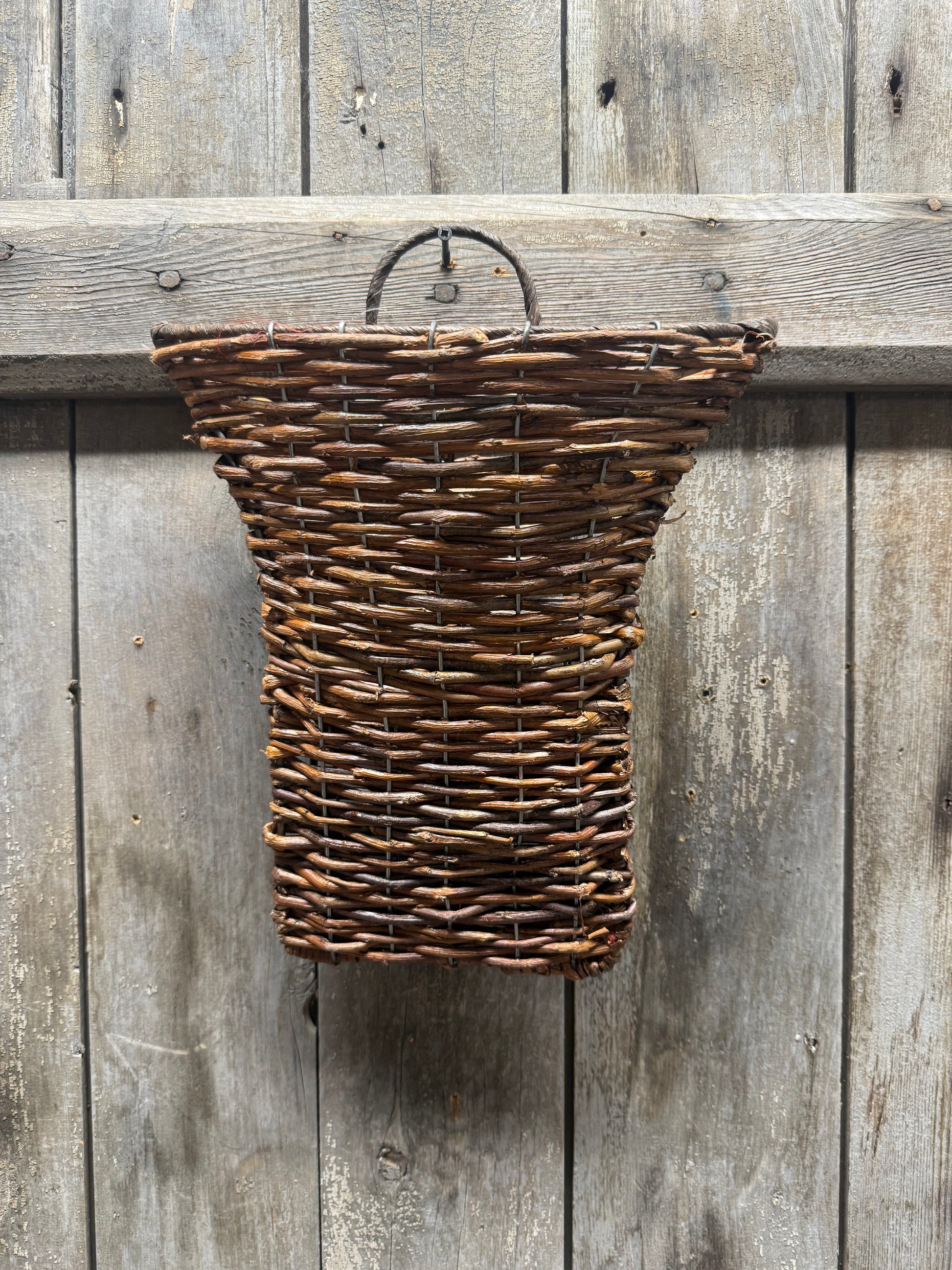 Perfect for between doors and anywhere you need a basket without the bulk. This woven willow basket has a bit of a curvy to the front and measures 10" tall without the hanger. It is 9" wide and only 3" deep. The perfect beginning for a dazzling floral display. Work on cabinets, peg racks and interior doors as well.