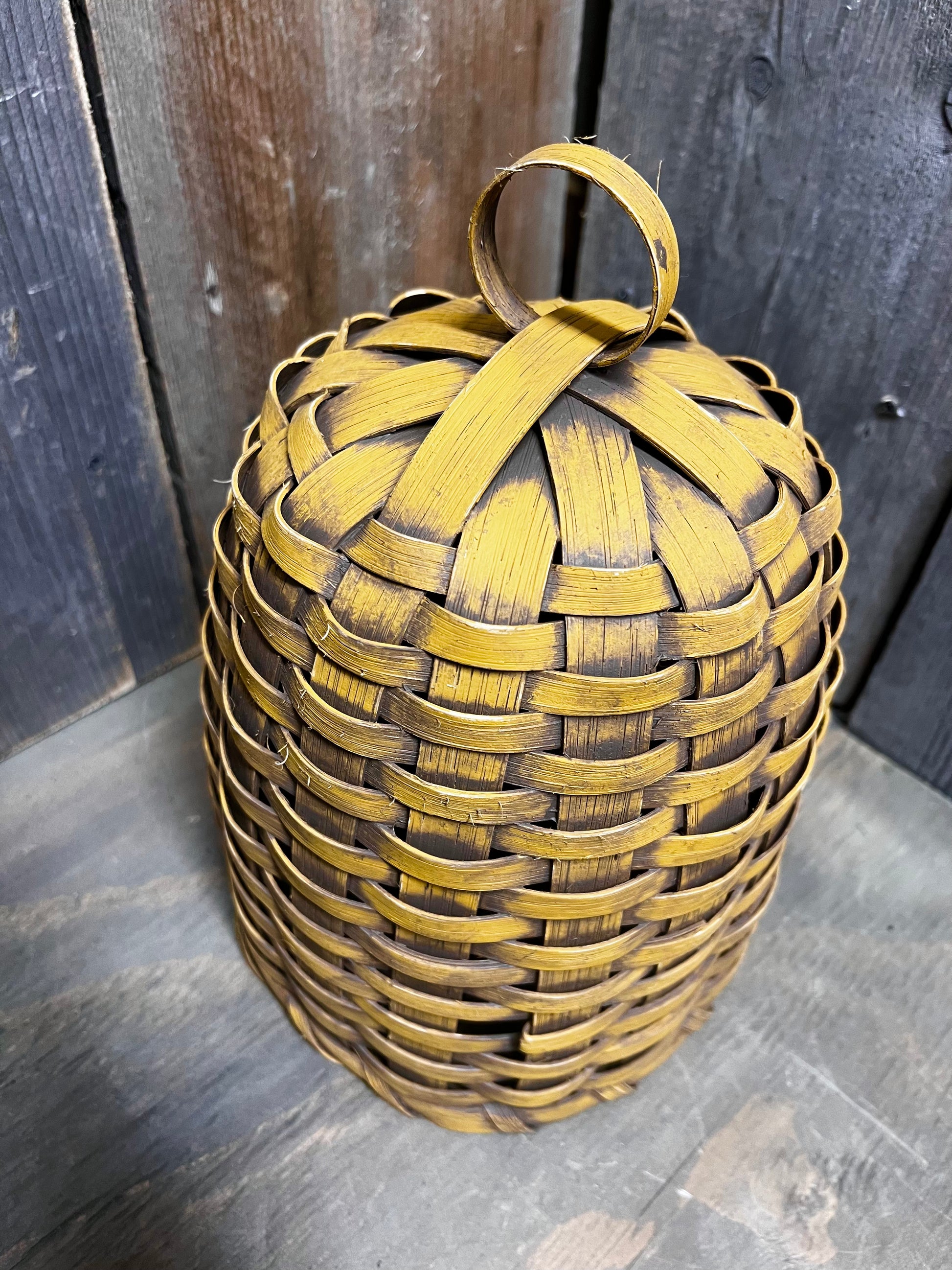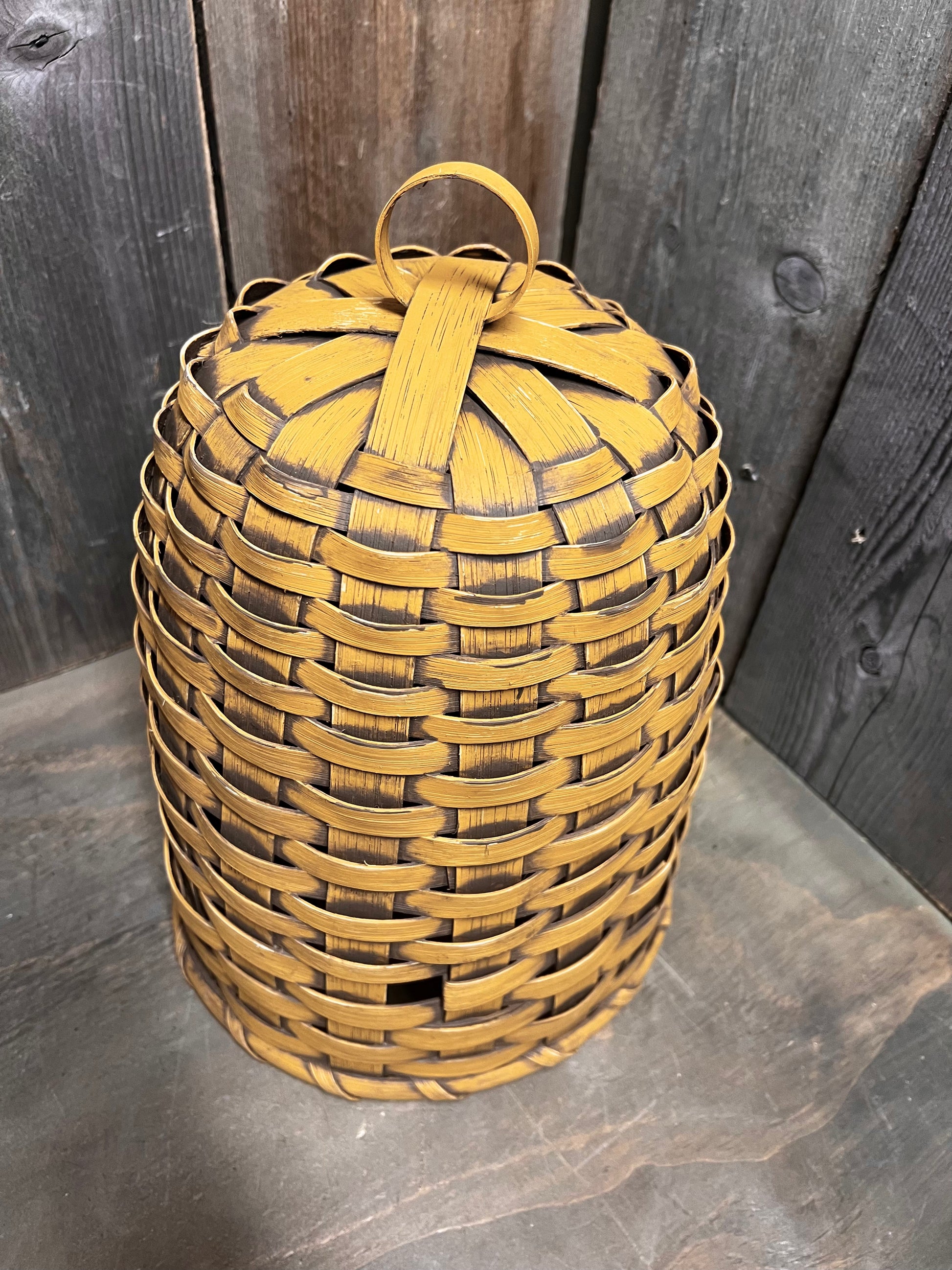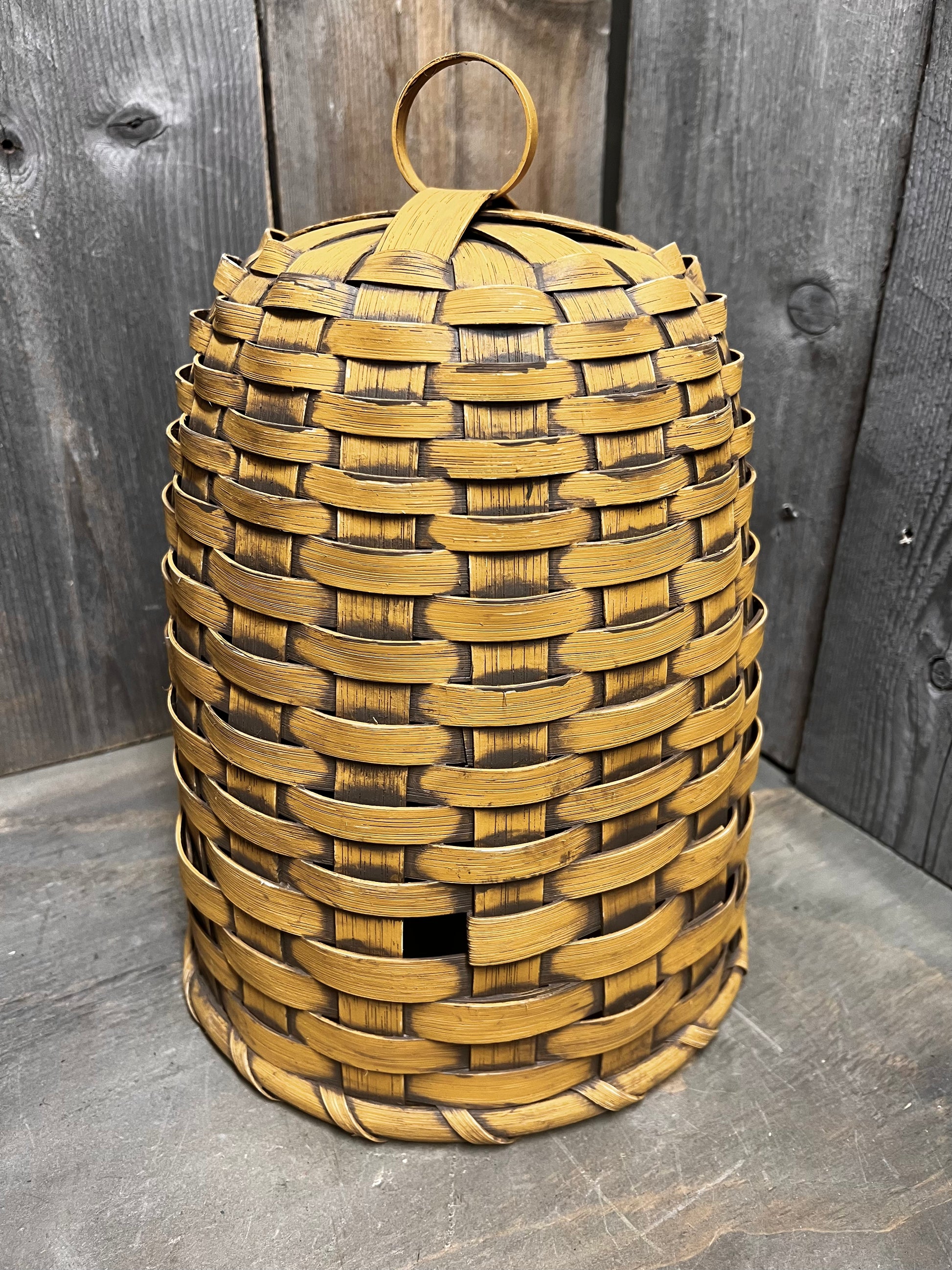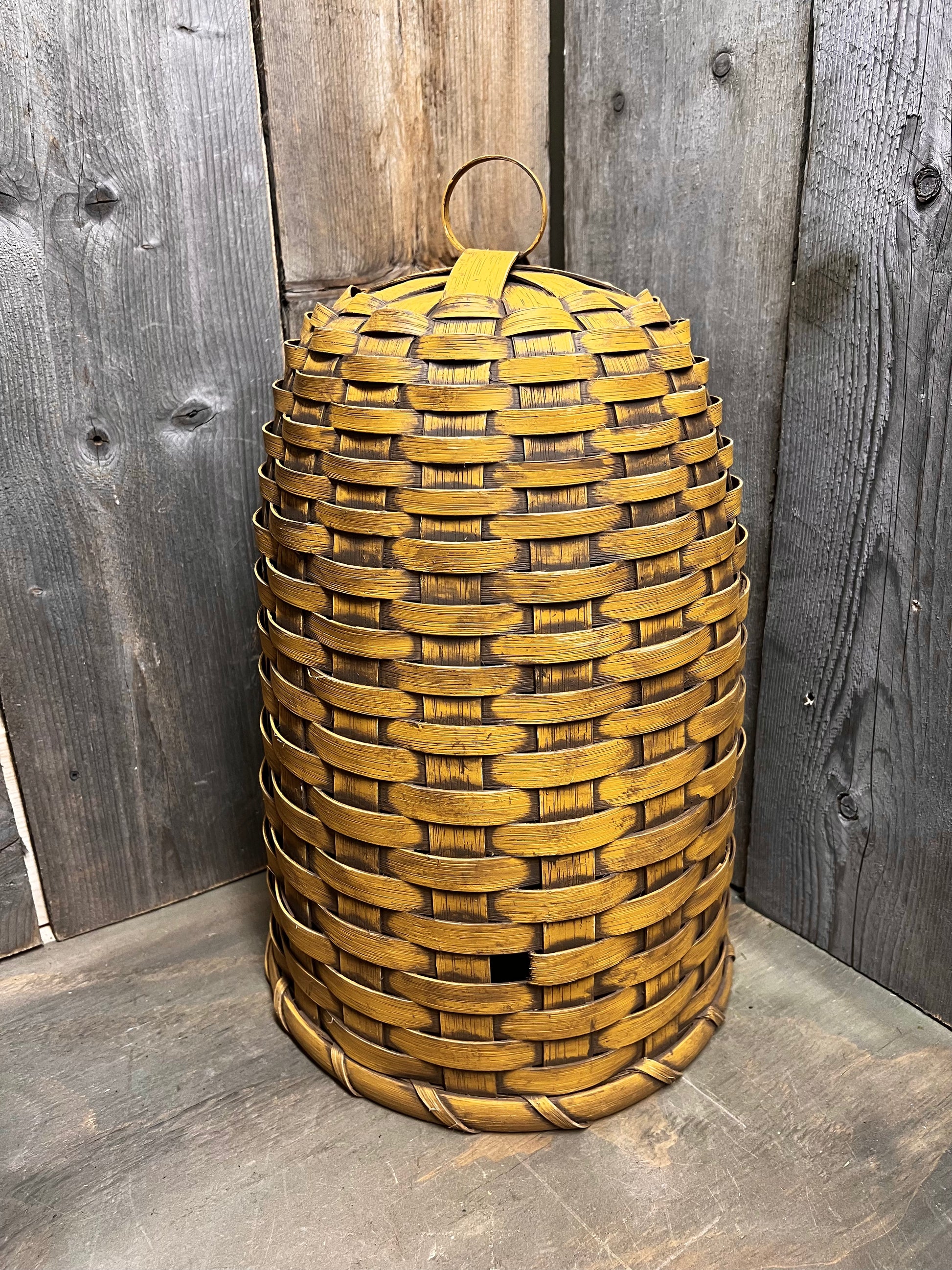 Handmade in PA, the Bee Skep sure will make you smile! Woven in a classic basketweave style, the skep then undergoes a 3 step painting process making the "basket" not only beautiful but sturdy, too! Please remember each one is made by hand and will vary slightly in both size and finish. Also the last coat of paint it wiped off to give the amazing look and some of the original natural reed color may peak through. This is not a flaw. There is a small "Bee Door" on one side. Although the bees may love them, we suggest decorative use only. MUSTARD/BROWN color.