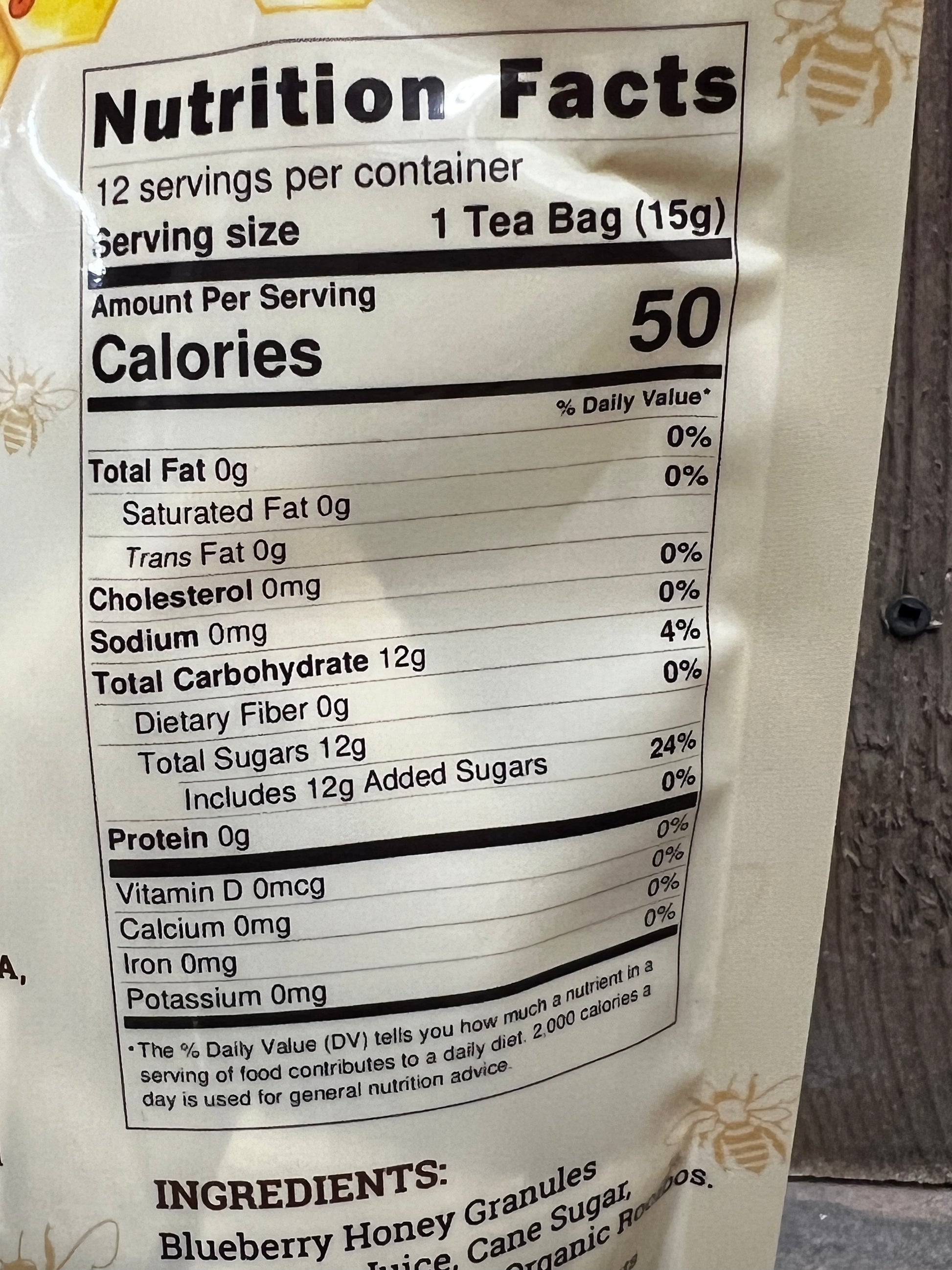 Ingredients: Blueberry Honey Granules (Blueberry Juice, Cane Sugar, Honey, Citric Acid), Organic Rooibos