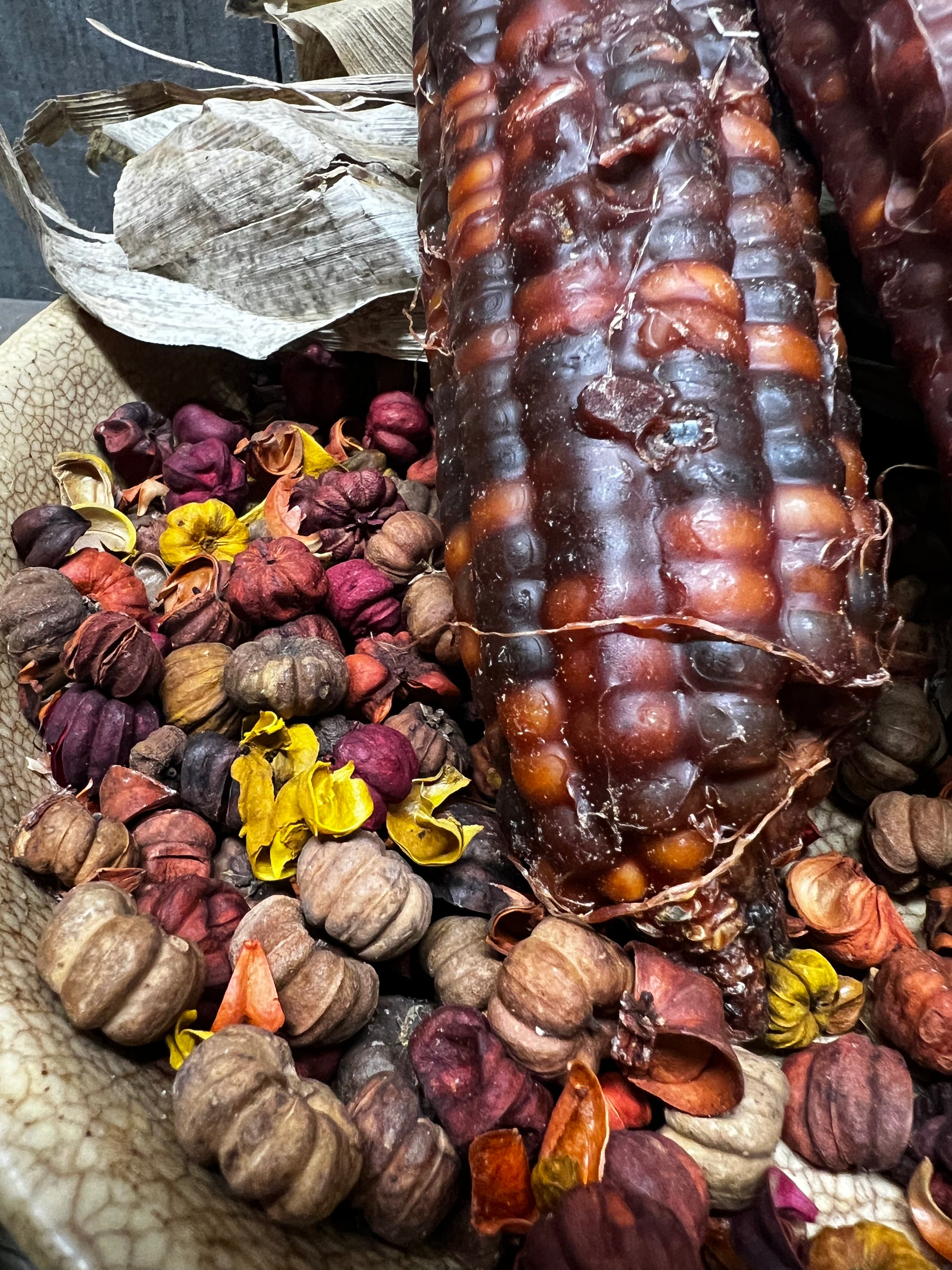 Oh how perfect! Our field corn is waxed and comes in a colorful bed of dried pods. Please expect variations in size and color. You may not receive the exact one shown.