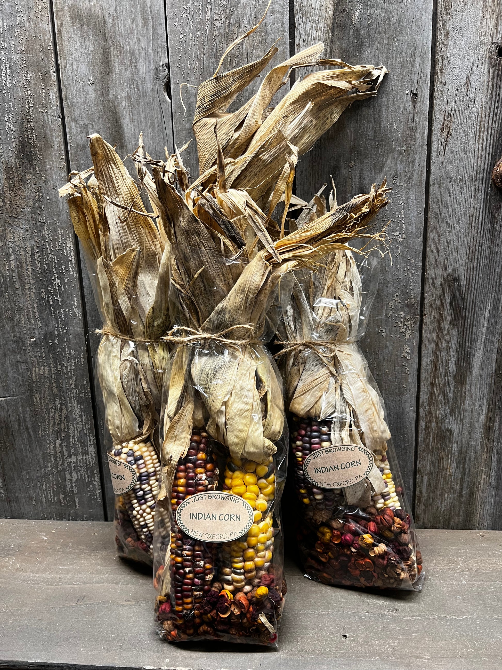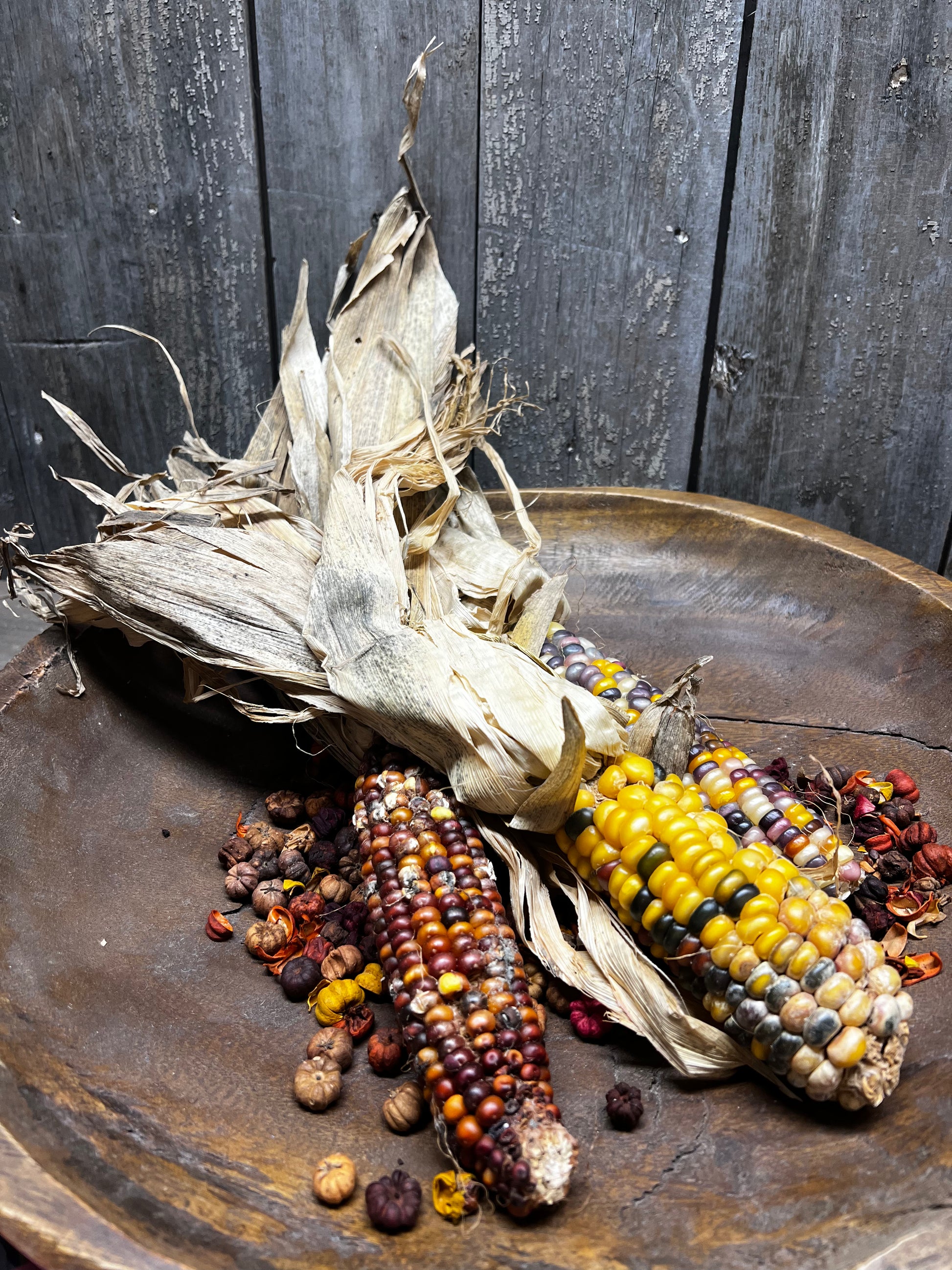Oh the colors of Autumn! A lovely 3 pack of dried Indian corn, in assorted colors and dried putka pods, make for a lovely display. Please note that colors of corn and sizes will vary. This is a naturally grown and dried product.