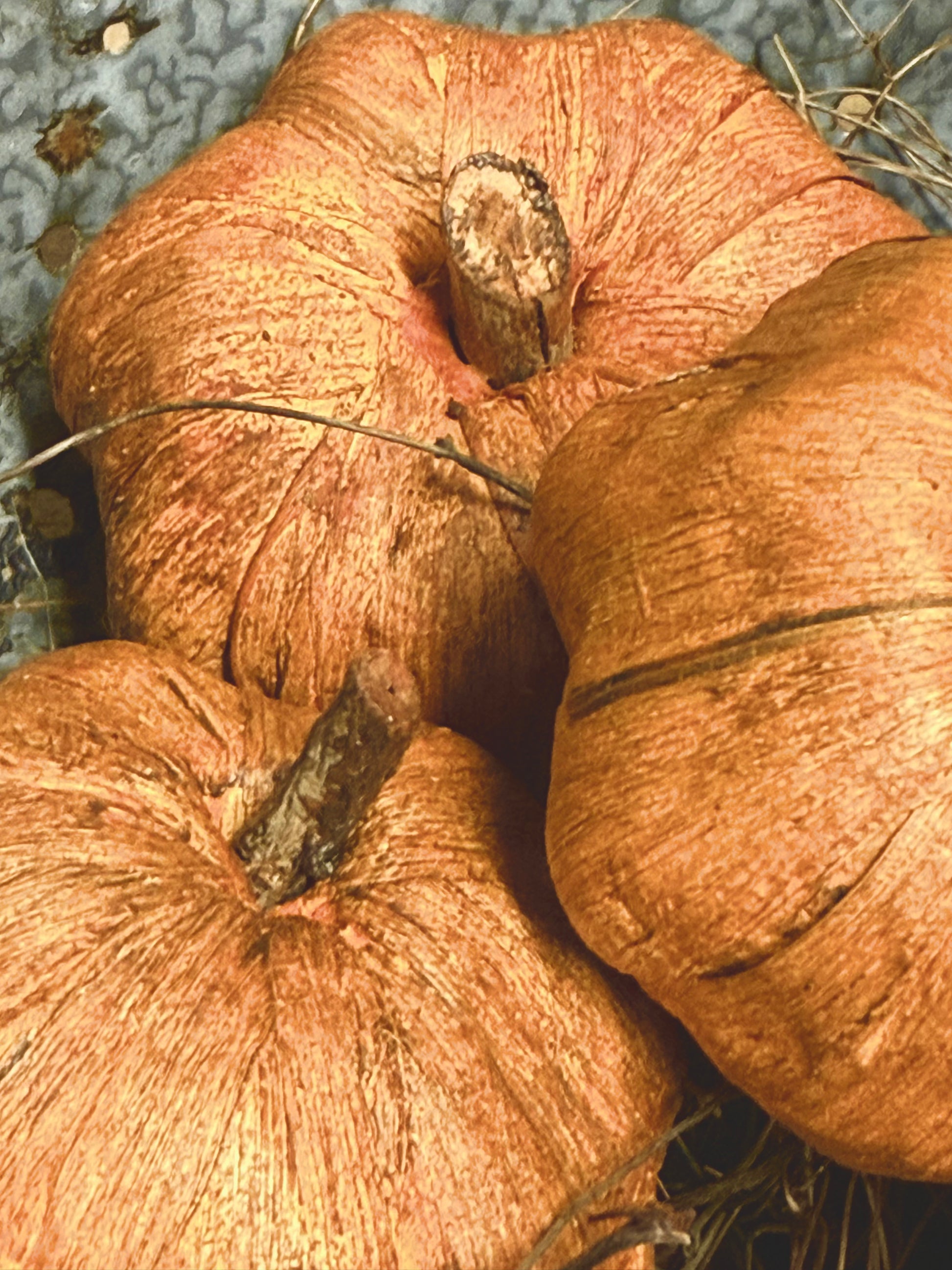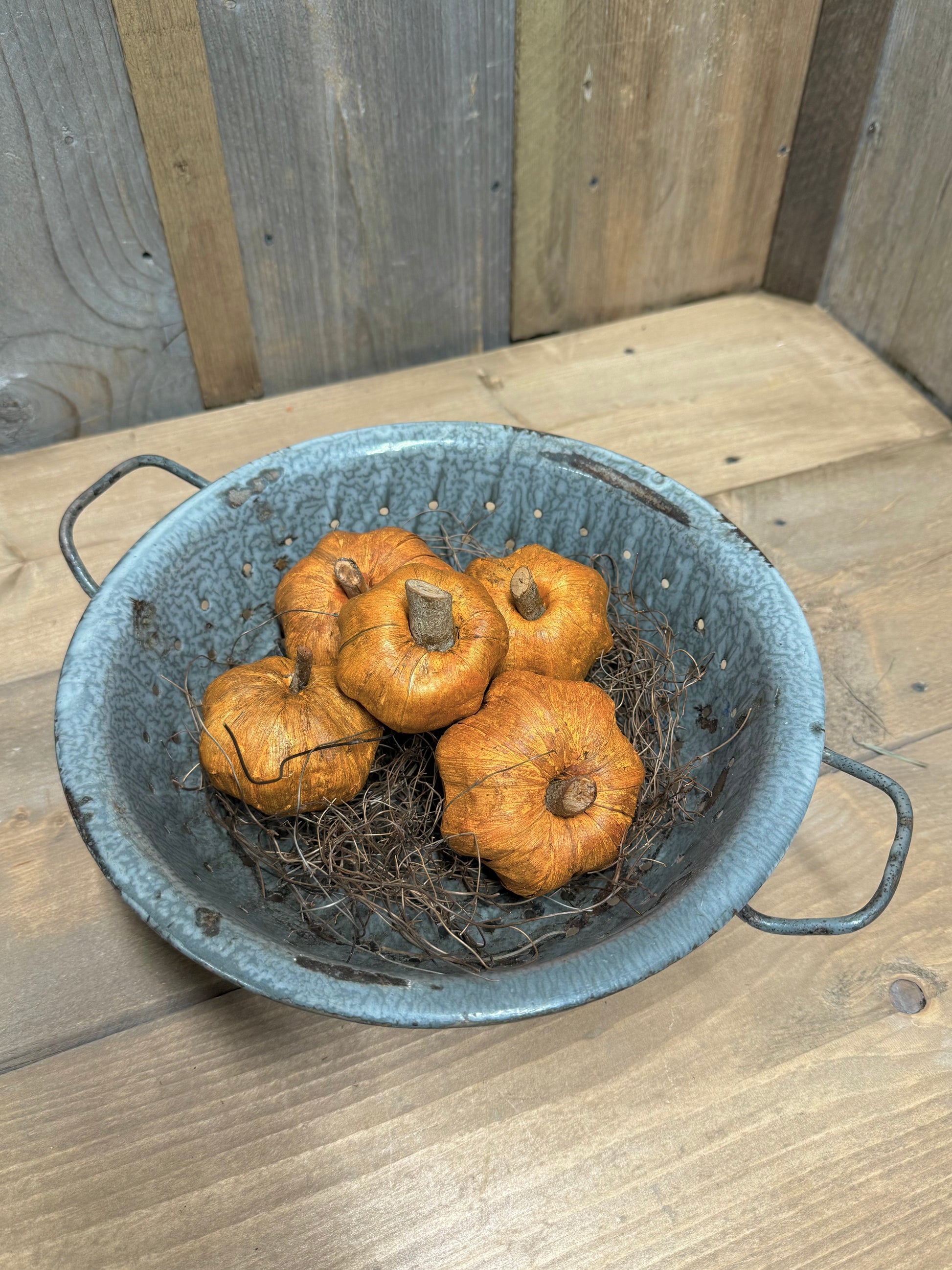 Pumpkins never looked so good! Corn Husk wrapped Pumpkin forms and a twig stem rest on a bed of angel vine. Stained for a distressed look. You will receive a set of 2 Large 3" pumpkins and 3 Small 2.25" pumpkins. ****Color may show differently on your screens/monitor. These are a traditional pumpkin color with a brown stain over it.