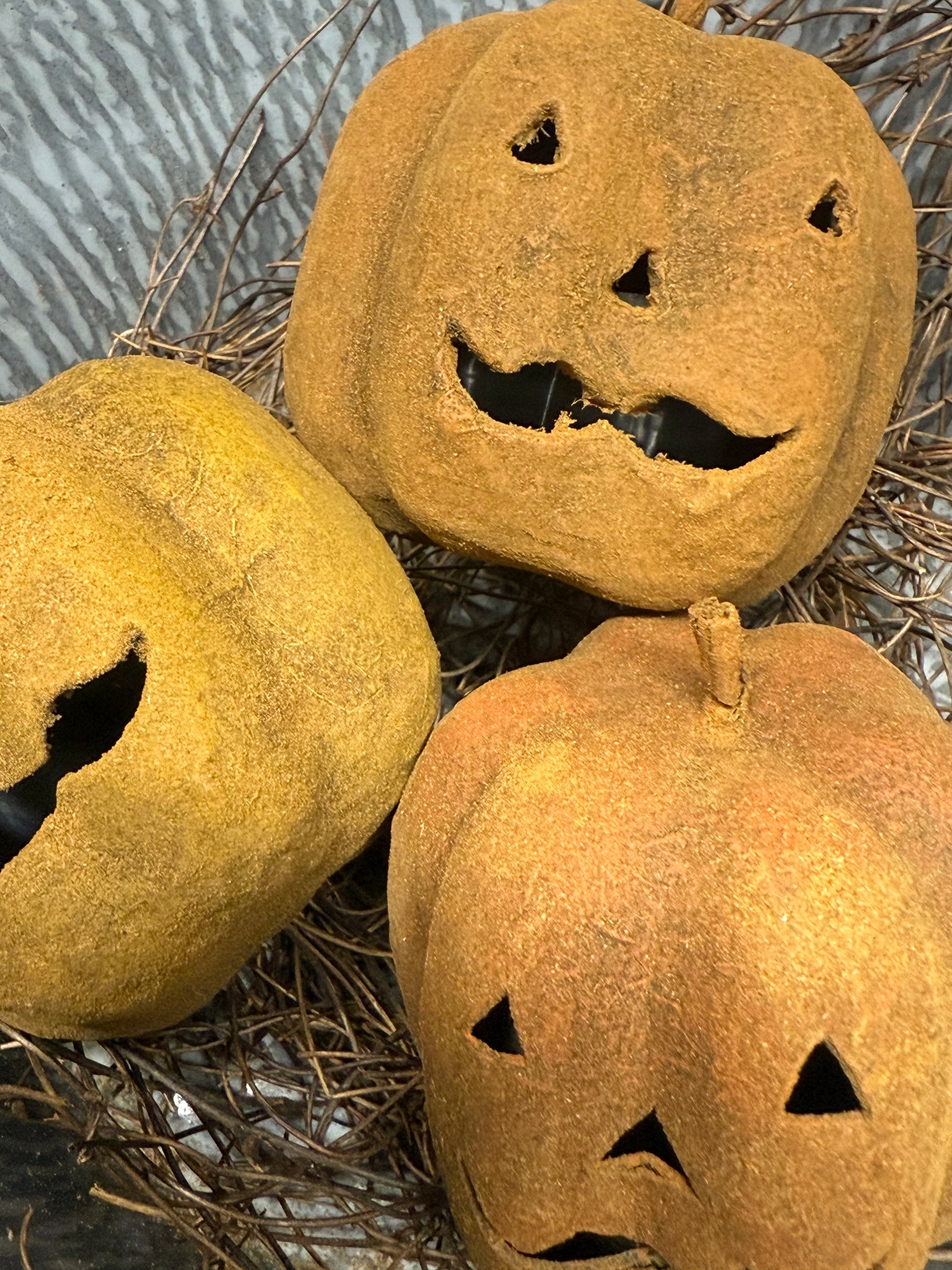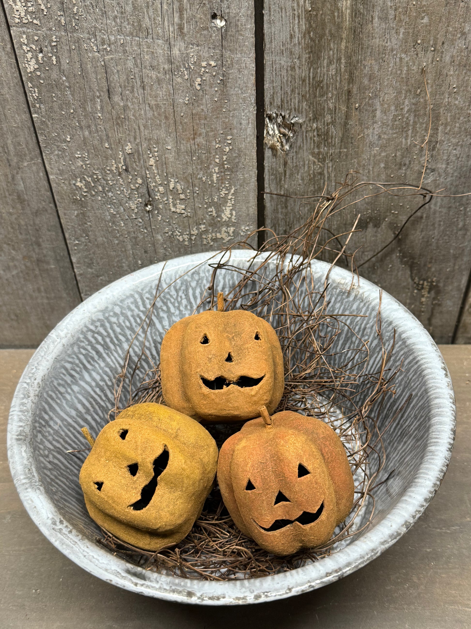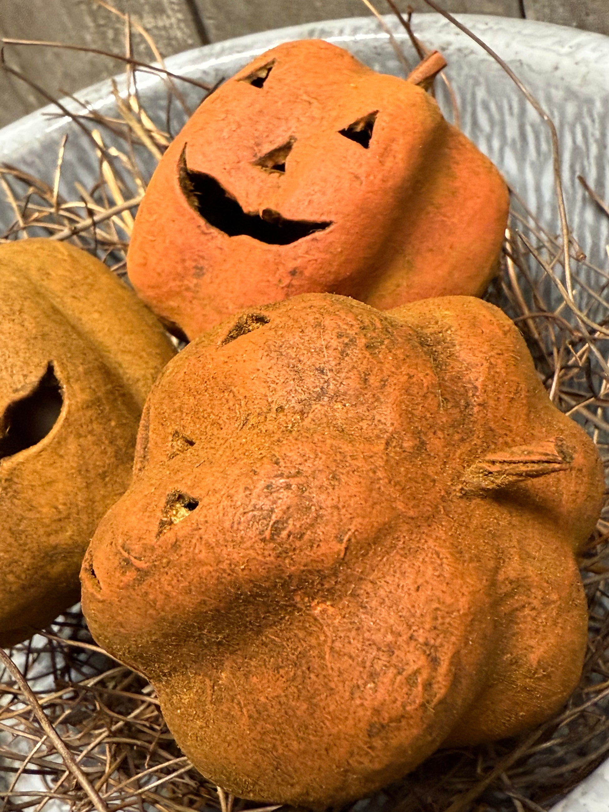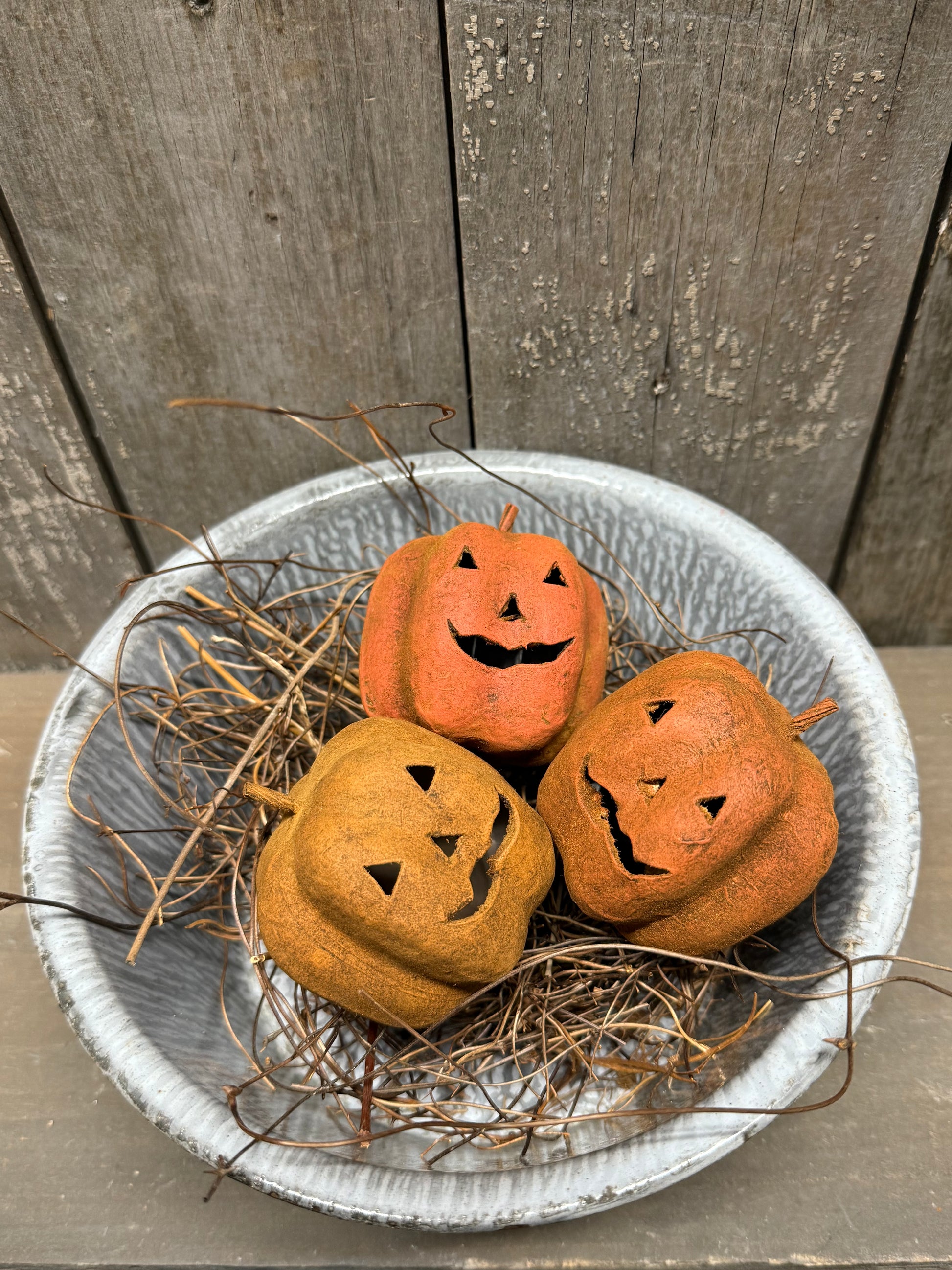 Oh how primitive! Our paper mache Jack O' Lanterns come with a bed of angel hair and work great in bowls, baskets and trenchers. Each pumpkin is about 2.75" wide and painted in shades of Orange or all Black. The Original is a darker mix of of orange and mustard. We then wax them with black beeswax, buff them a bit and finish with a dusting of cinnamon. You will receive 3 Jacks and angel hair. NOTE...COLORS ARE SHOWING A BIT BRIGHTER THAN THEY ARE