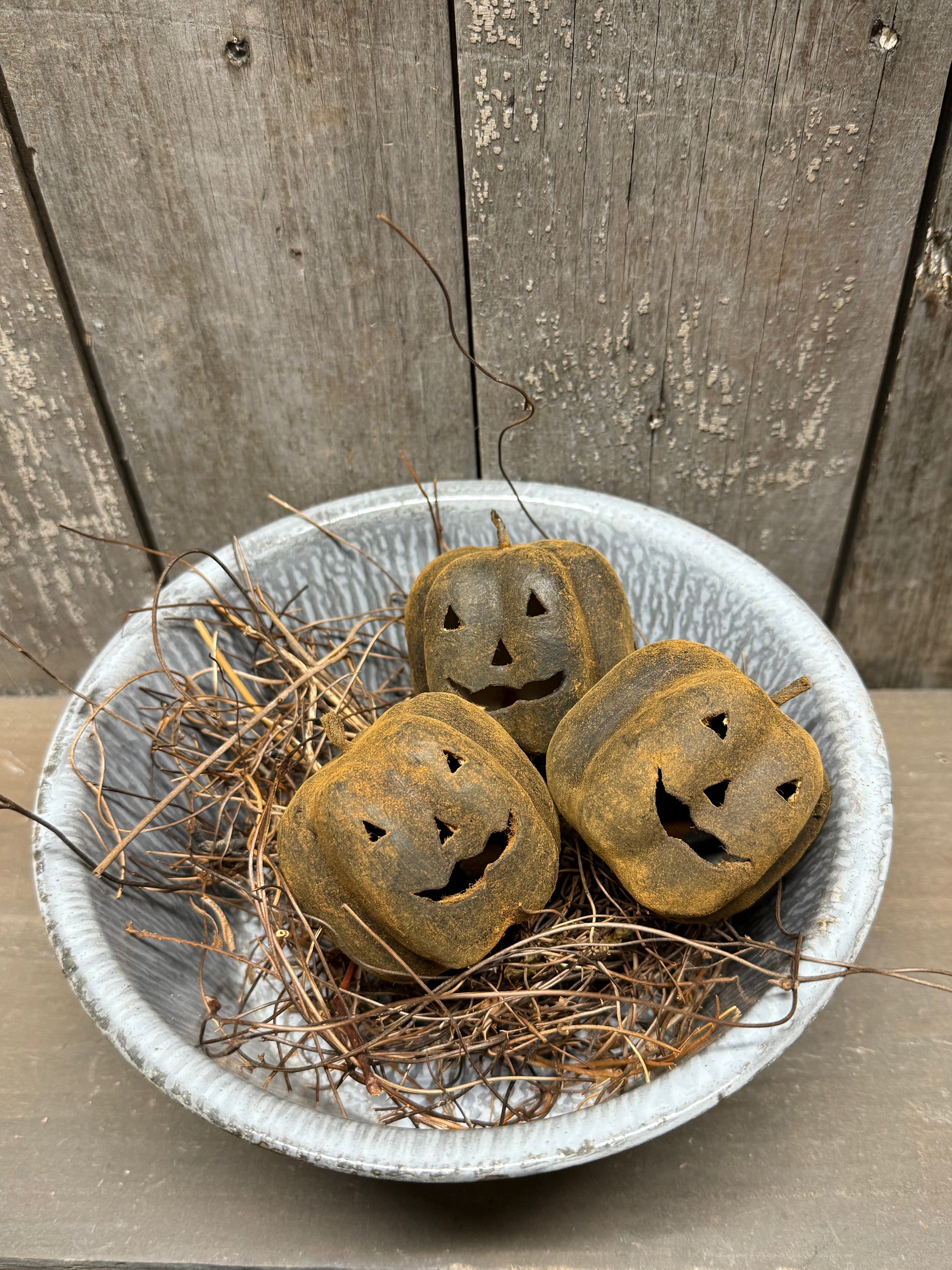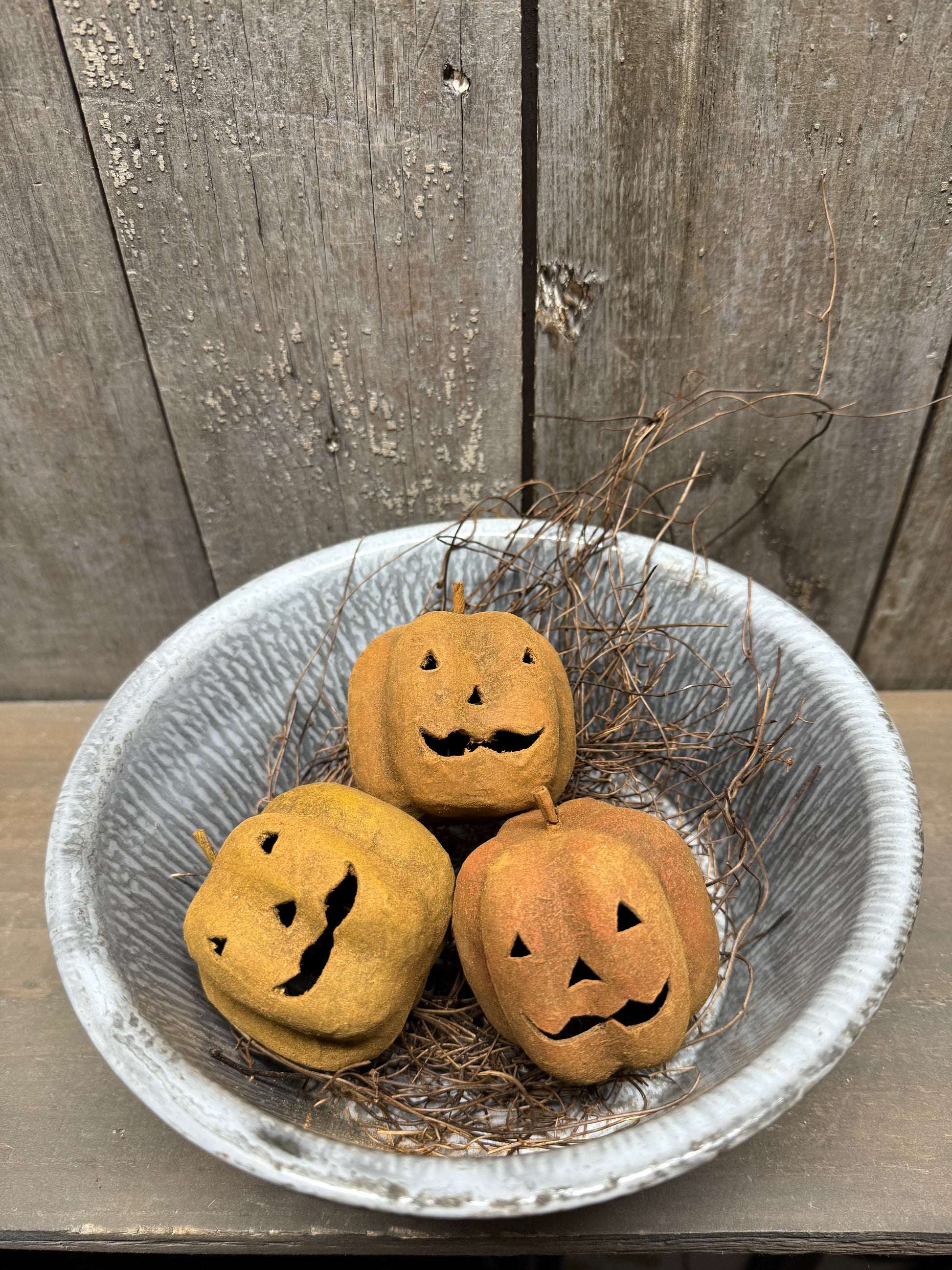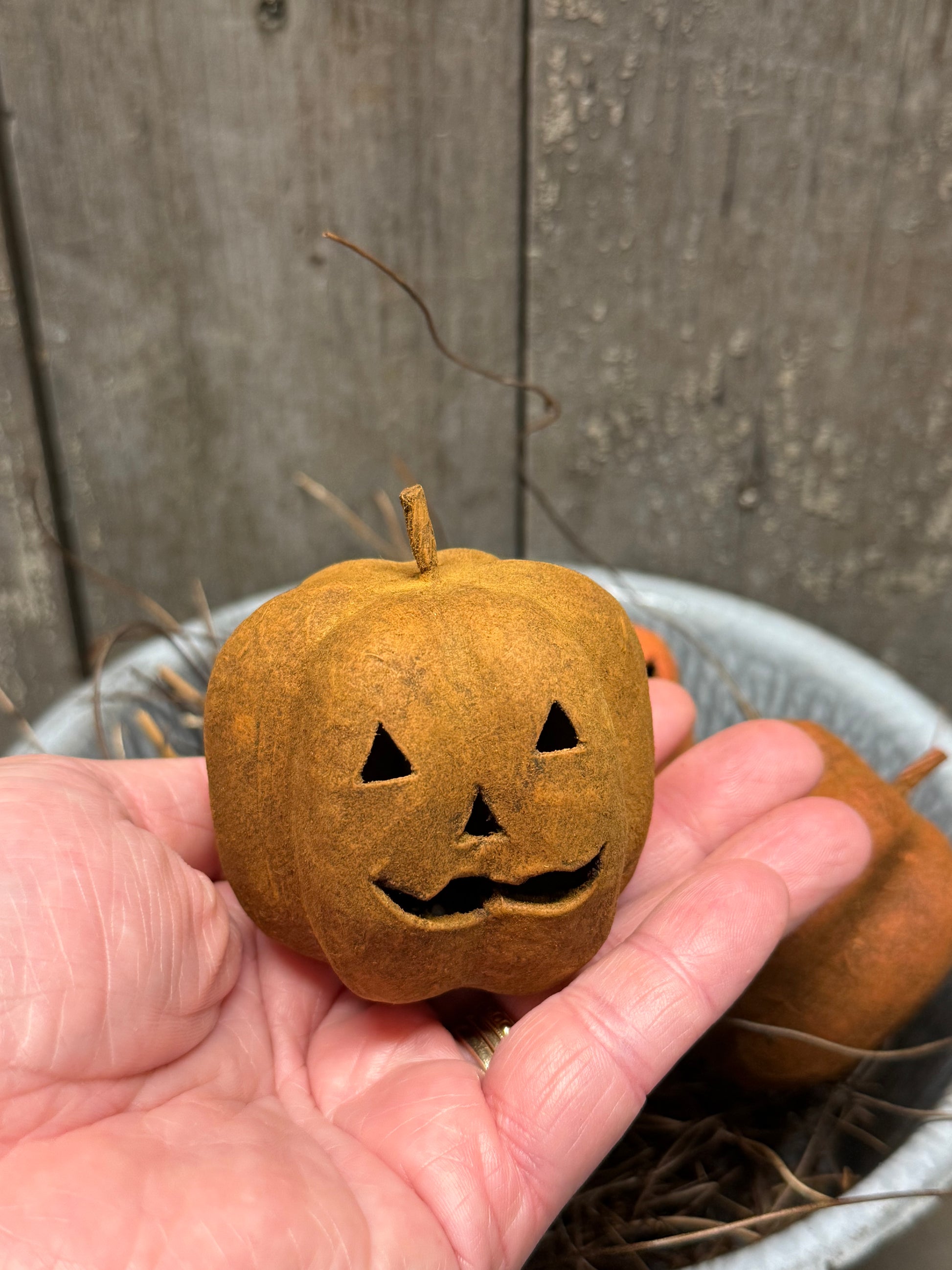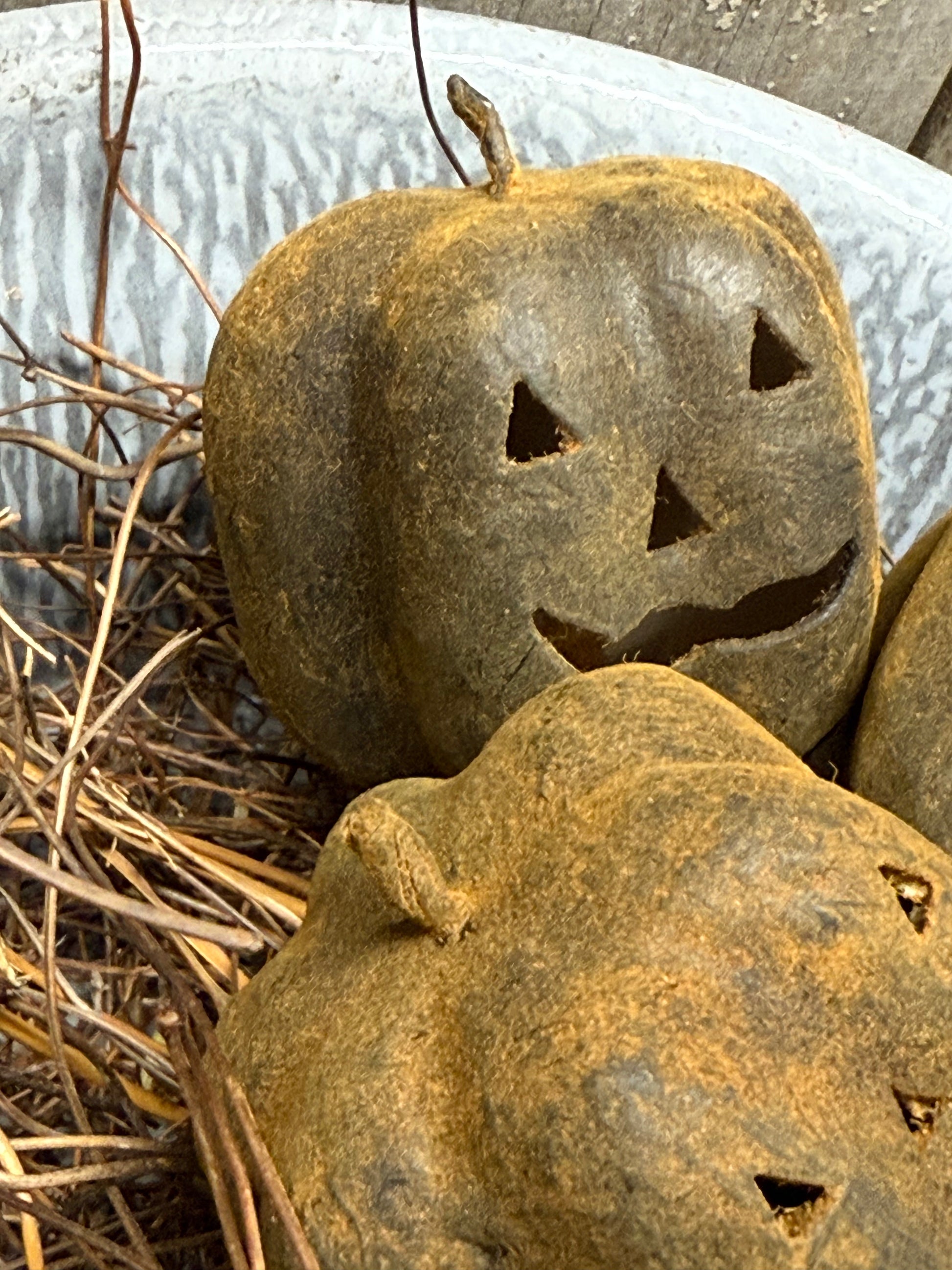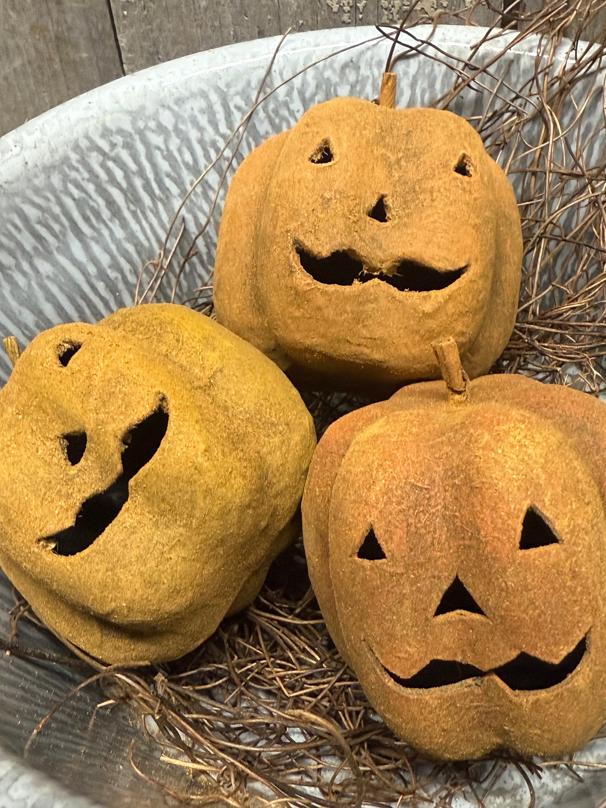 Oh how primitive! Our paper mache Jack O' Lanterns come with a bed of angel hair and work great in bowls, baskets and trenchers. Each pumpkin is about 2.75" wide and painted in shades of Orange or all Black. The Original is a darker mix of of orange and mustard. We then wax them with black beeswax, buff them a bit and finish with a dusting of cinnamon. You will receive 3 Jacks and angel hair. NOTE...COLORS ARE SHOWING A BIT BRIGHTER THAN THEY ARE