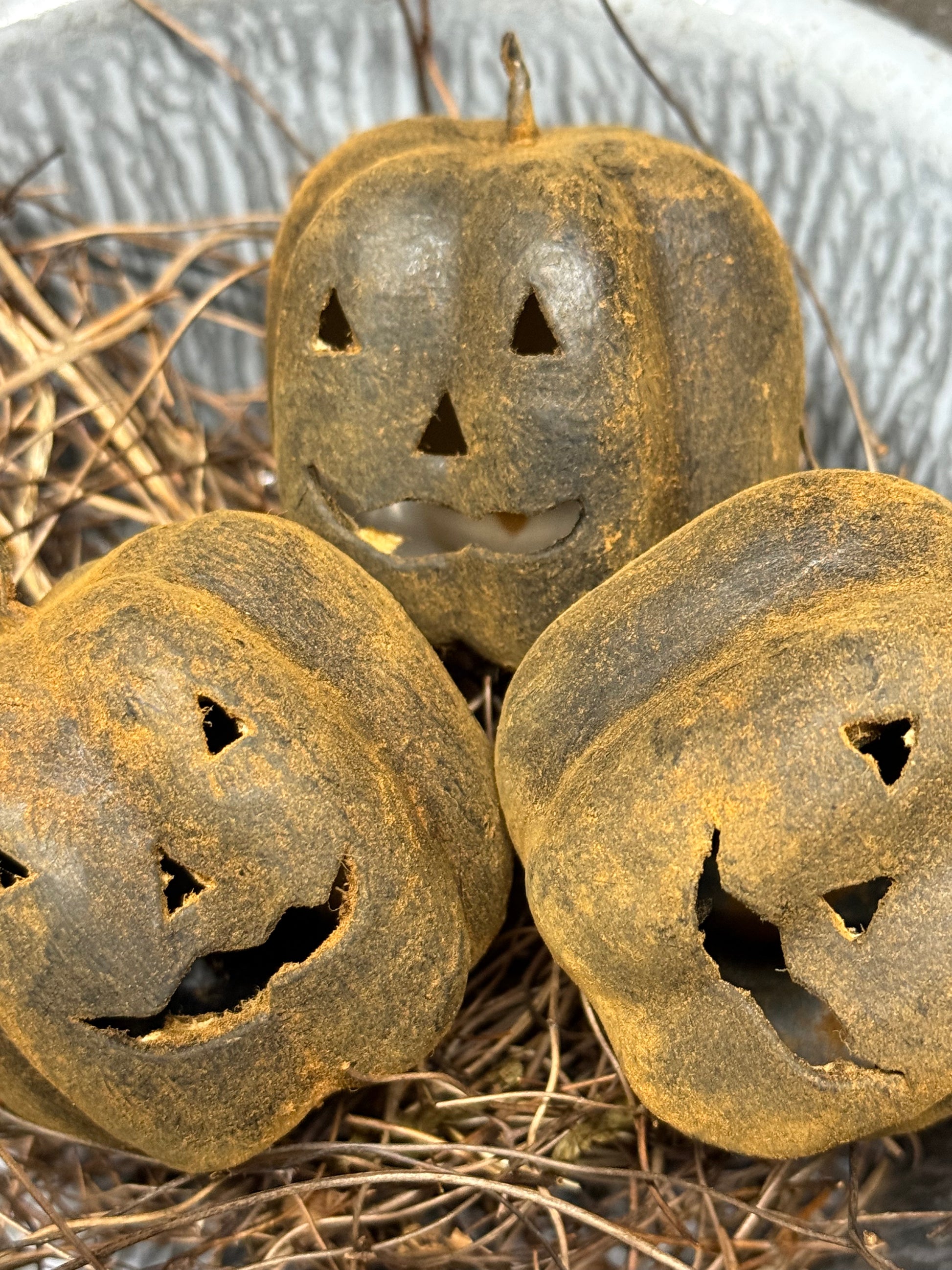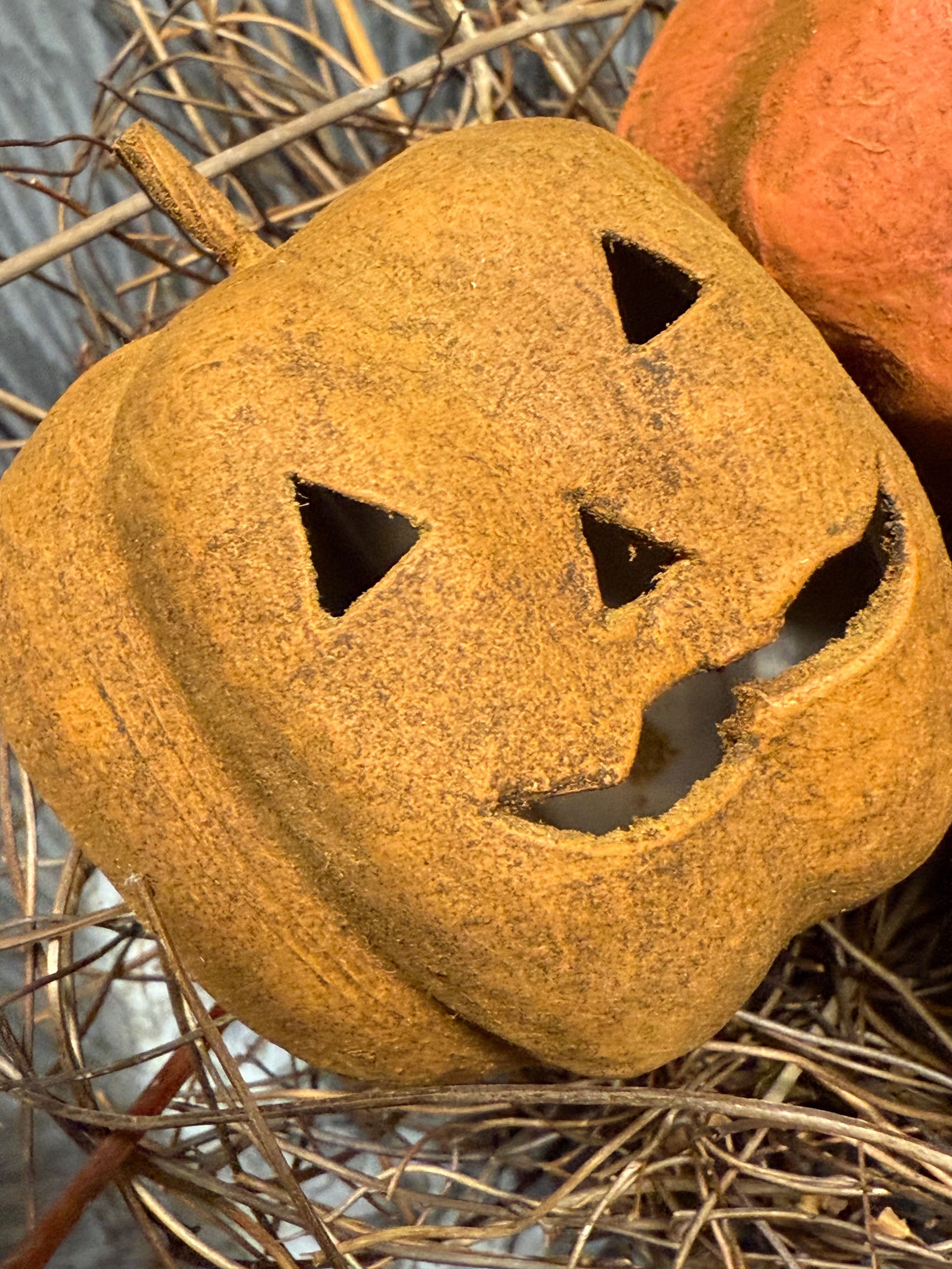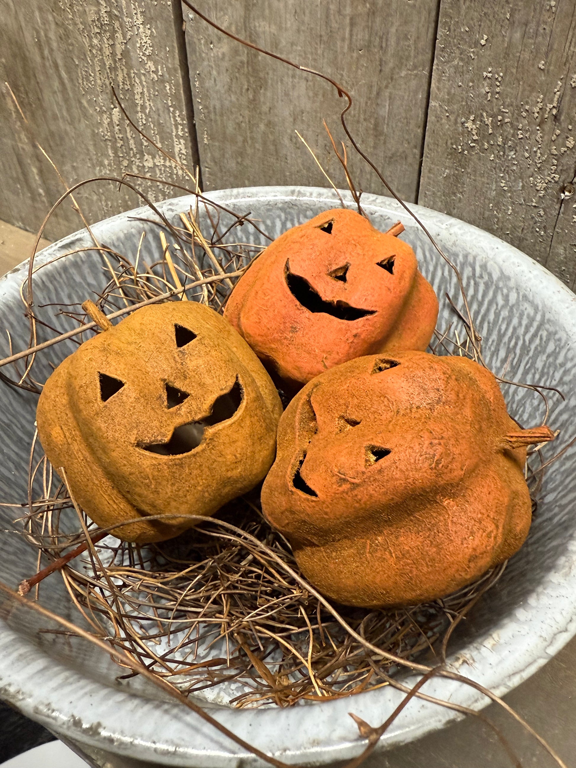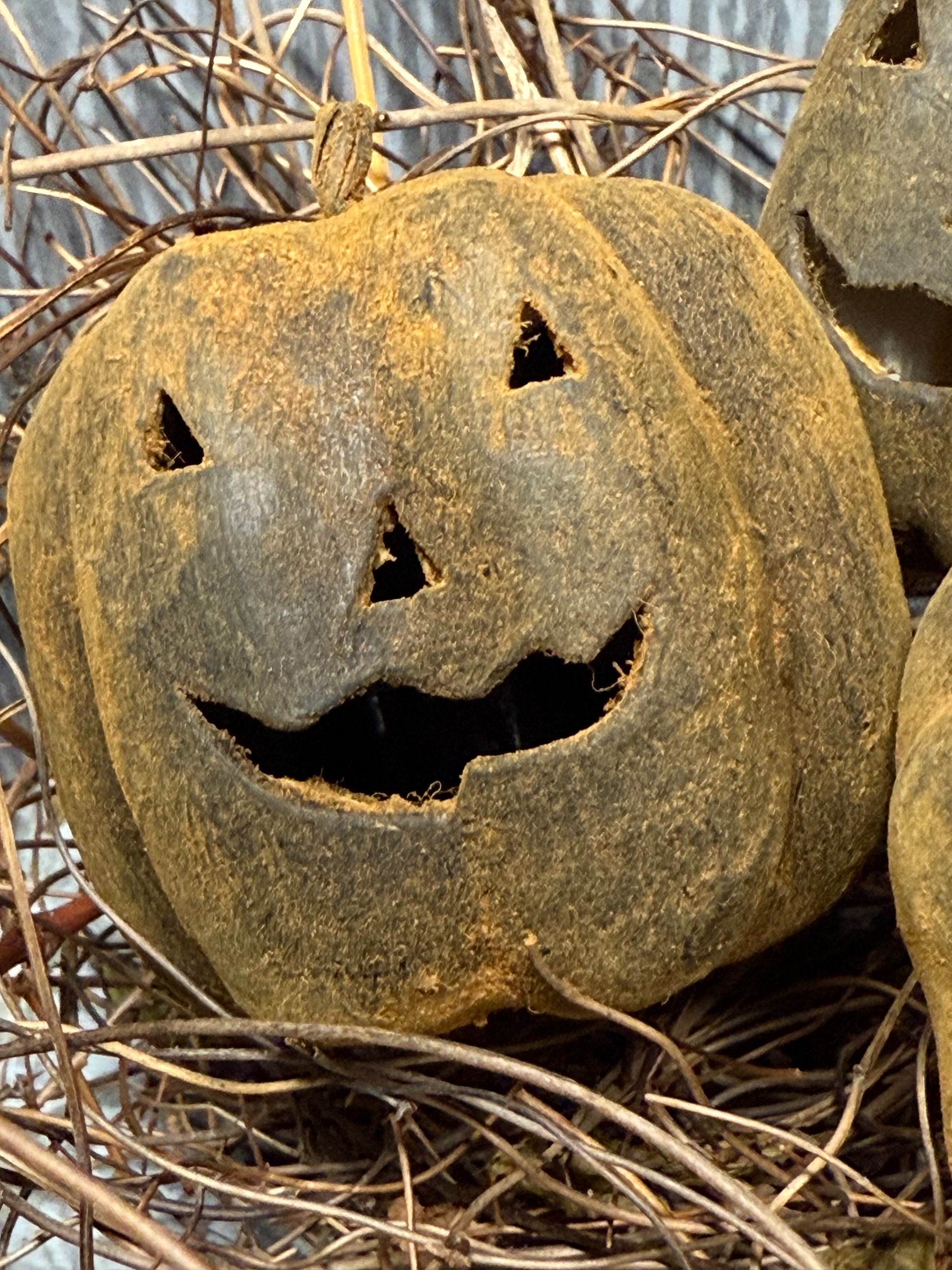 Oh how primitive! Our paper mache Jack O' Lanterns come with a bed of angel hair and work great in bowls, baskets and trenchers. Each pumpkin is about 2.75" wide and painted in shades of Orange or all Black. The Original is a darker mix of of orange and mustard. We then wax them with black beeswax, buff them a bit and finish with a dusting of cinnamon. You will receive 3 Jacks and angel hair. NOTE...COLORS ARE SHOWING A BIT BRIGHTER THAN THEY ARE