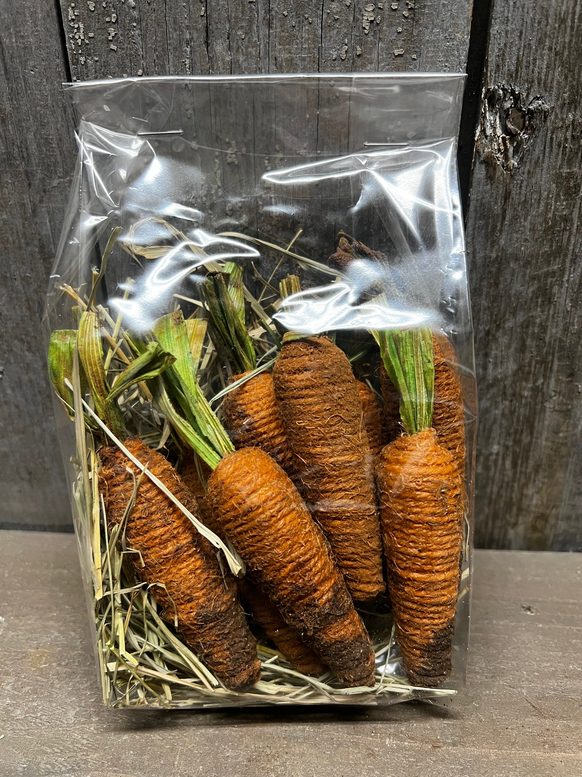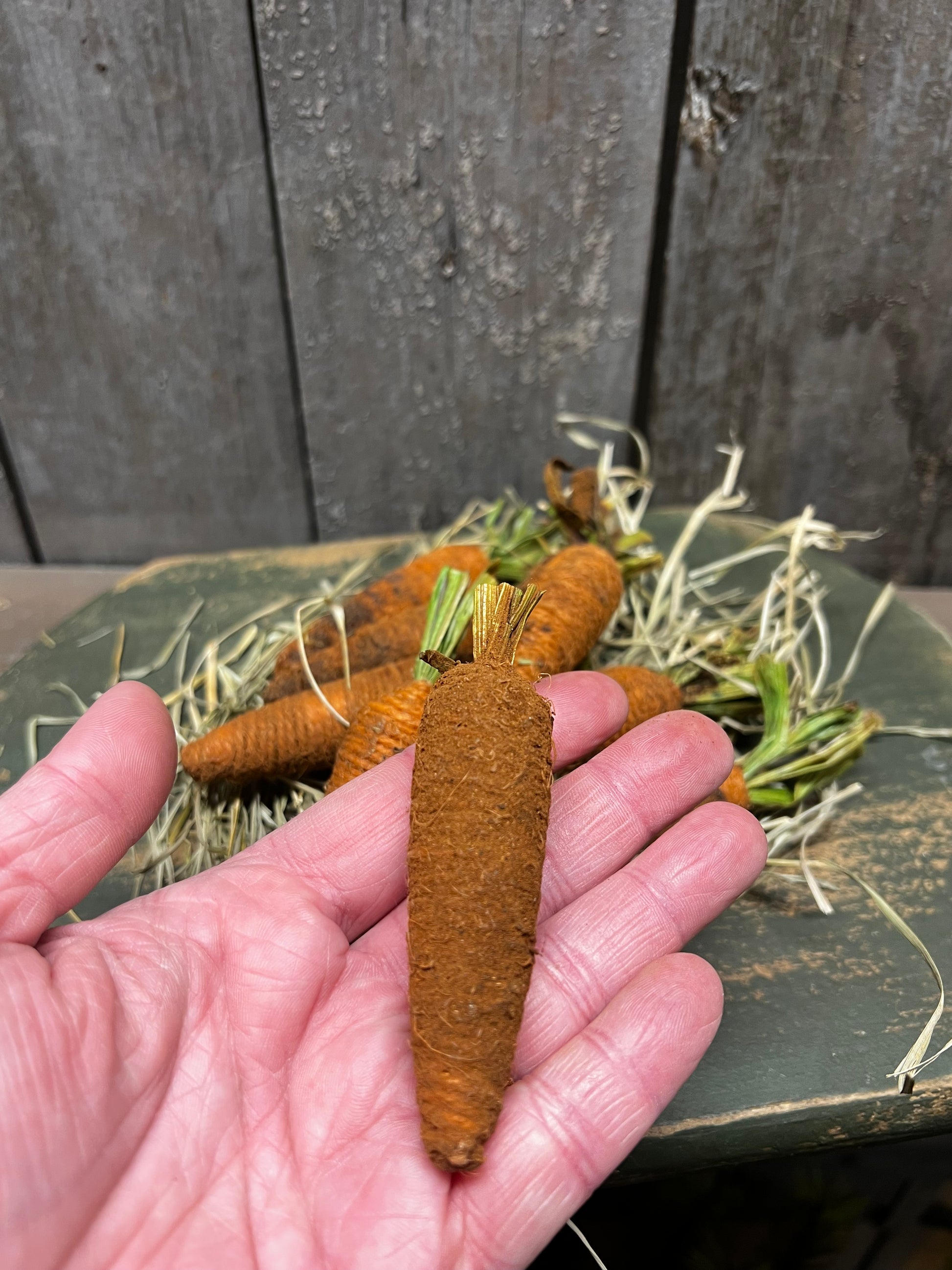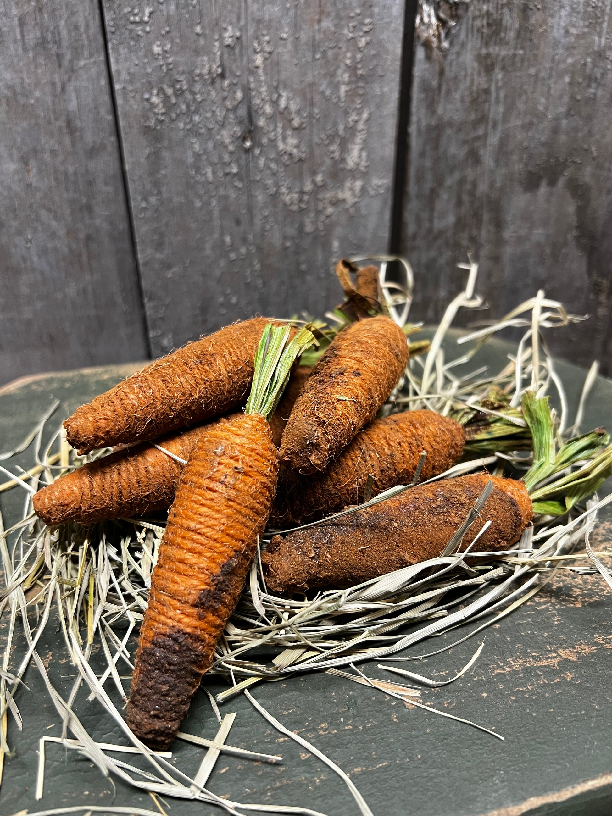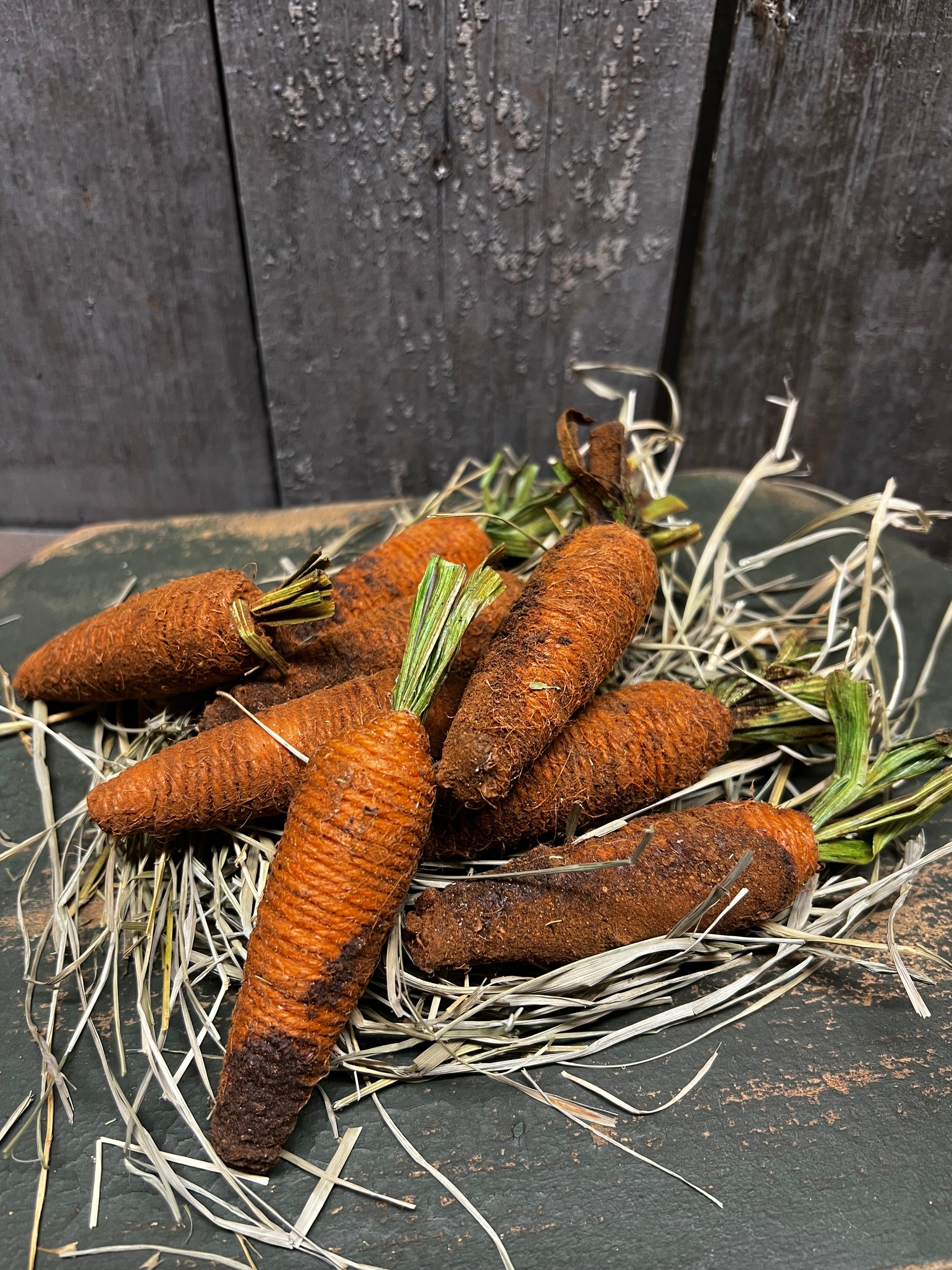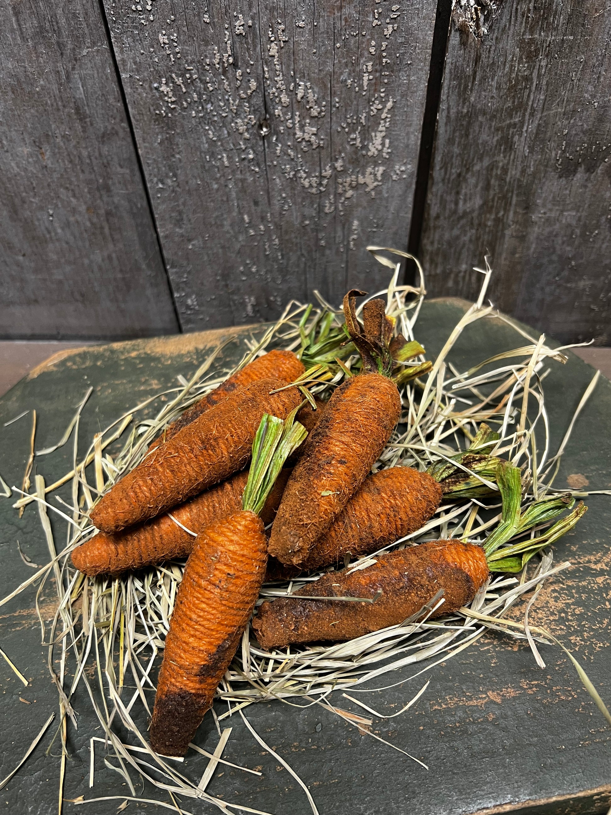 Perfect for small bowls, boards or baskets. You will receive dried grass and a set of 8 4" carrots that have been grunged with cinnamon and spices. Expect variations since each is hand done.
