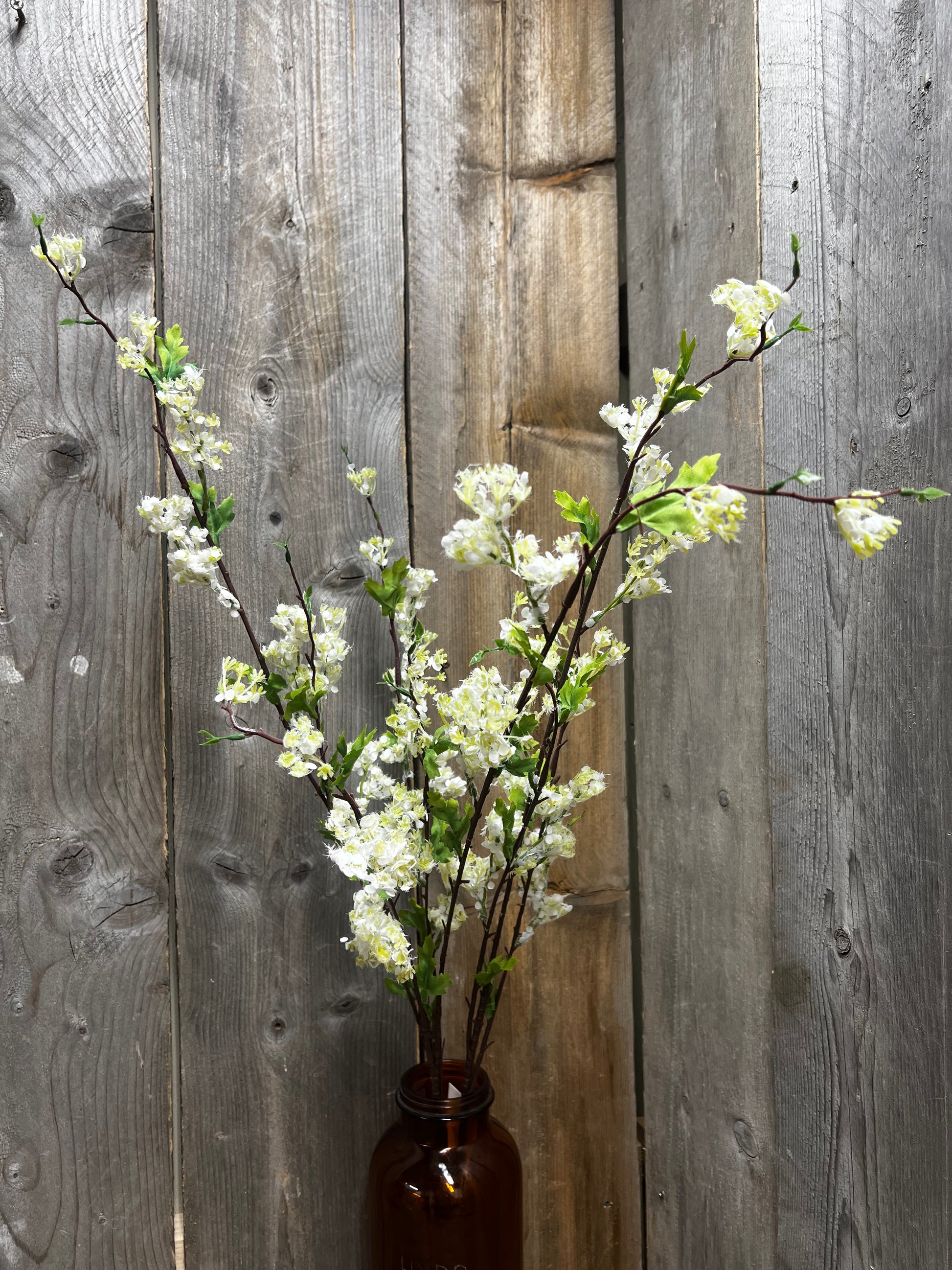 Stunning creamy white blossoms adorn long airy stems sprinkled with tiny green leaves. Measures 35" long, one shown.