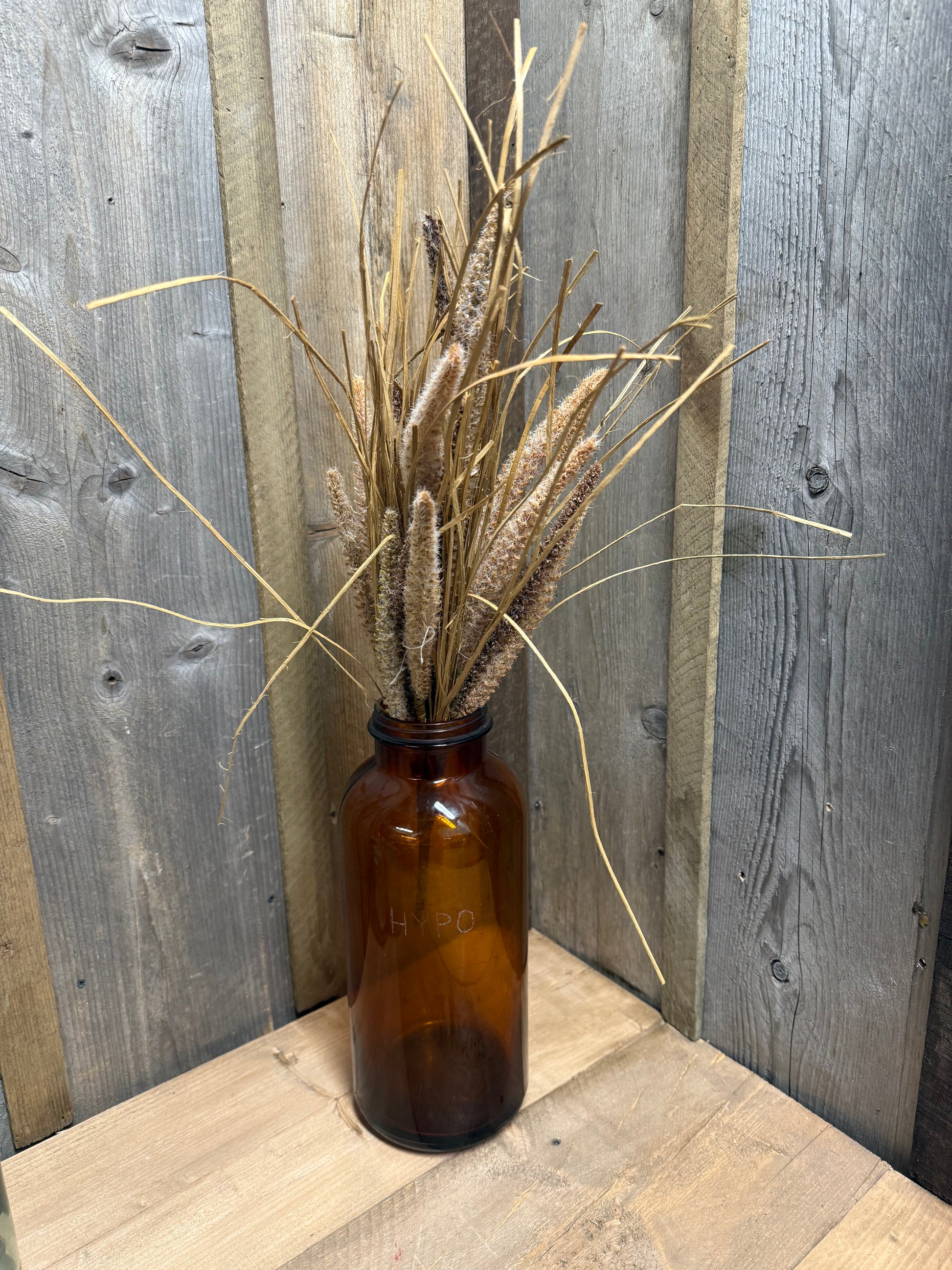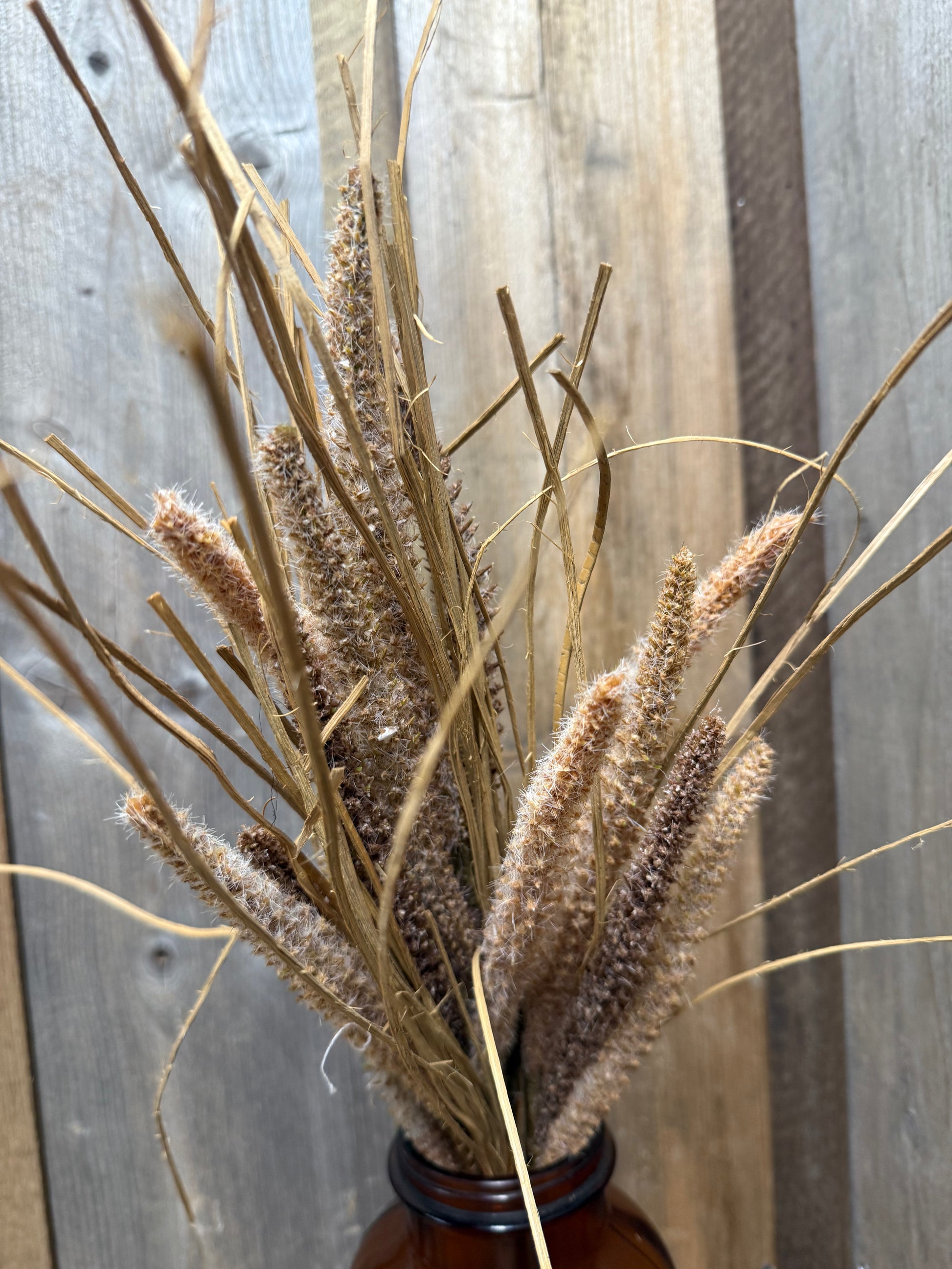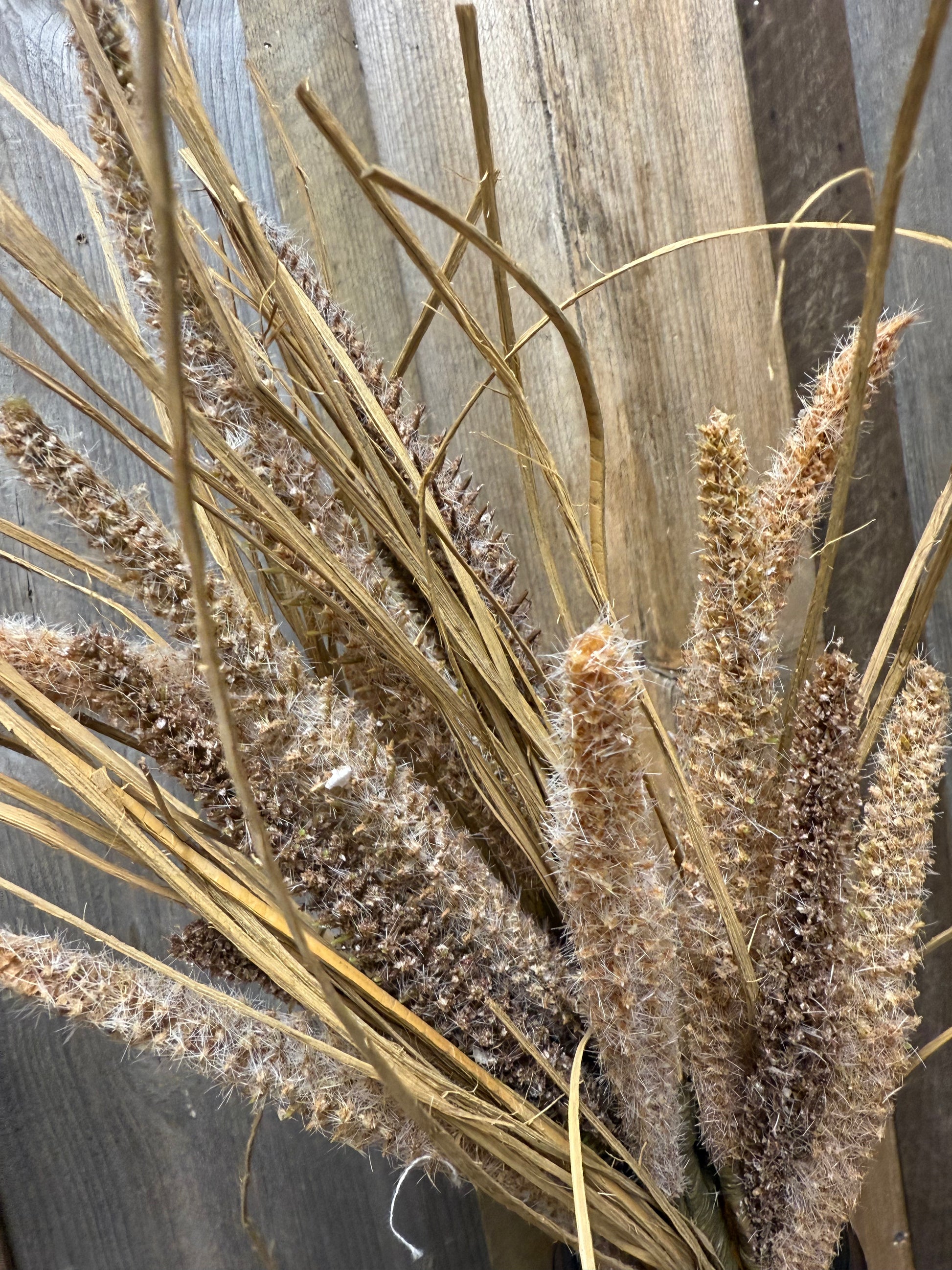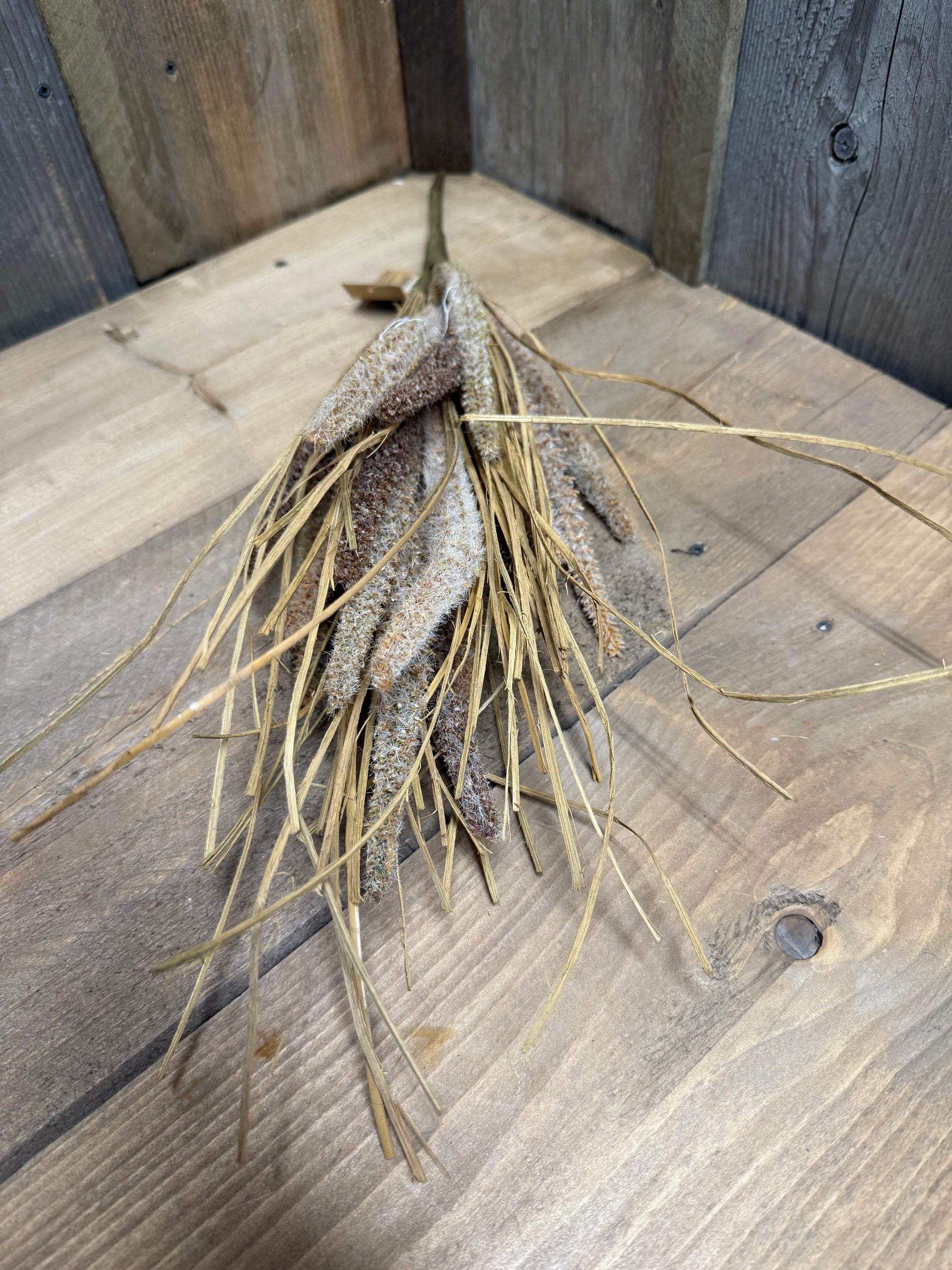Lovely for Autumn or any rustic decor. The dried and drab look has texture and wispy gras accents. One shown. Measures 20" long.
