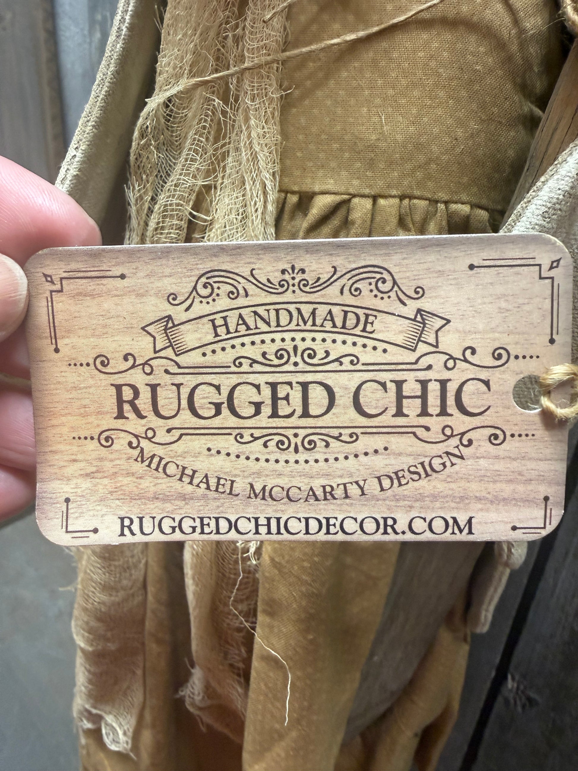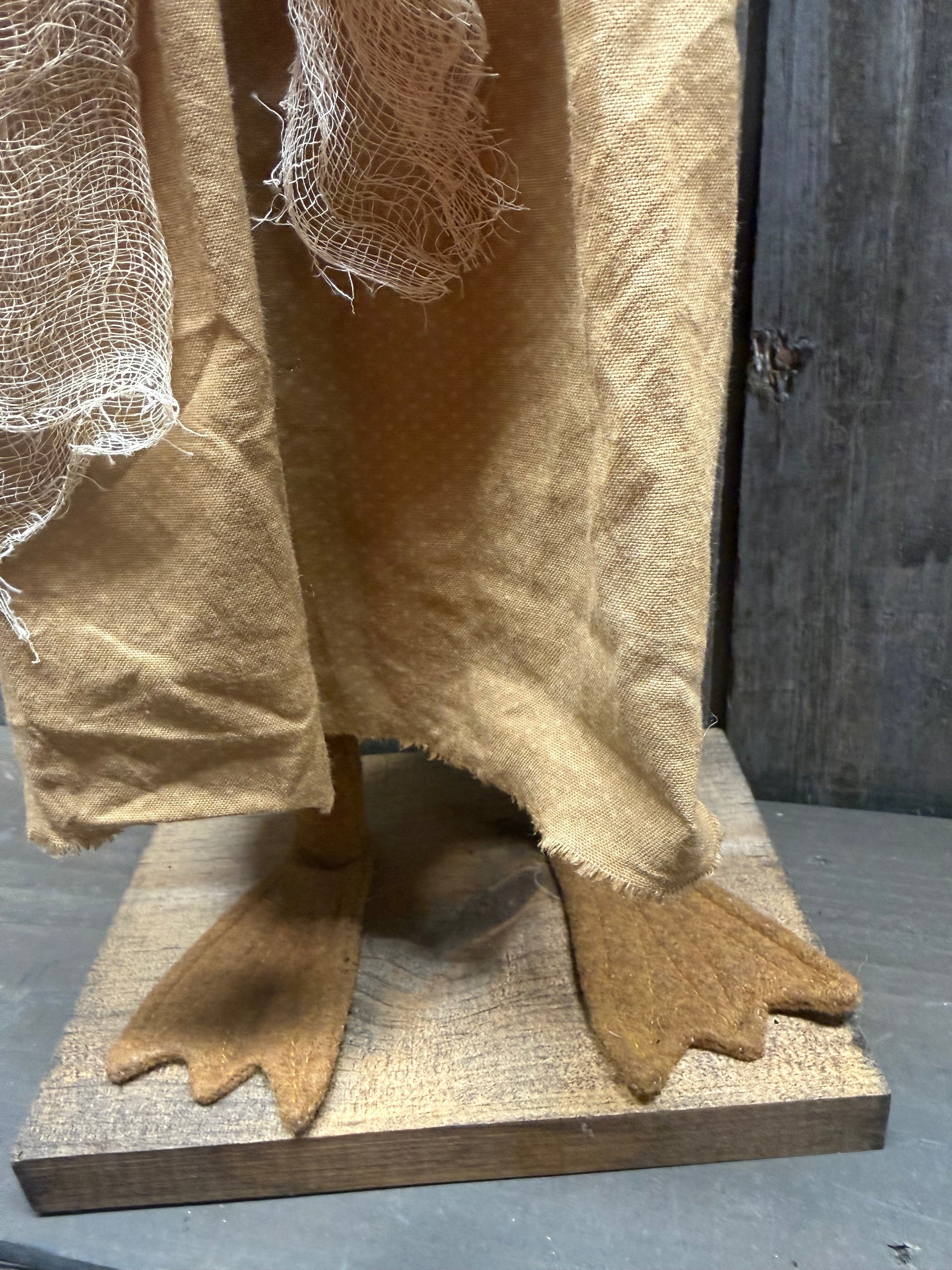 Oh the details in this hand crafted Chicken. Her face has been creatively stitched and her expression is priceless! She has on tattered and torn, worn and wonderful dress and holds a burlap bag of perky yellow daisies. A treasure for years to come. Loop on the back for hanging if you wish. She is 25" tall, and about 8" wide. A Michael McCarty/ Rugged Chic Design.