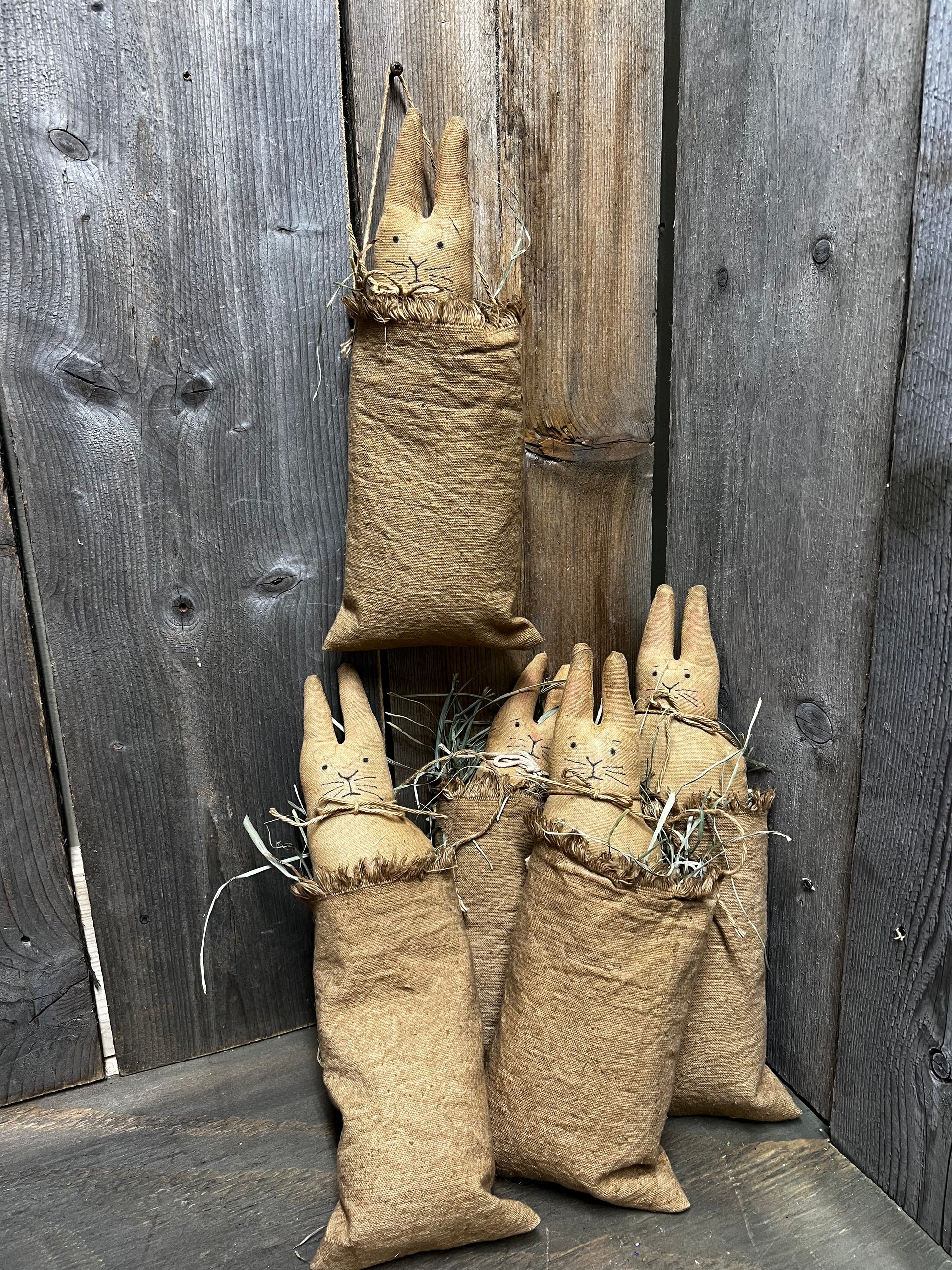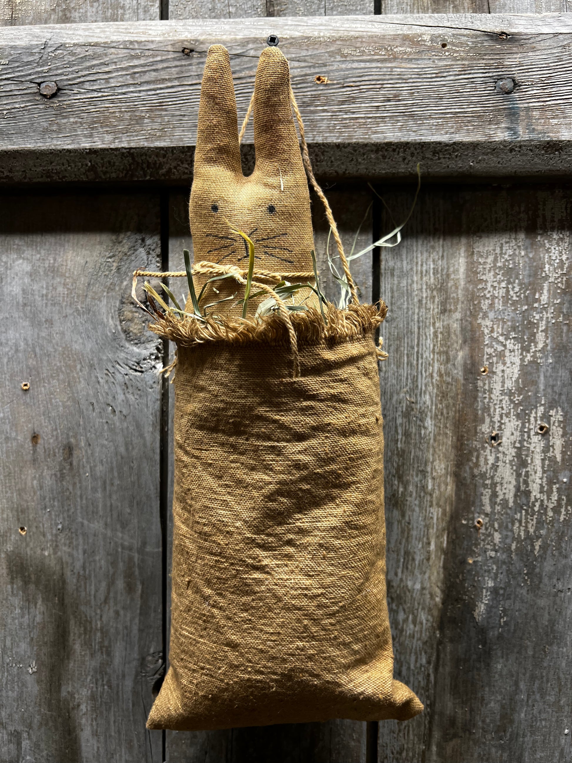 What is better than a grungy bag filled with dried sweet grass? A sweet handmade Hare tucked inside, that's what! Handmade in PA, each one will vary slightly. The bunny does come out of the bag. Measures 12" long without jute hanger and 4.5" wide.