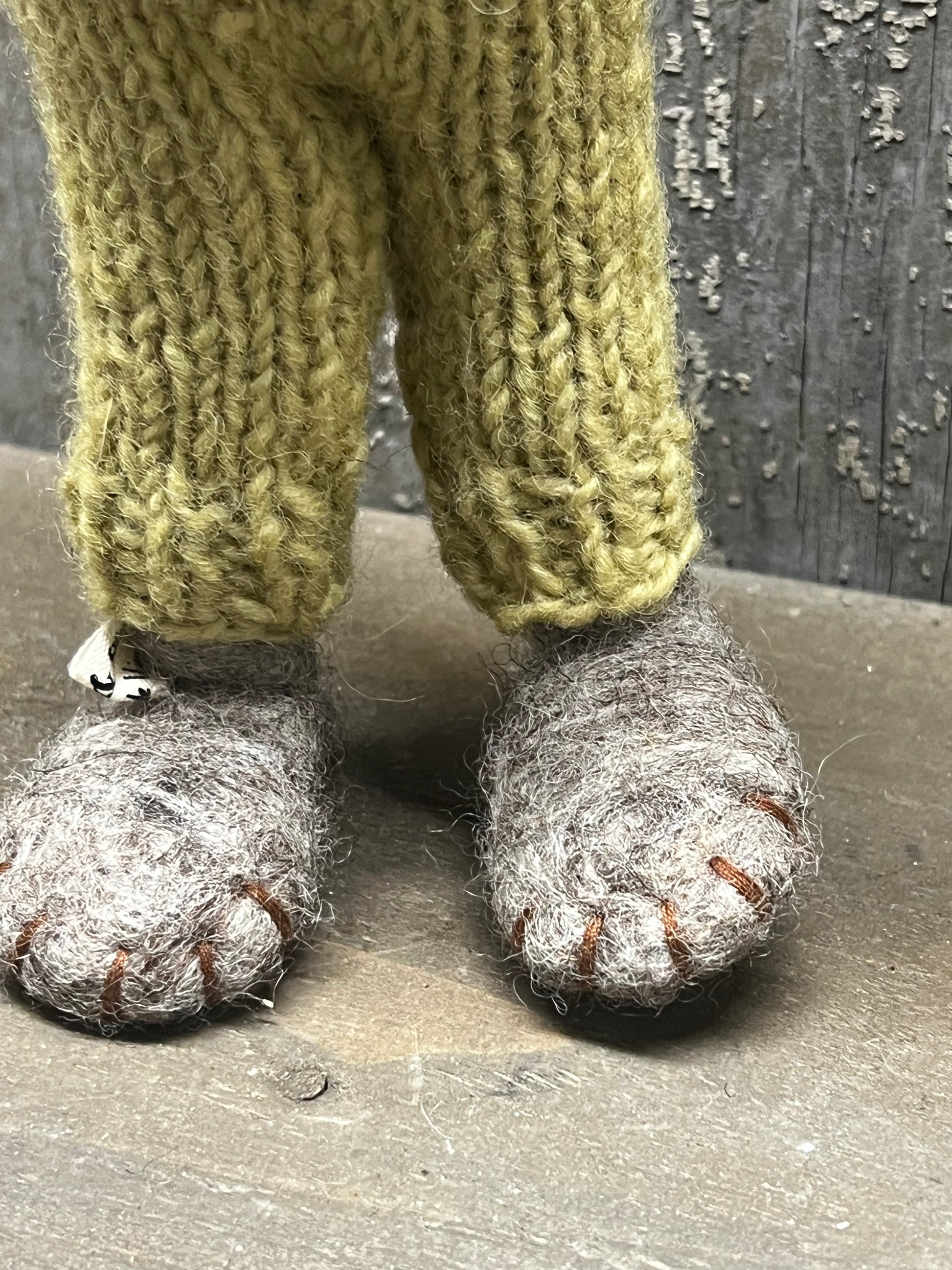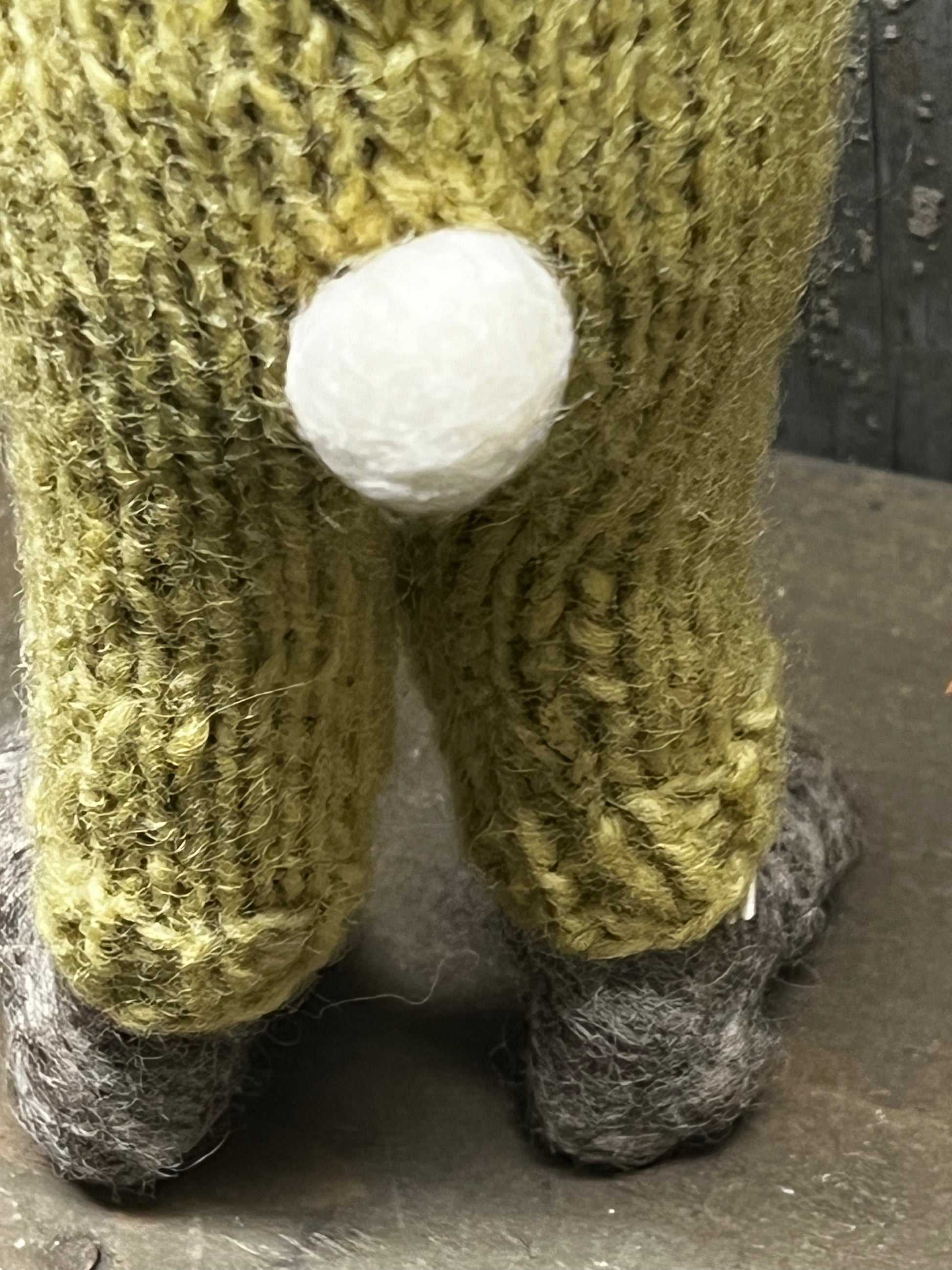 So sweet! This posable rabbit is a lovely grey/brown white and wears a sage knitted jumper and holds a big carrot. He stands about 11.5" tall and has the cutest little bunny tale. Felted from pure natural wool from New Zealand. Uniquely hand crafted in Nepal.