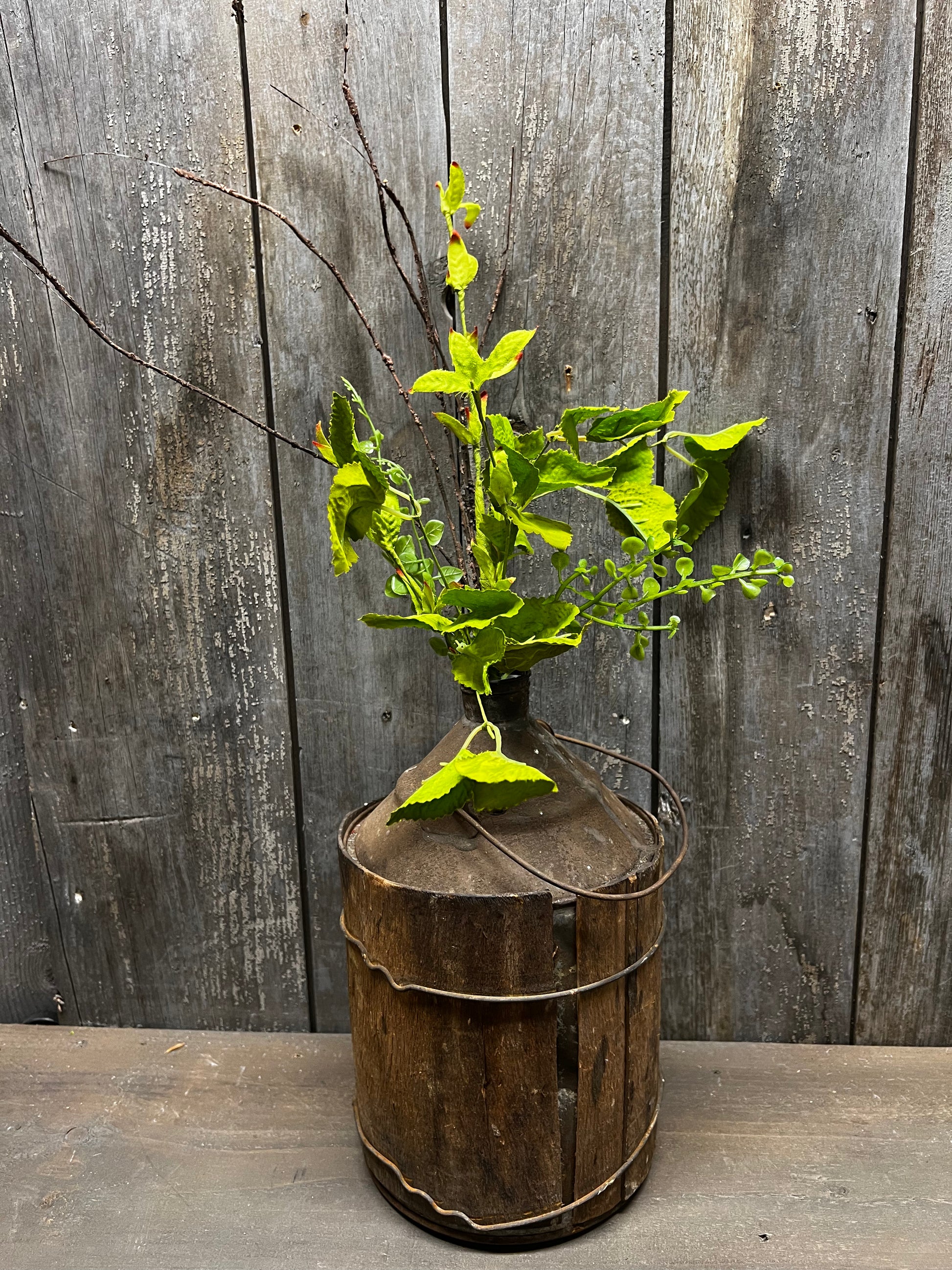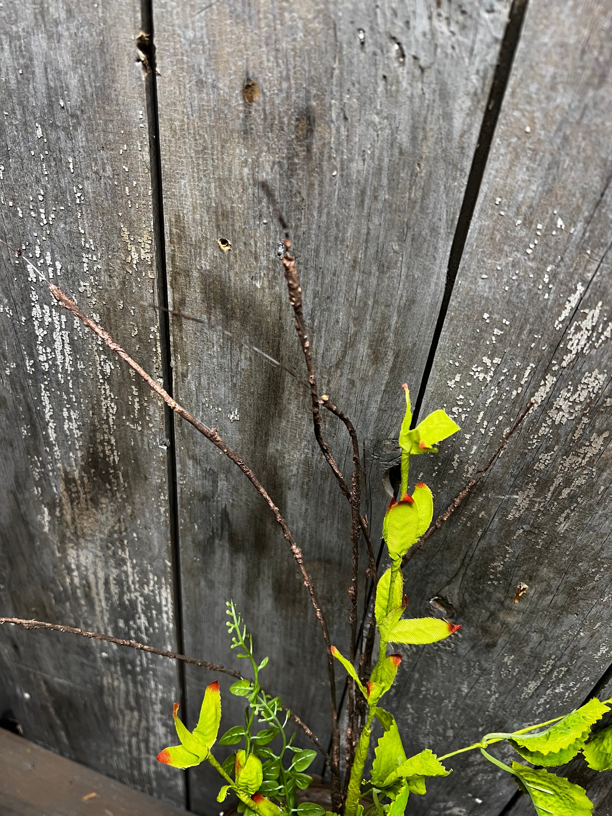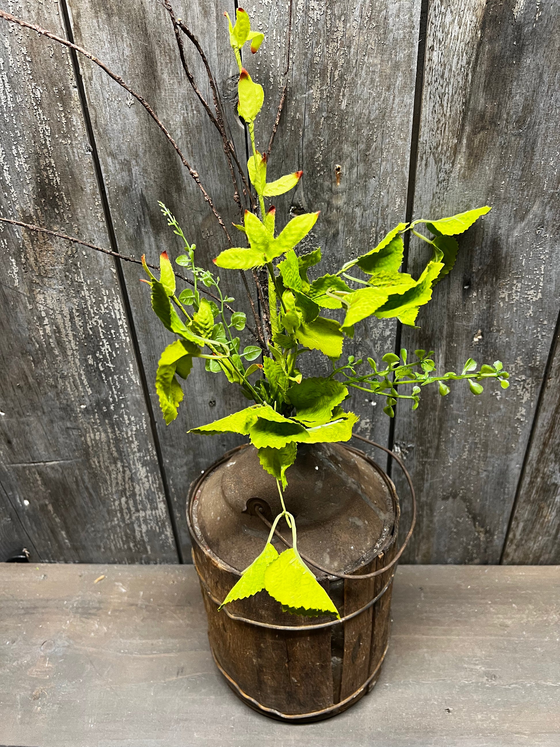 The colors and textures of this greenery bush have twiggy stems tucked into it. What a great way to add interest to arrangements or baskets and crocks.