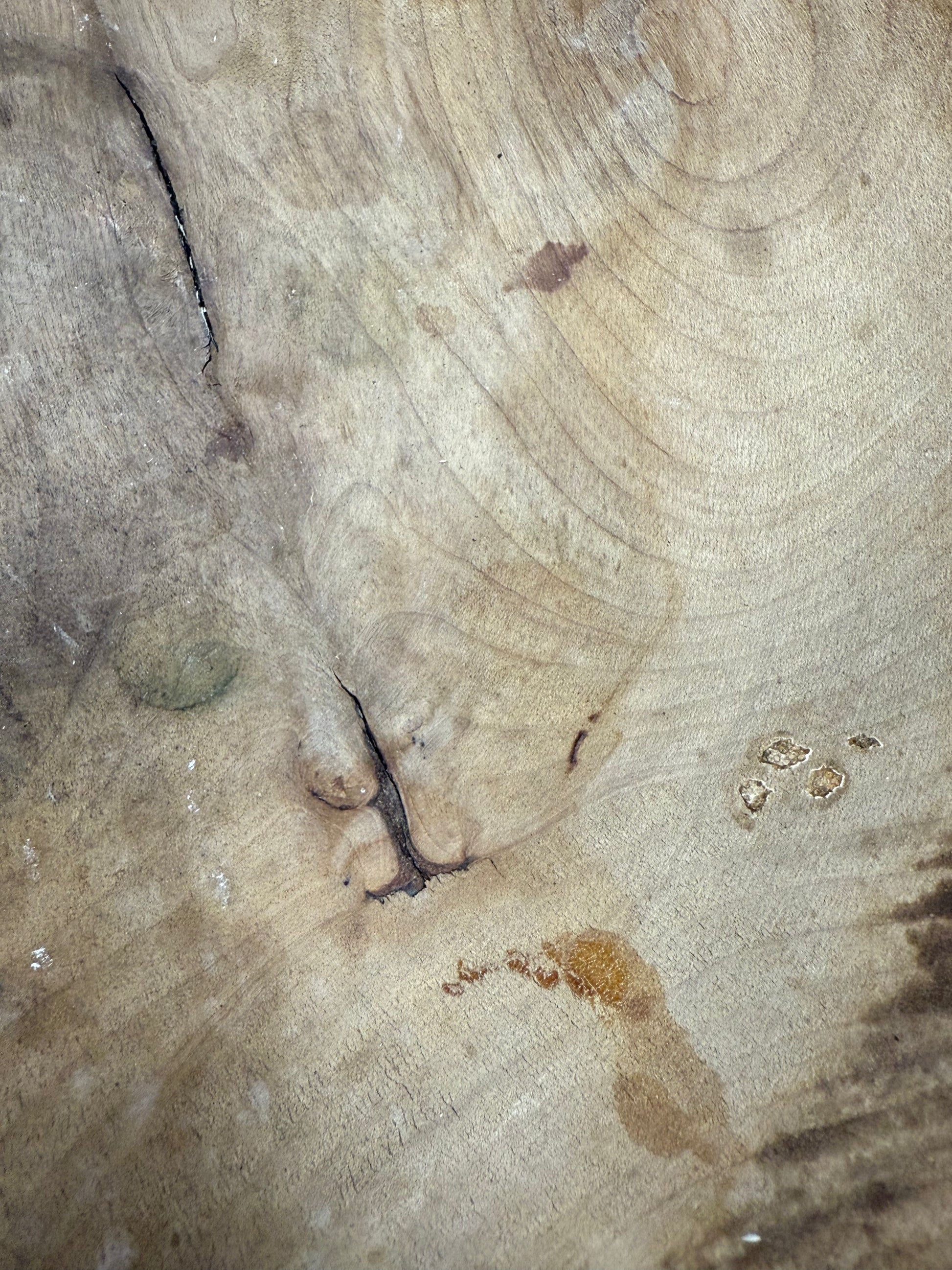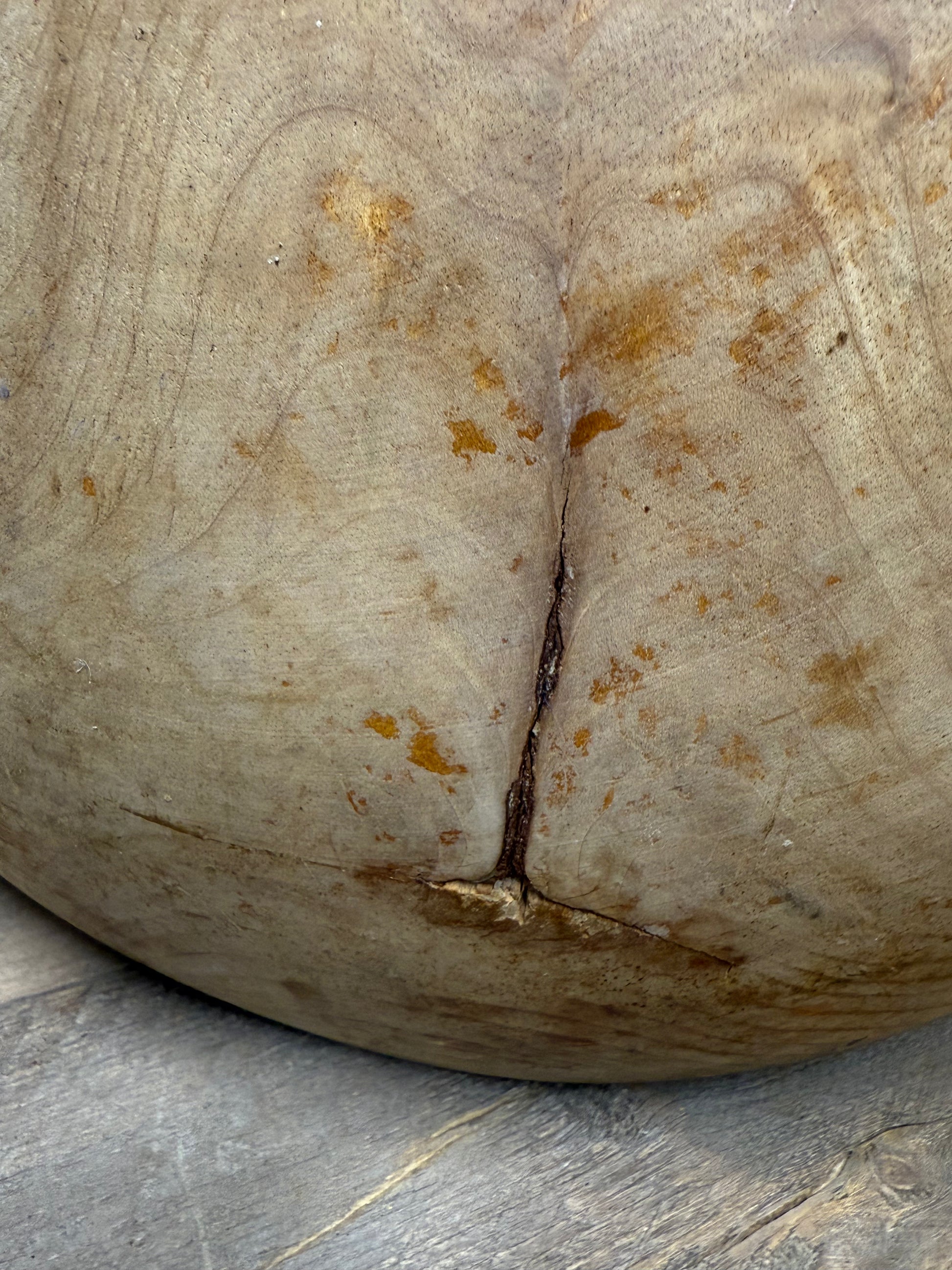 Oh I love this bowl. It has some cracks and stains, it is not quite round and the sides are uneven too! You can tell it was made and used with love! Heavy with great character. Measures 13.25"x 12.5" x 3.75" at low side. Please browse photos carefully as they are part of the description.