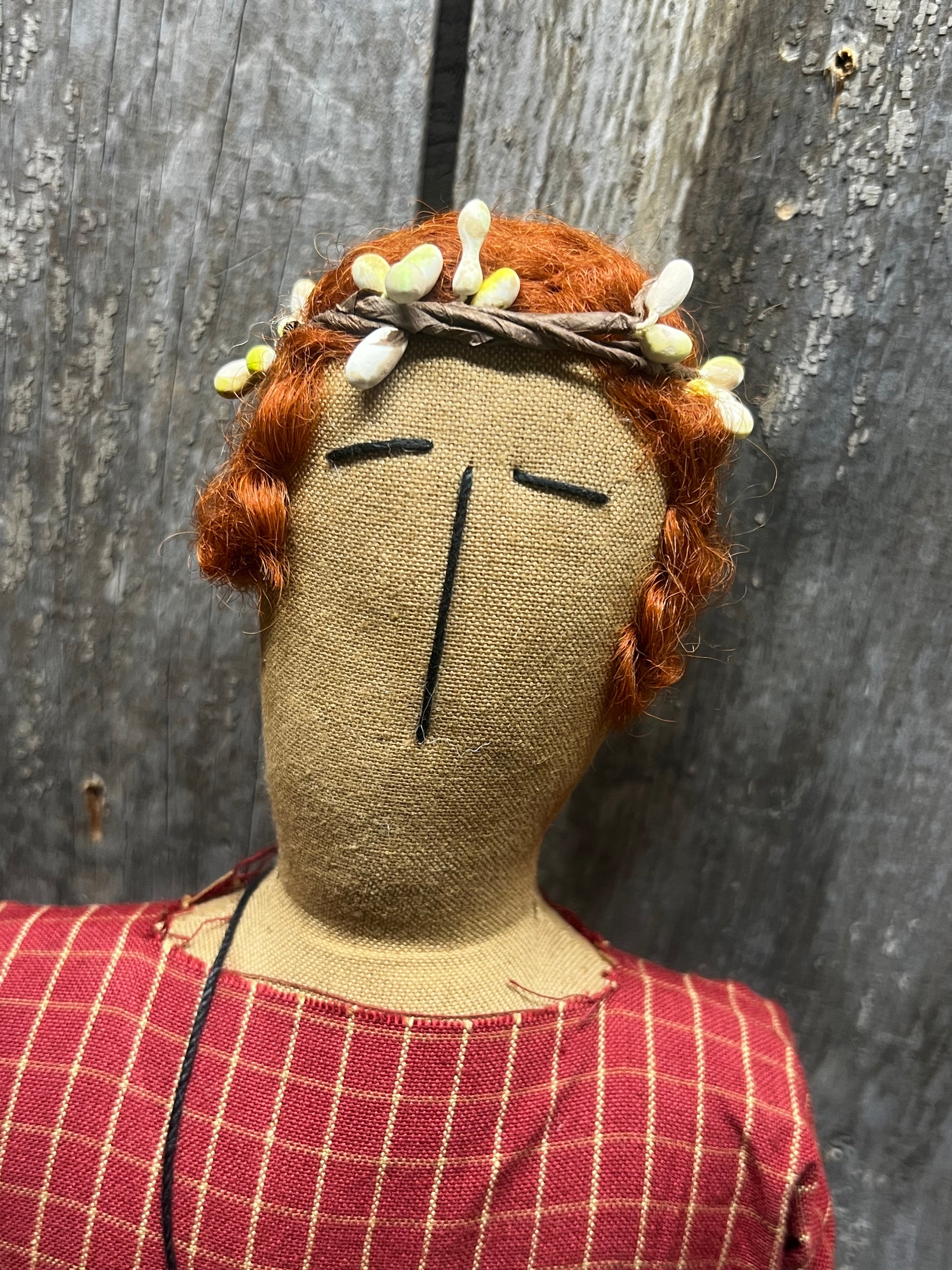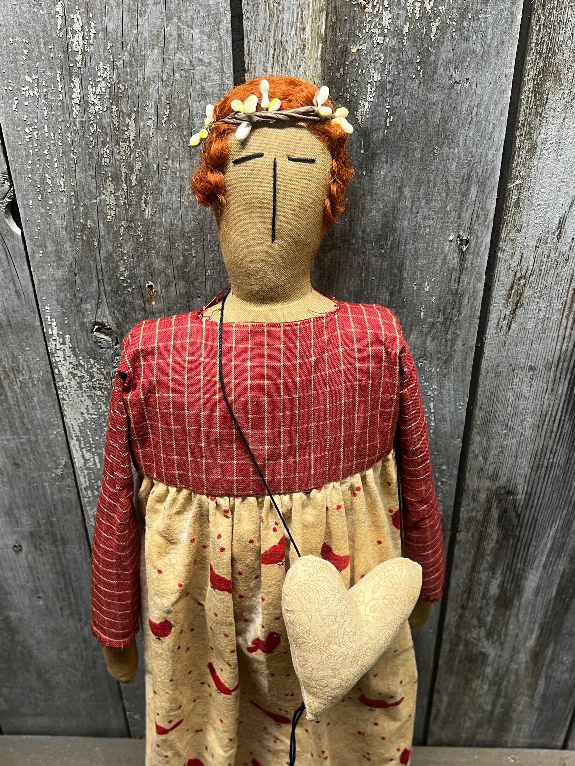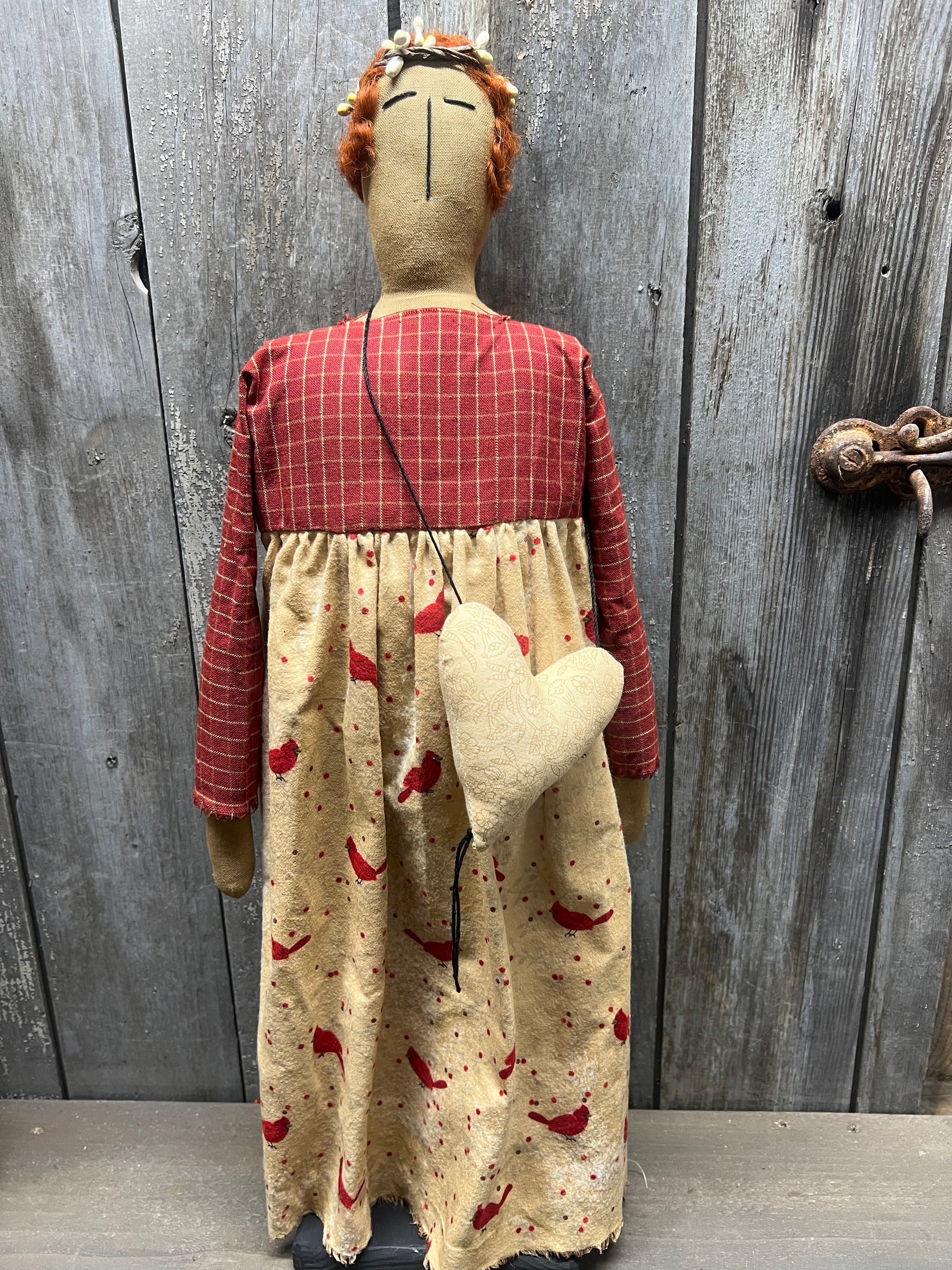 So simply sweet and primitive. Our PA made doll stand about 20" tall and free stands on a wooden base. Dressed in accenting patterns of Red and Tan Homespun and Stained Cardinal Flannel, she holds a small stuffed heart. Her crown is made from pip berries. Expect slight variations.