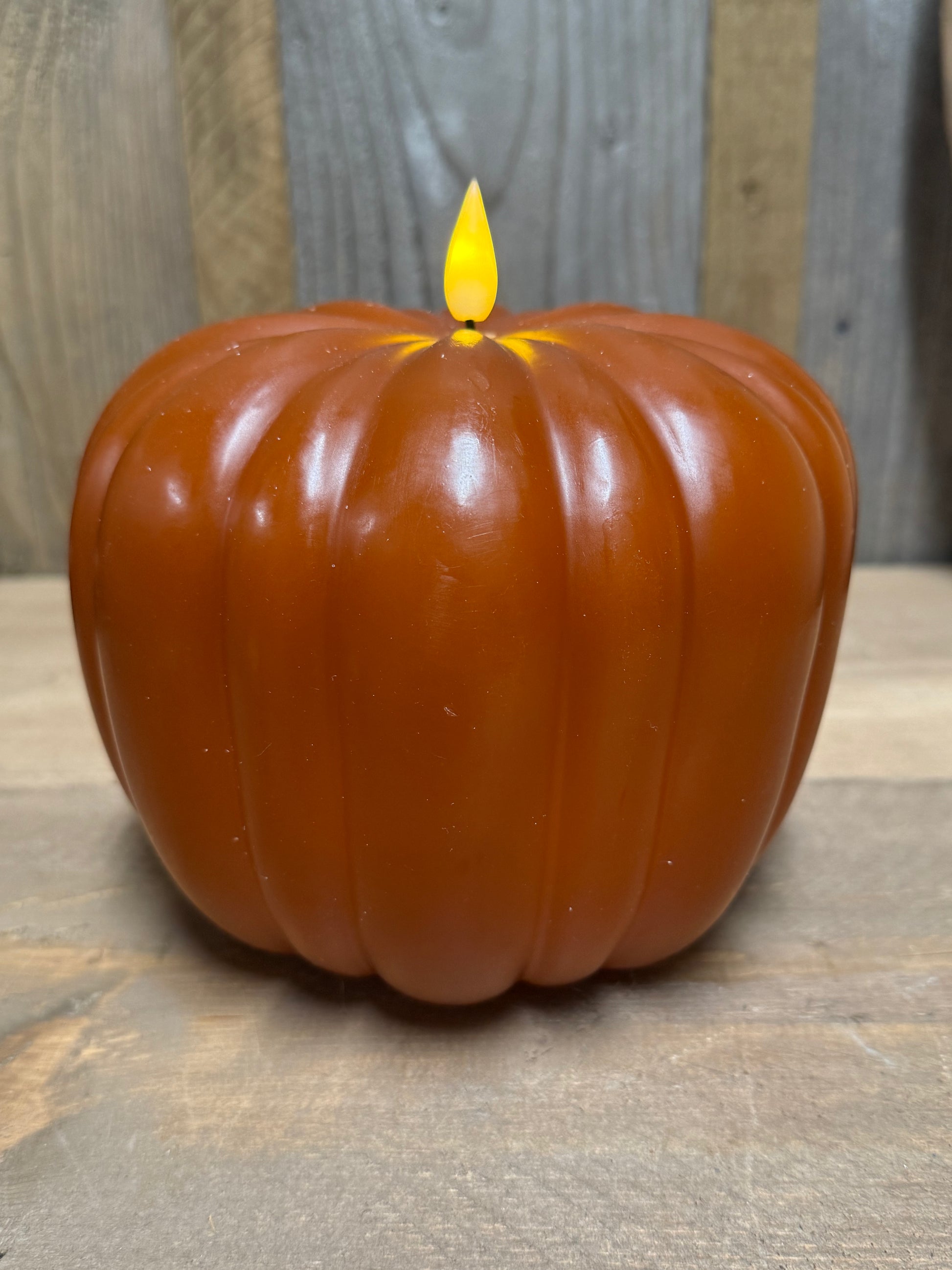 Happy Fall! Nothing screams "autumn" more than pumpkins and ones that have a amber glow are even nicer. The LED candle is safe and eco-friendly; the 6 hour TIMER is handy function. It can also be set to ON for those all day occasions. A lovely accent you can use all through November. Measures 6" high and 6" in diameter. Requires 2 AA batteries not included.
