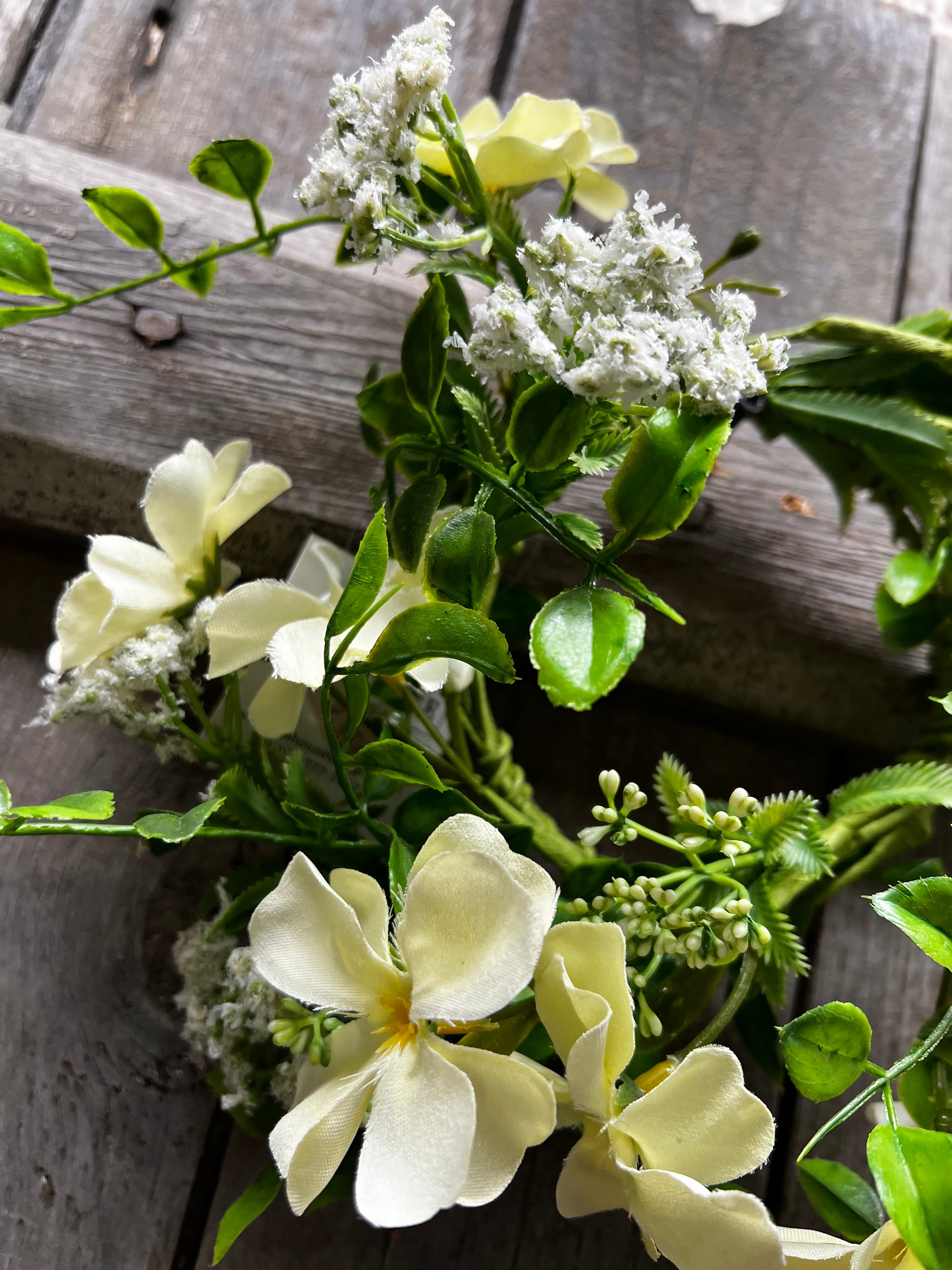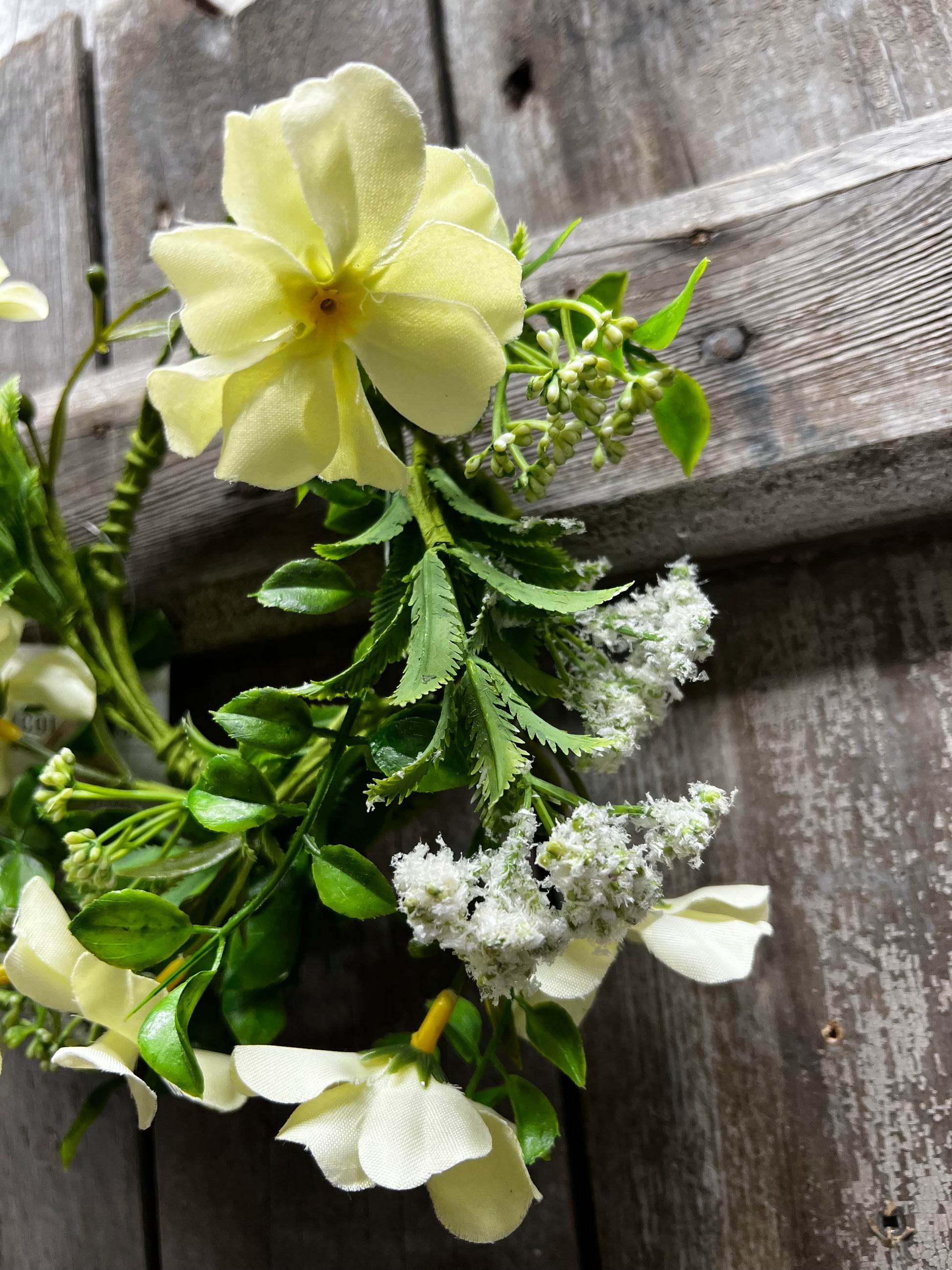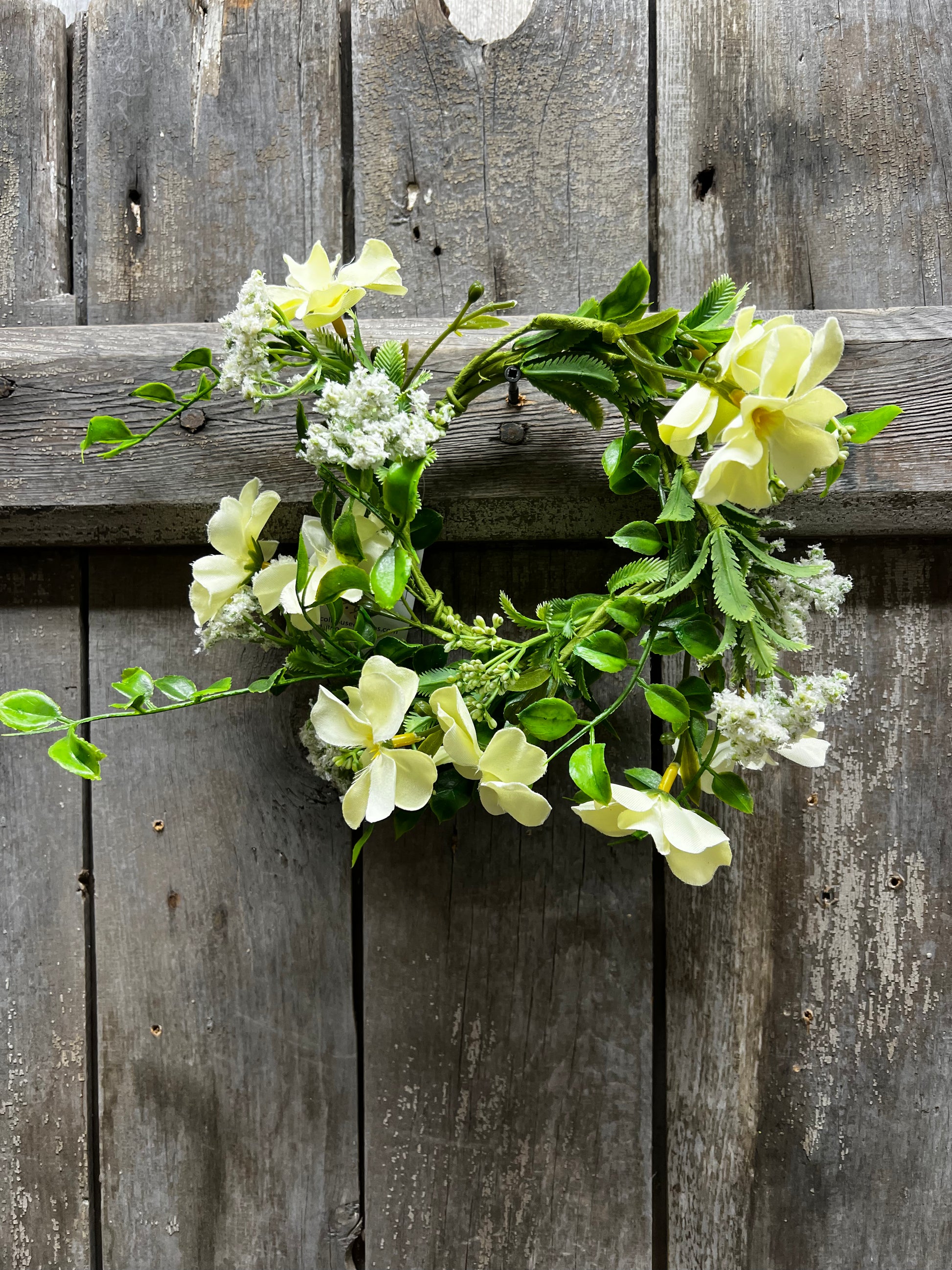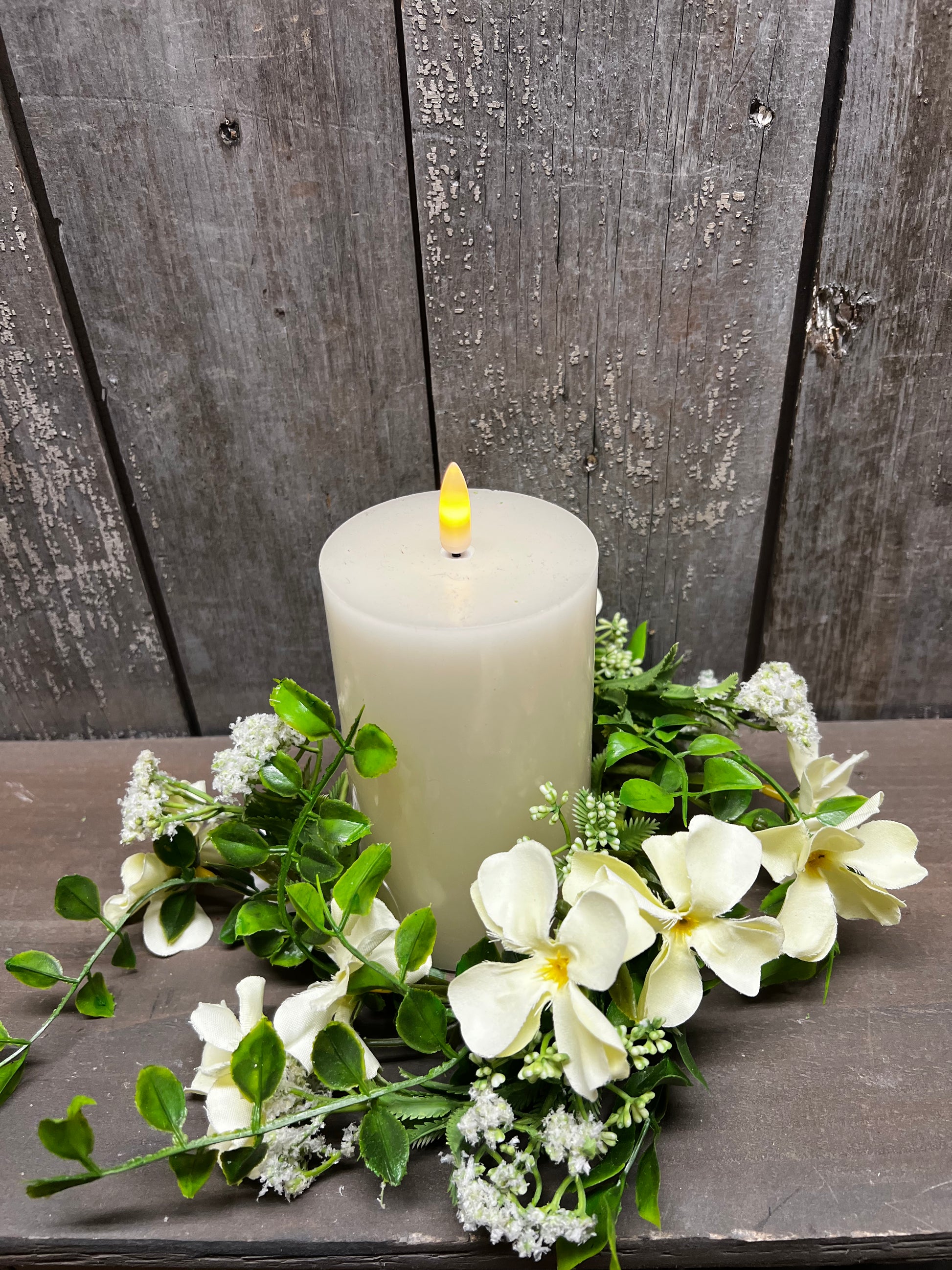 Lovely shades of cream and green mixed together to add a fresh and clean look. Inner ring measures 3.5" and overall size will depend on how "full" you make it look by adjusting the pieces. Candle Ring only.