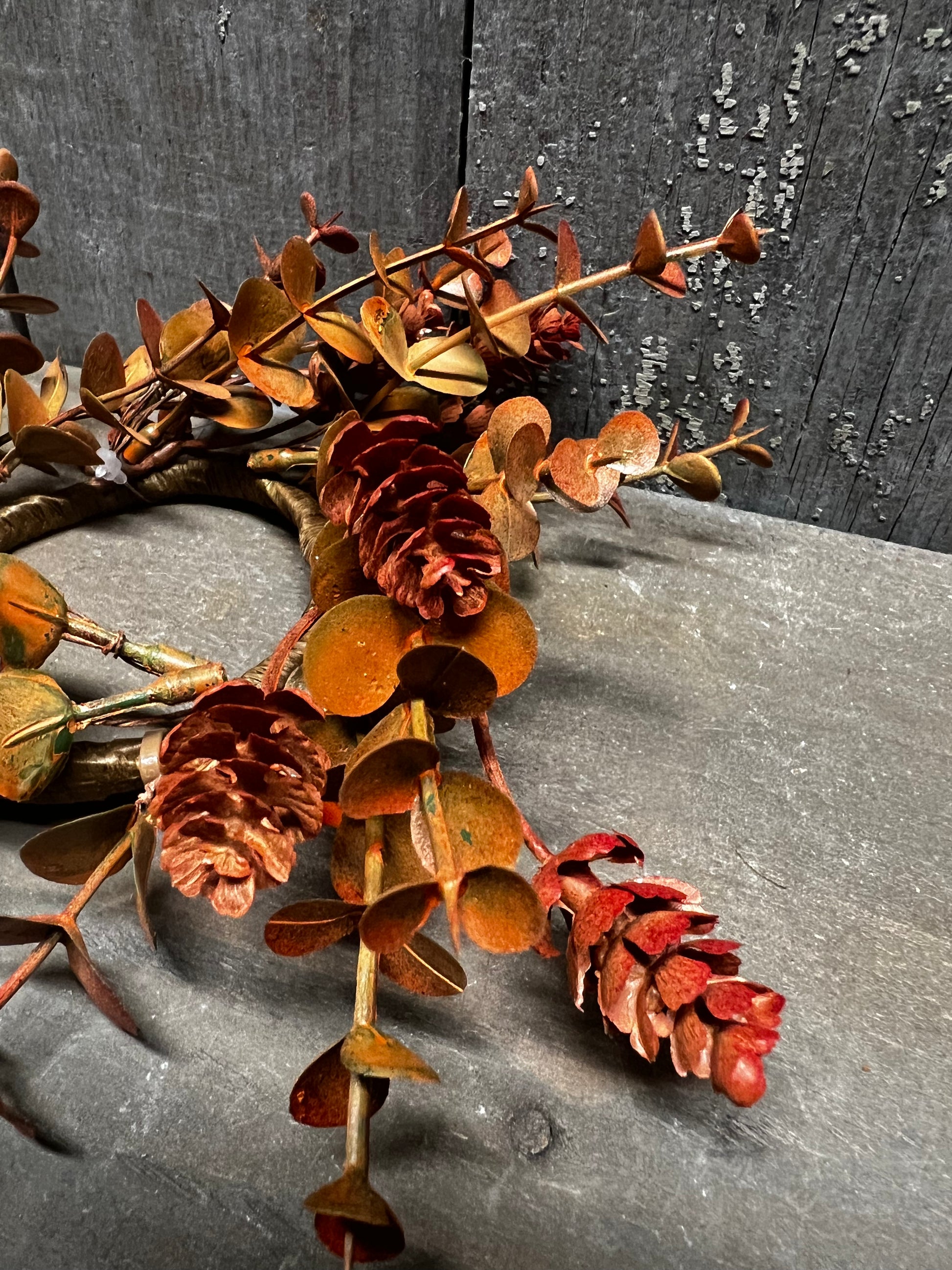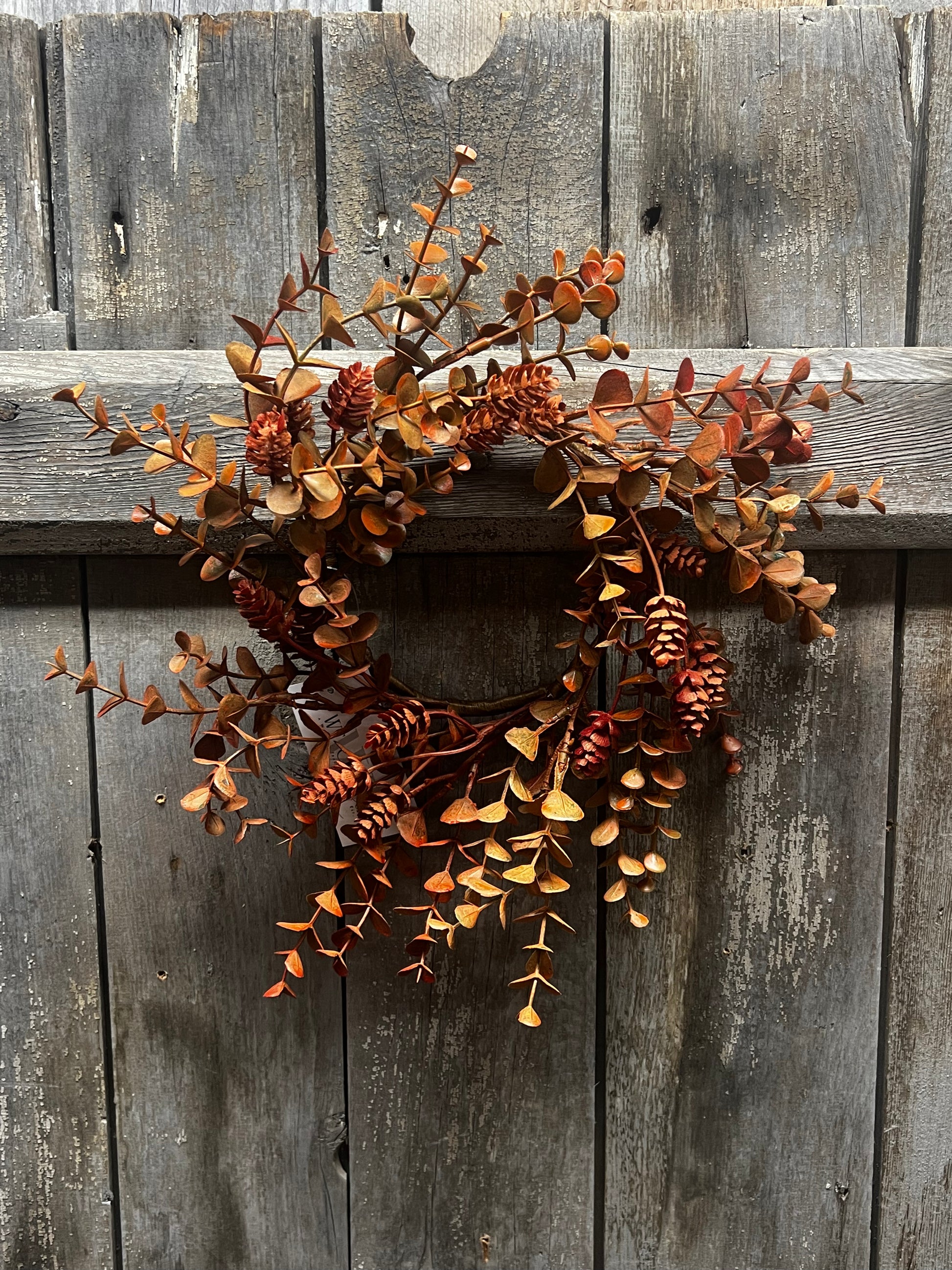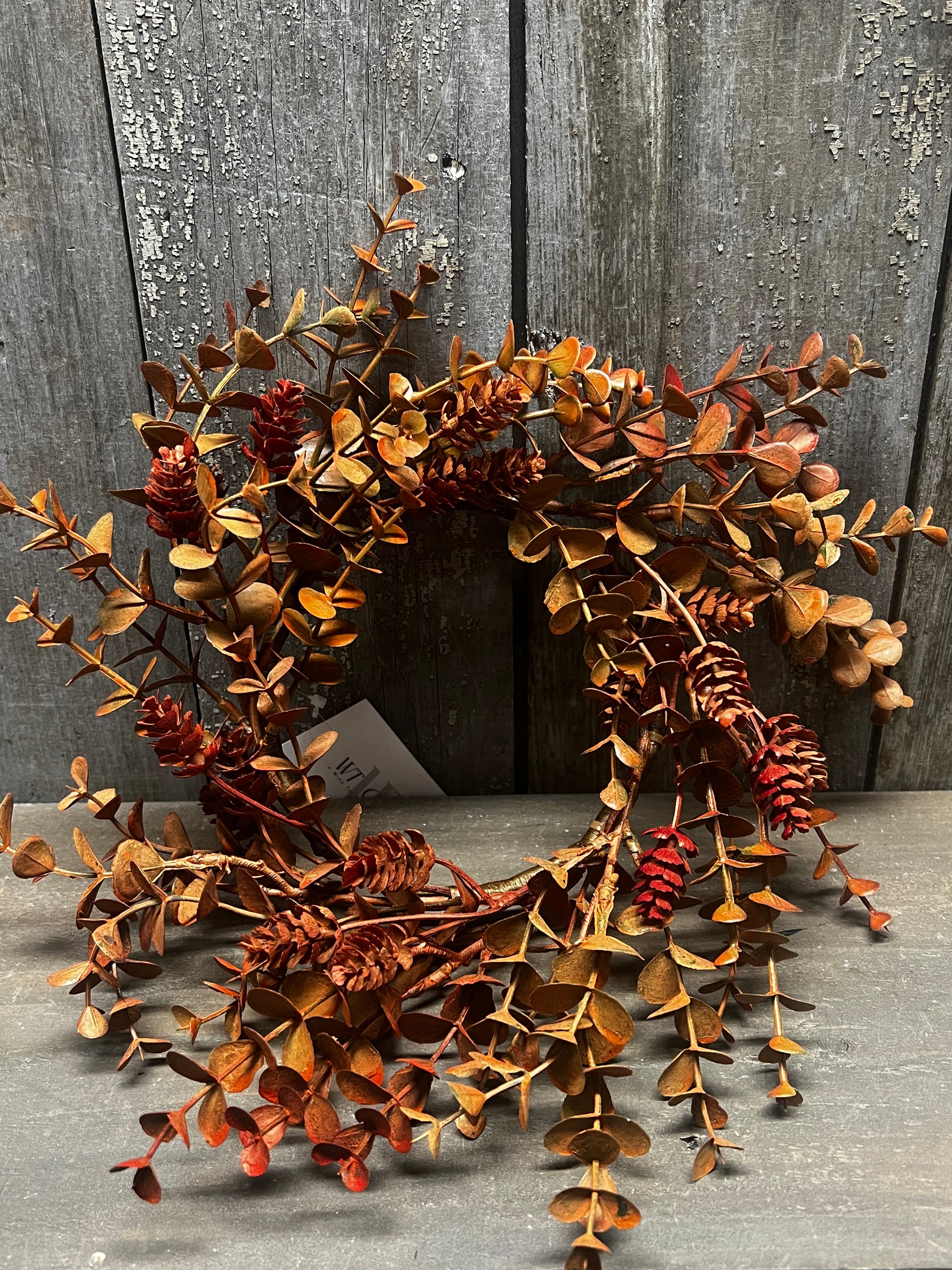 The lovely shades of Autumn shine in this mix of eucalyptus and hops. Inside ring measures 4.5", about 12" overall. Shown with our pillar candle. Sold separately.