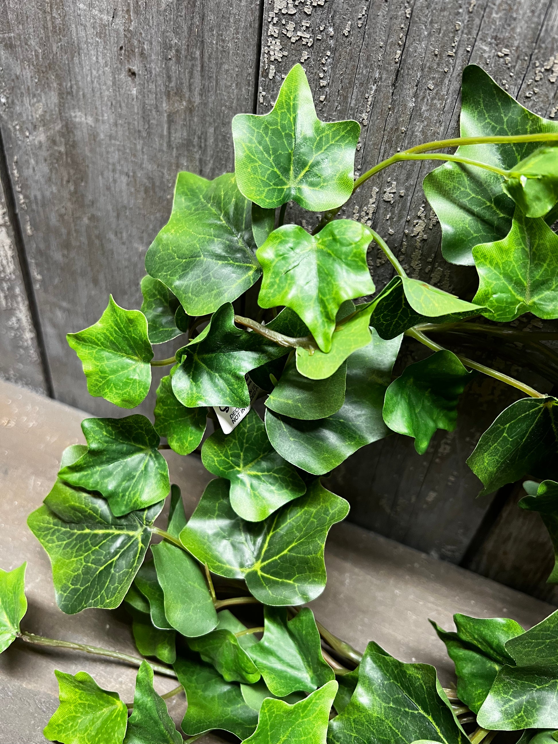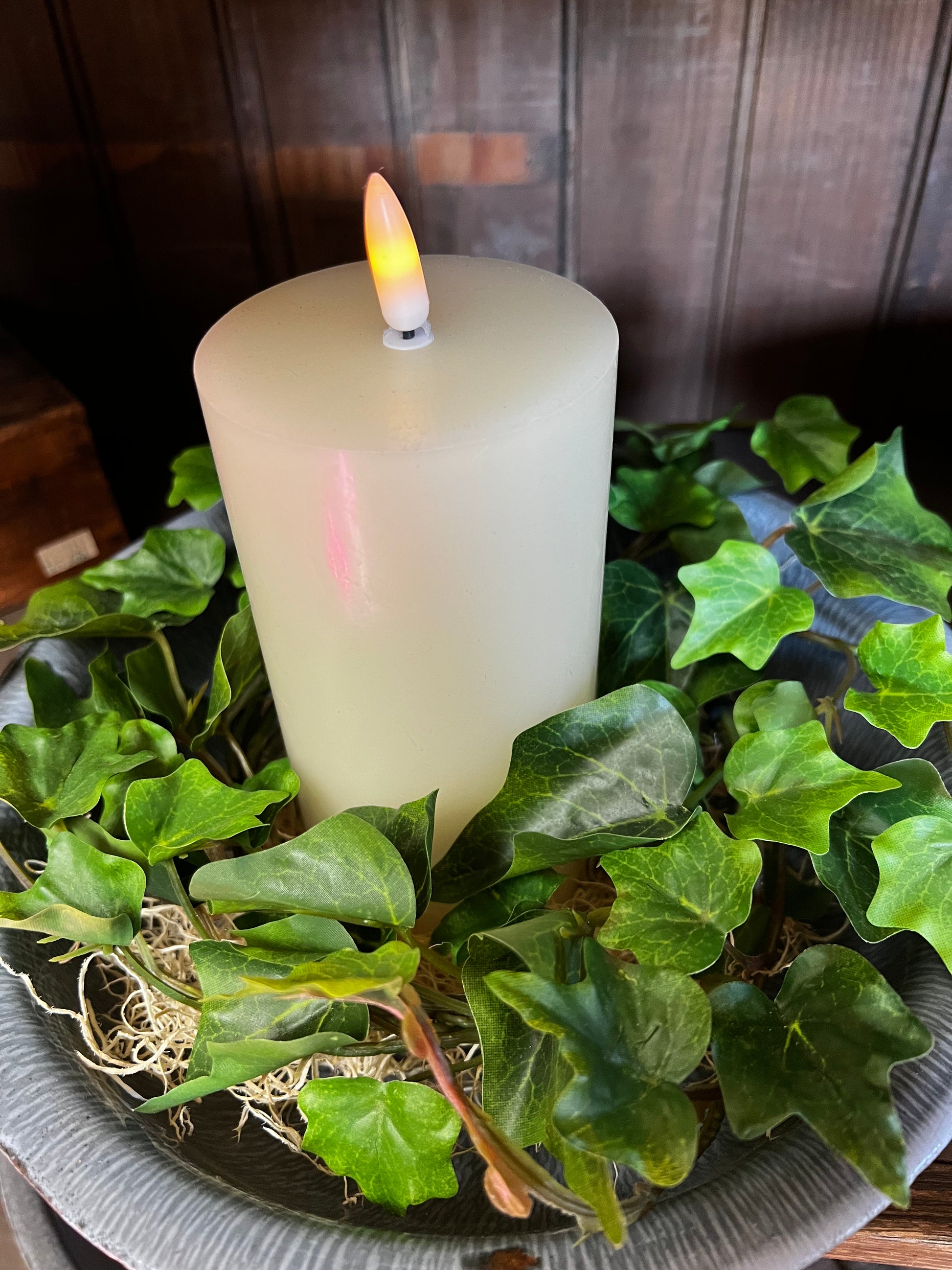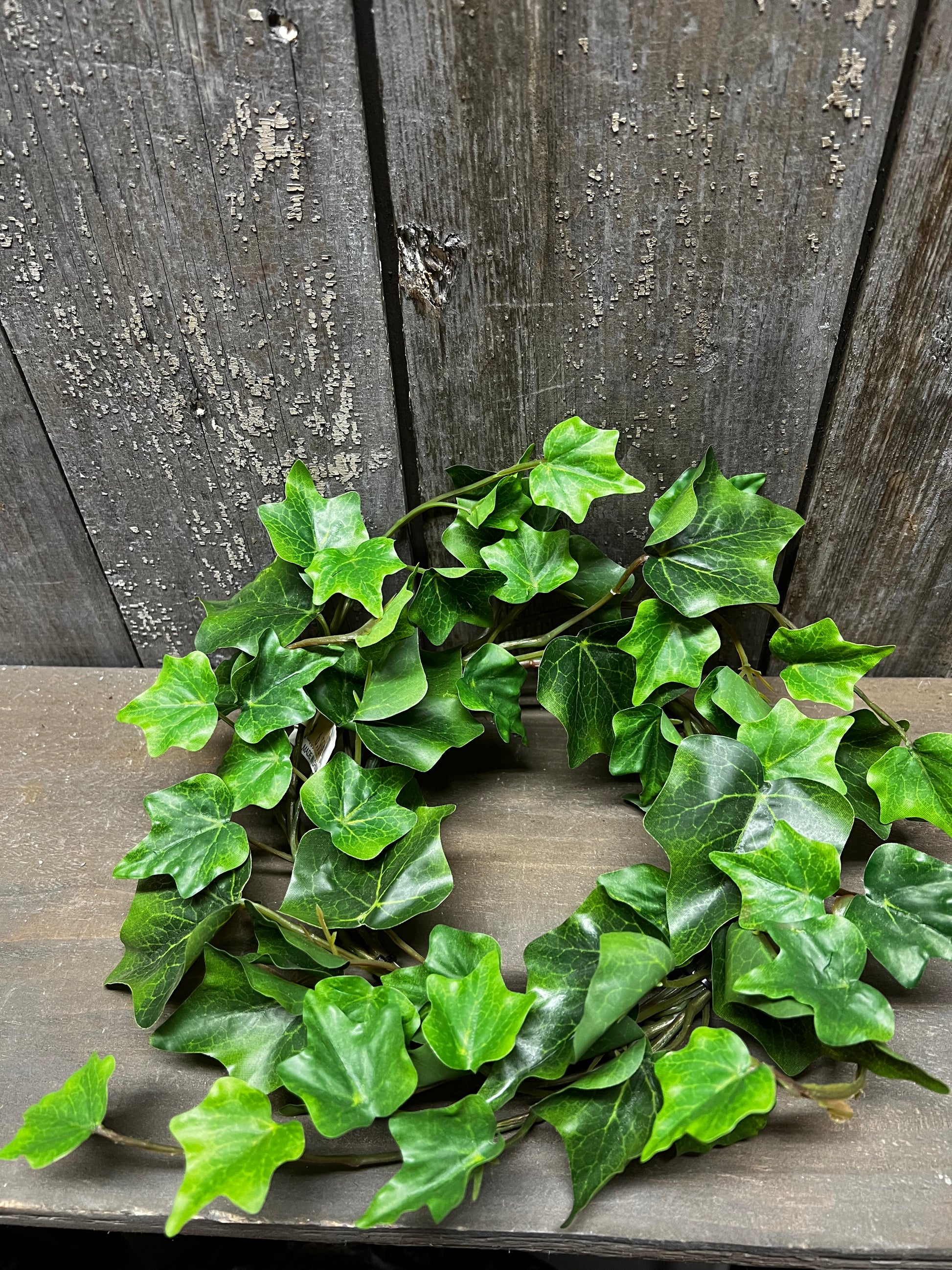 Ivy is timeless and so lovely! Use as a candle ring, or a small wreath or just about anywhere. Inside measures 4.5", 10" overall. Ring only, candle not included.