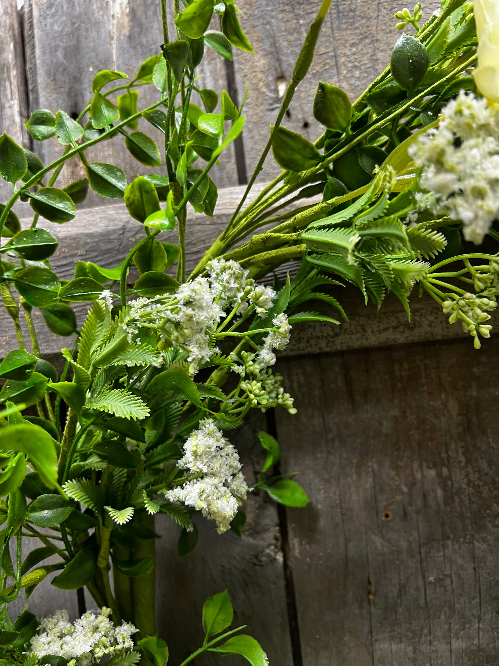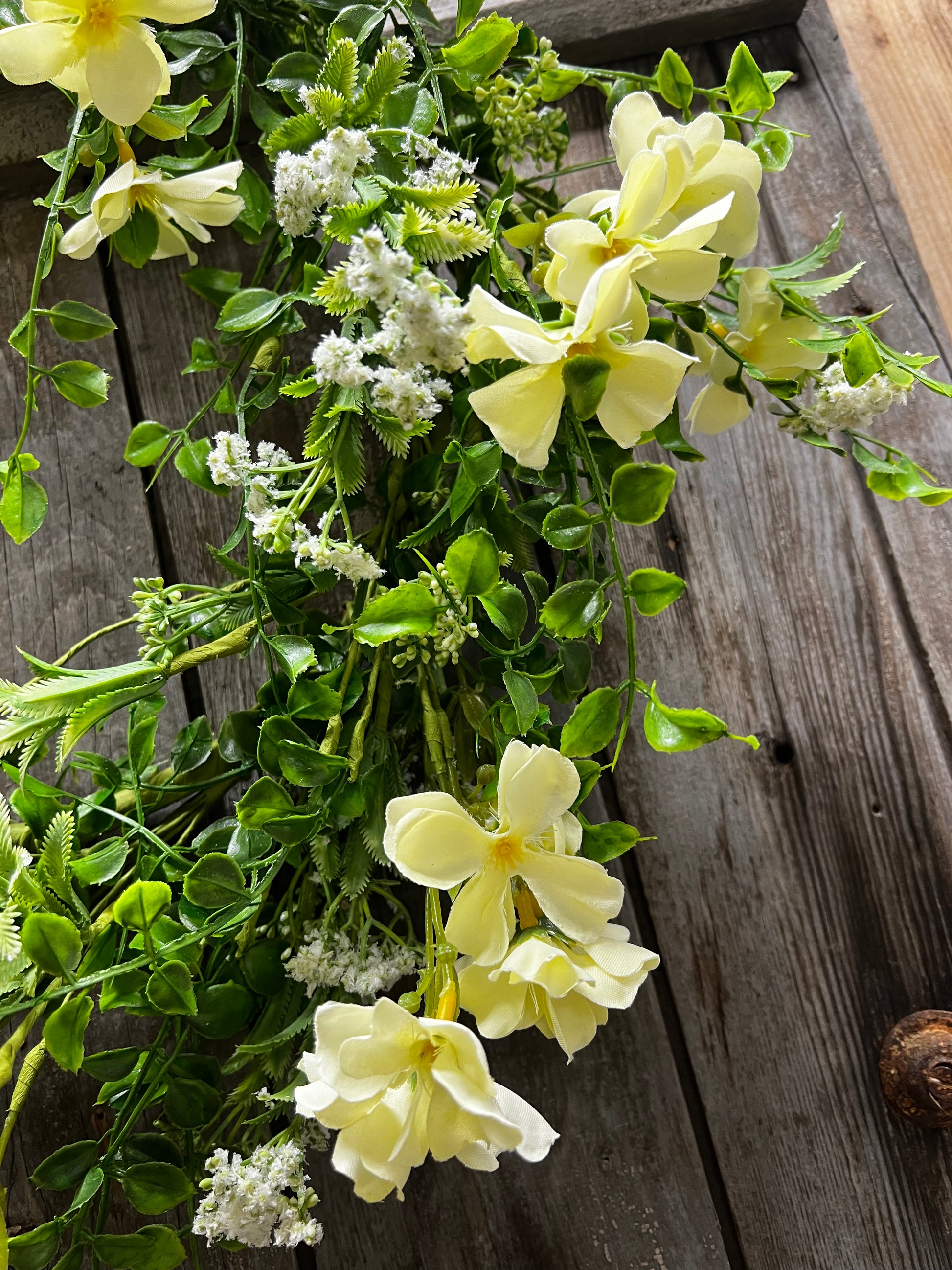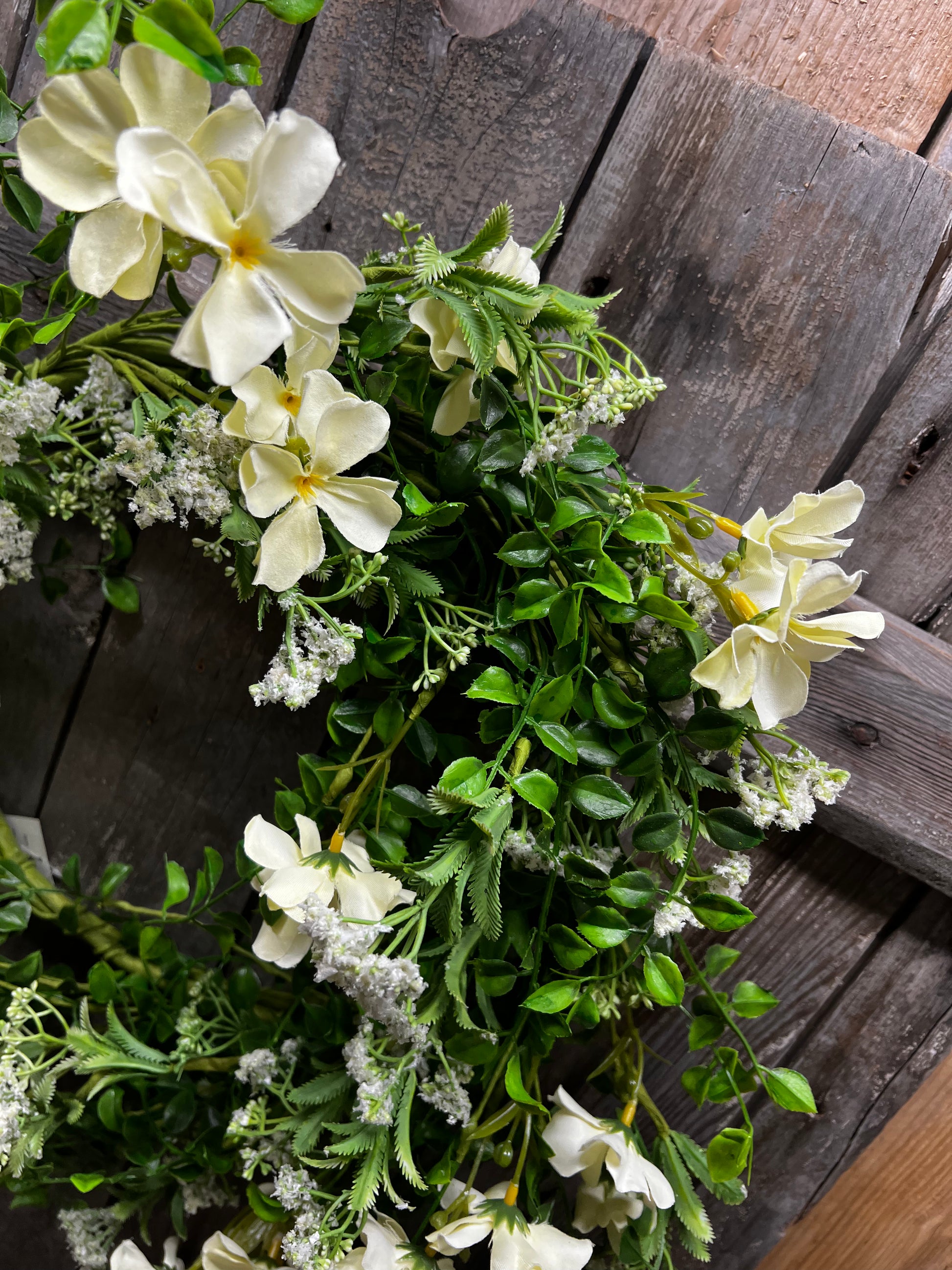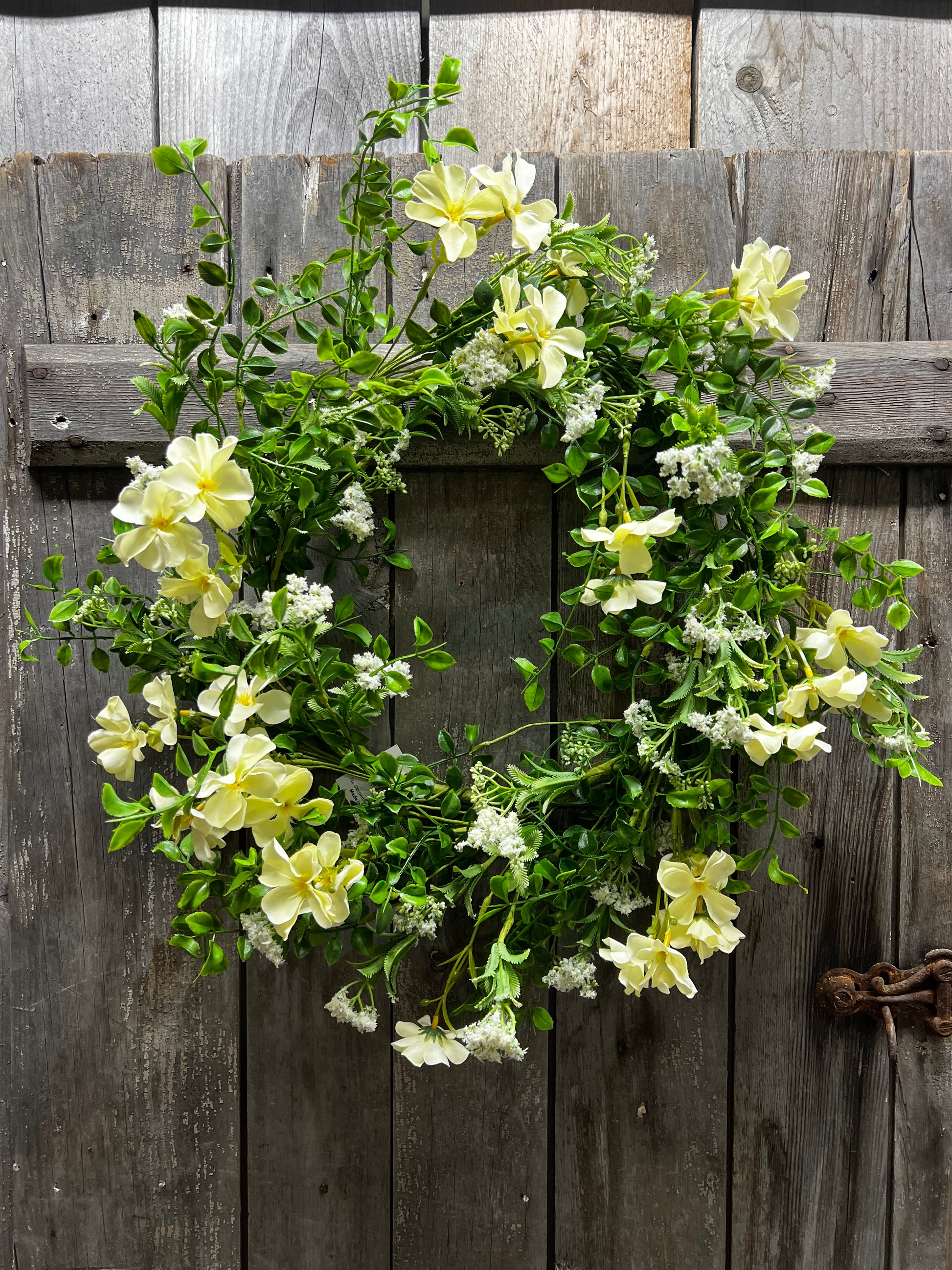 Lovely shades of cream and green mixed together to add a fresh and clean look. Inner ring measures 22" and overall size will depend on how "full" you make it look by adjusting the pieces. Use on a wall or even as a centerpiece around a dough bowl.