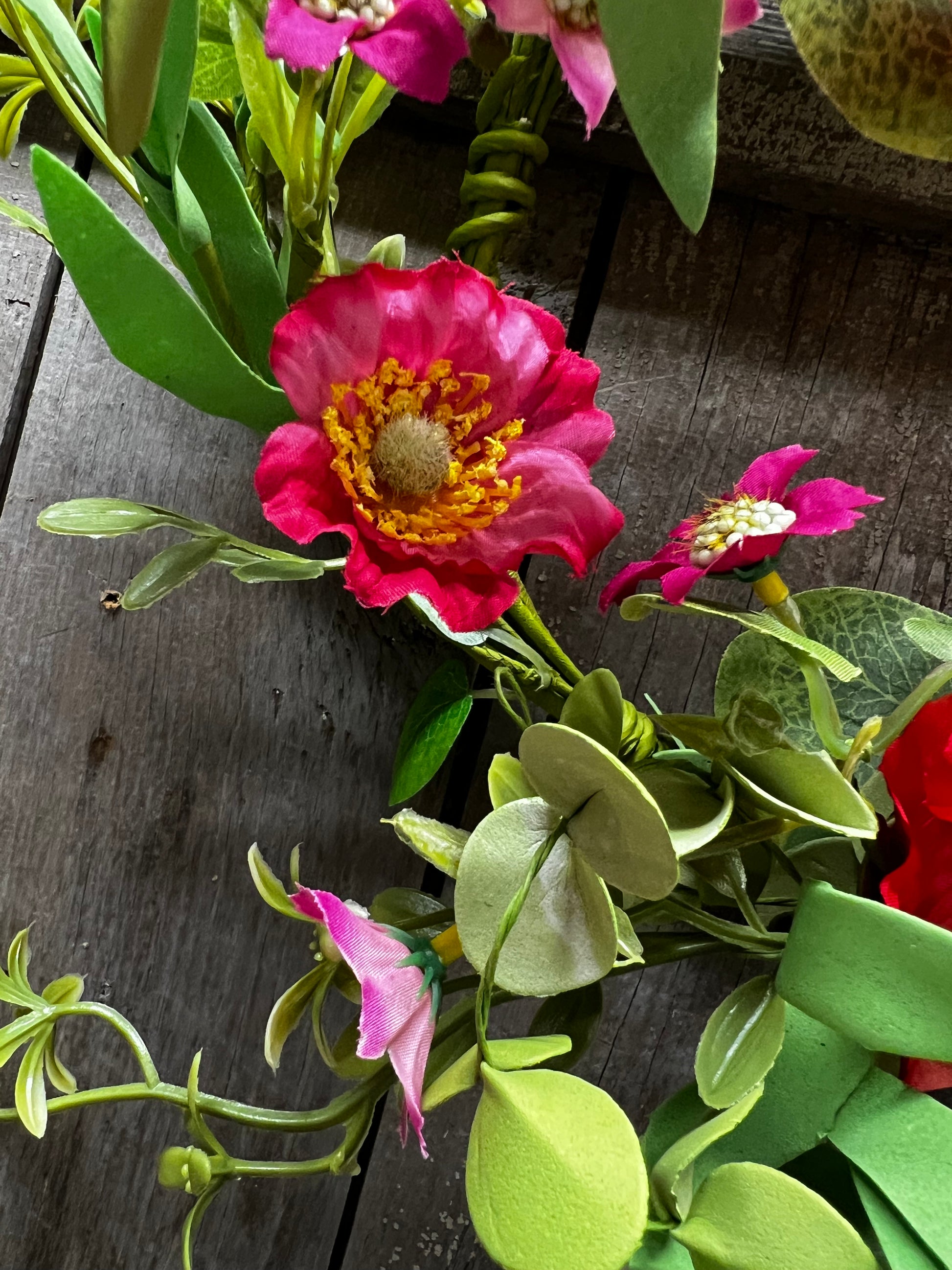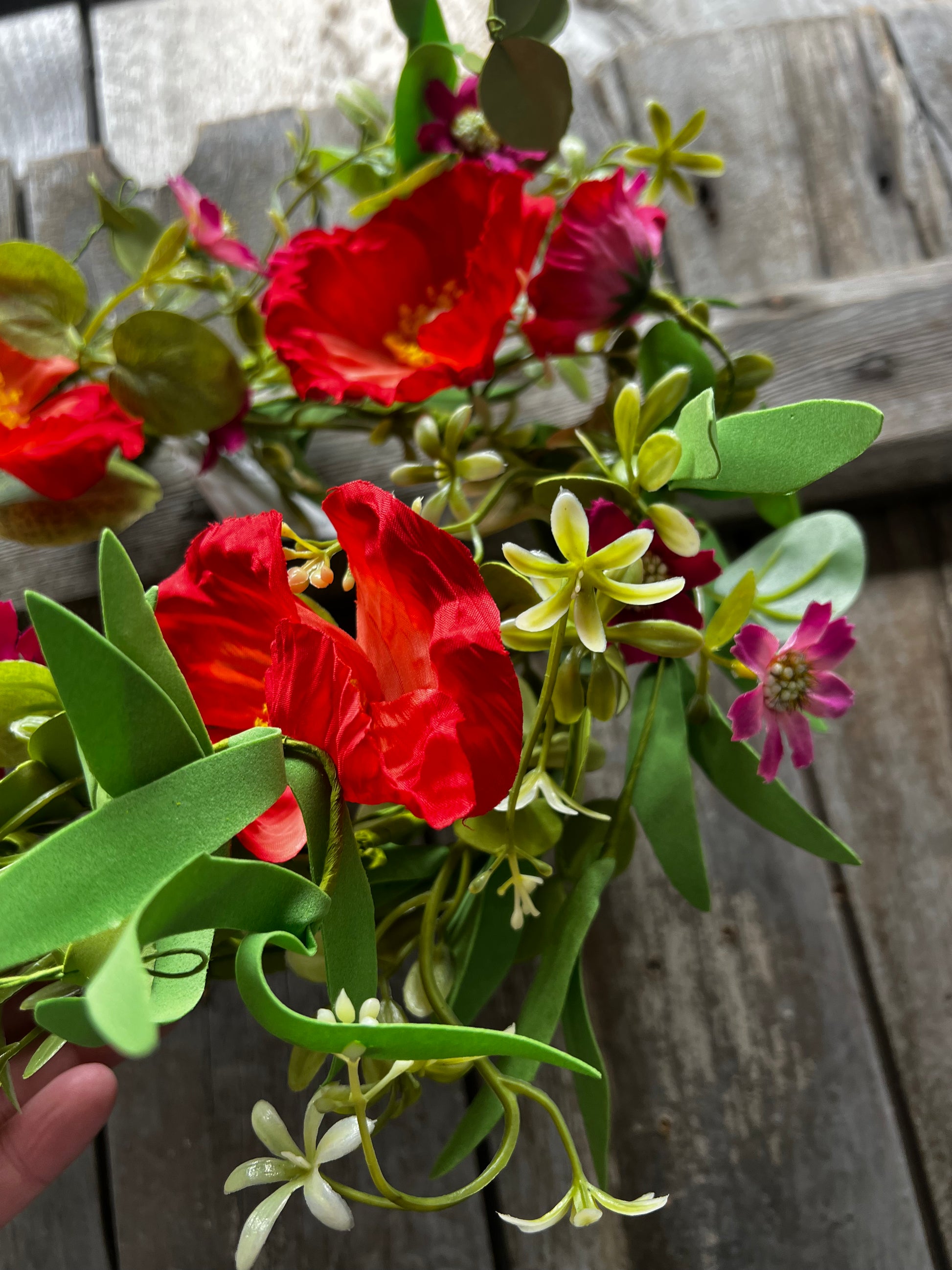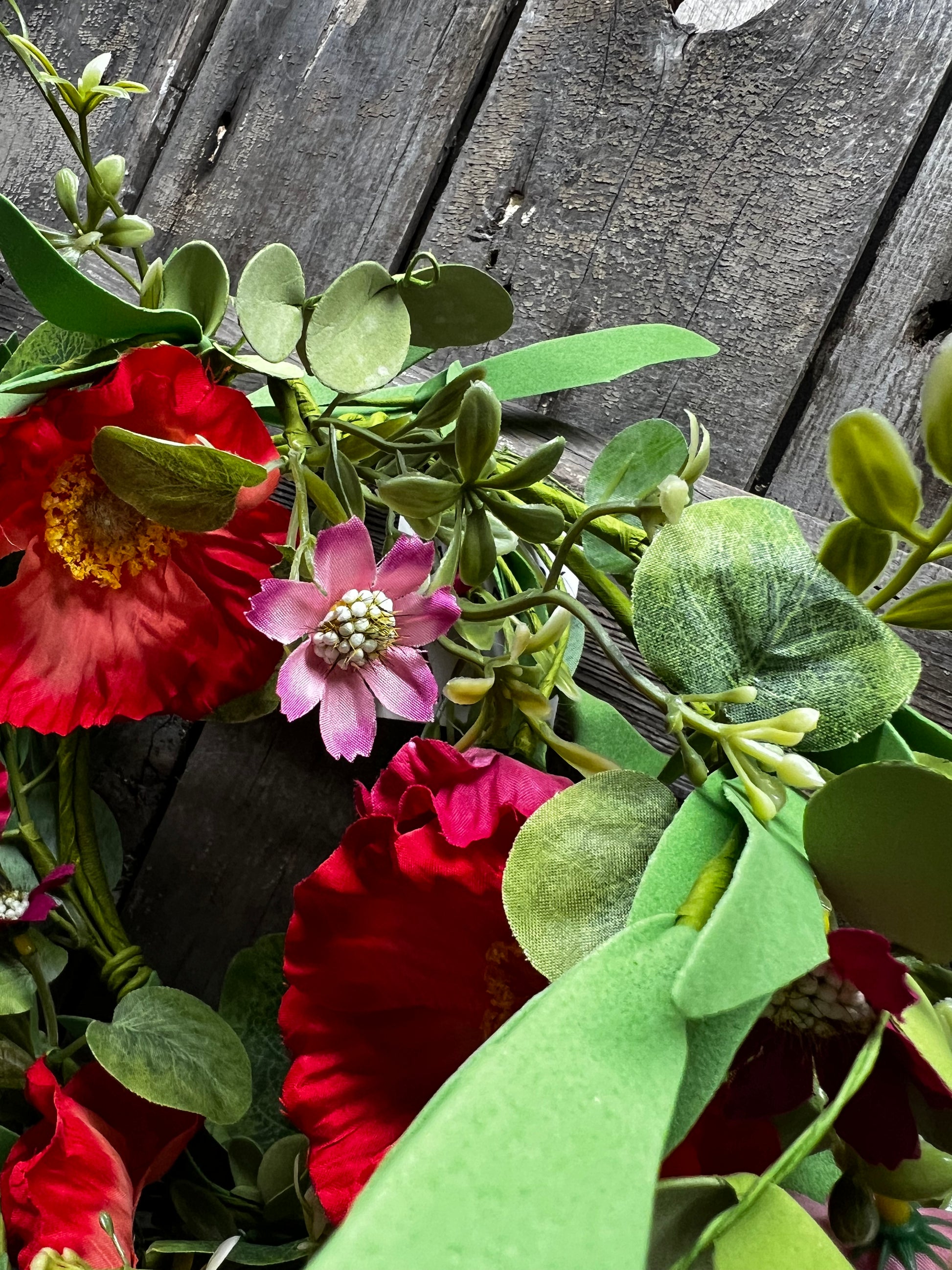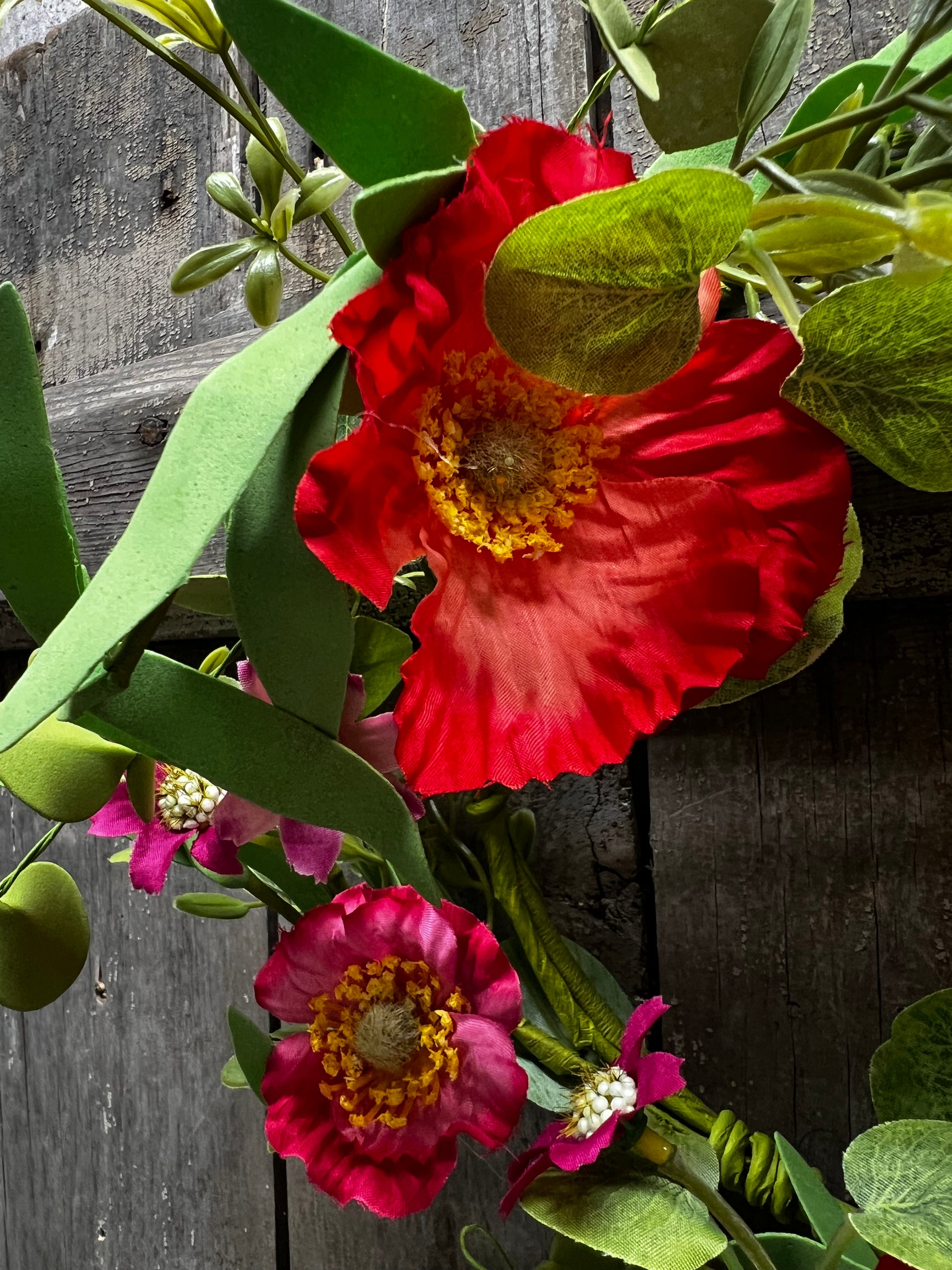 The Sunset Poppy & Wildflower Candle Ring features fresh, colorful design to complete indoor decor. The ring has a green-wrapped base and flexible branches adorned with leaves made from foam and fabric. Dimensional pink and red faux poppies and wildflowers blossom along the ring, accented by small green and white plastic flowers. The voluminous design features a variety of textures for a realistic look. Measures 6.5” inner diameter and approximately 12-14" in outer diameter.