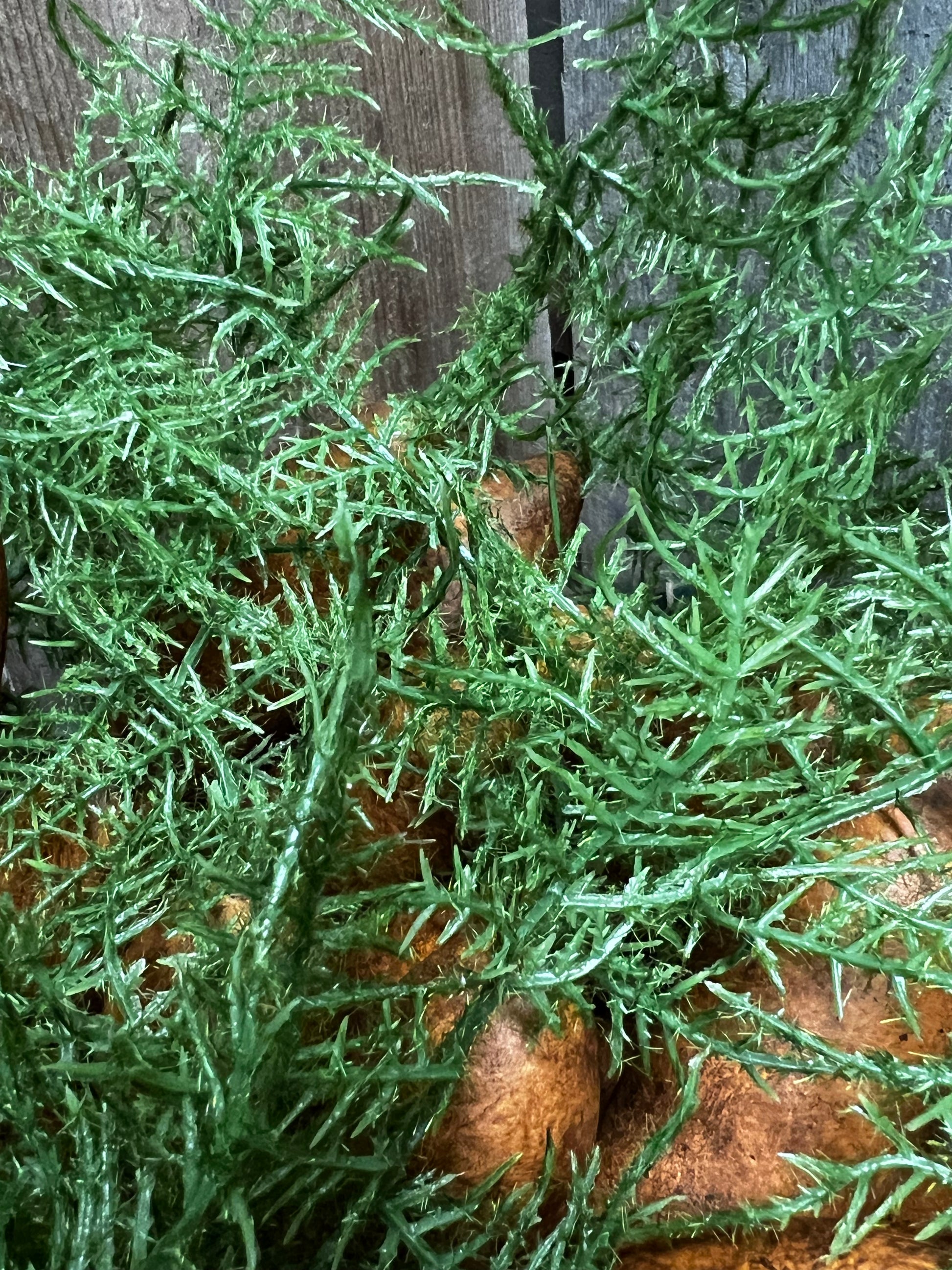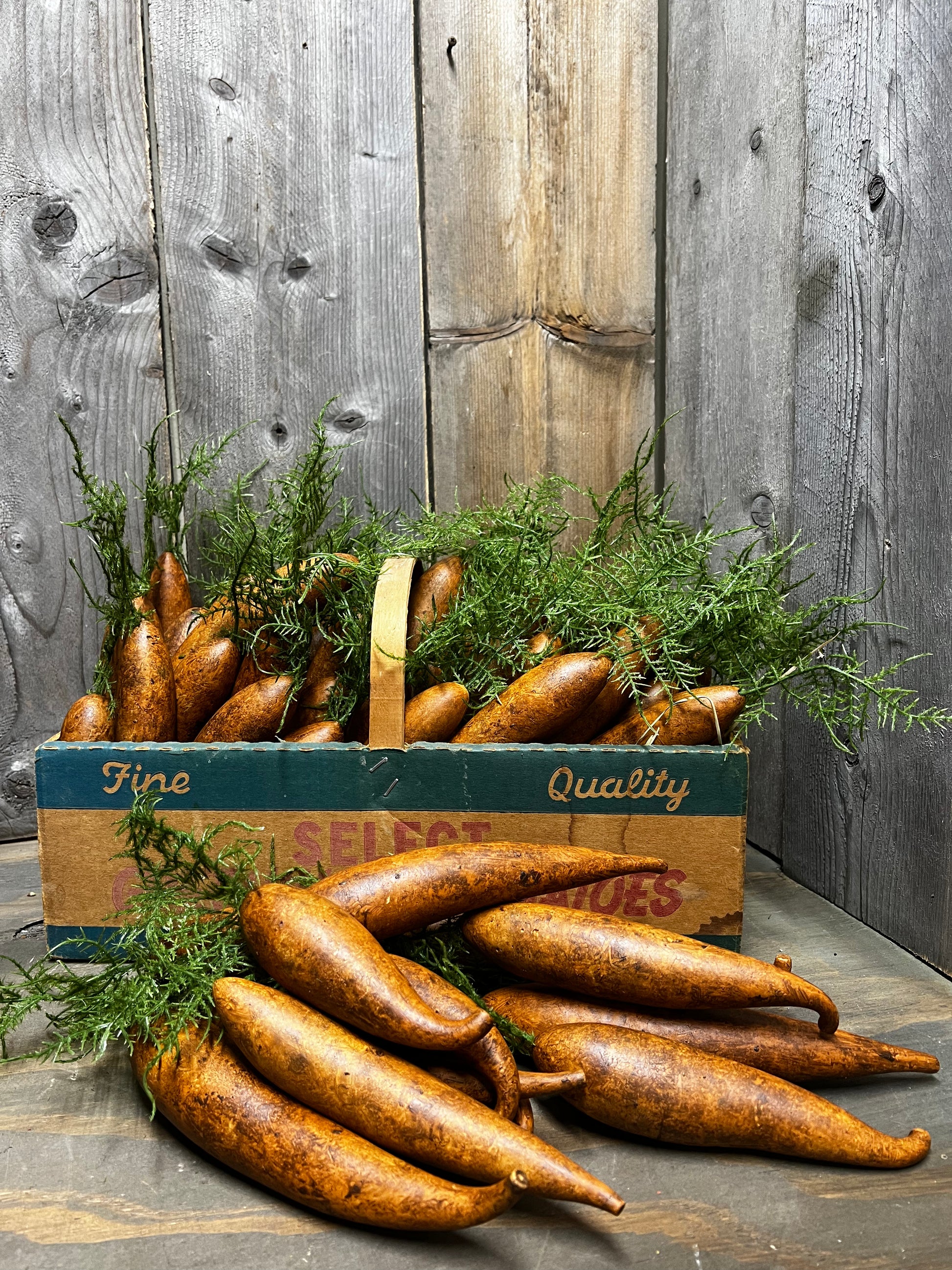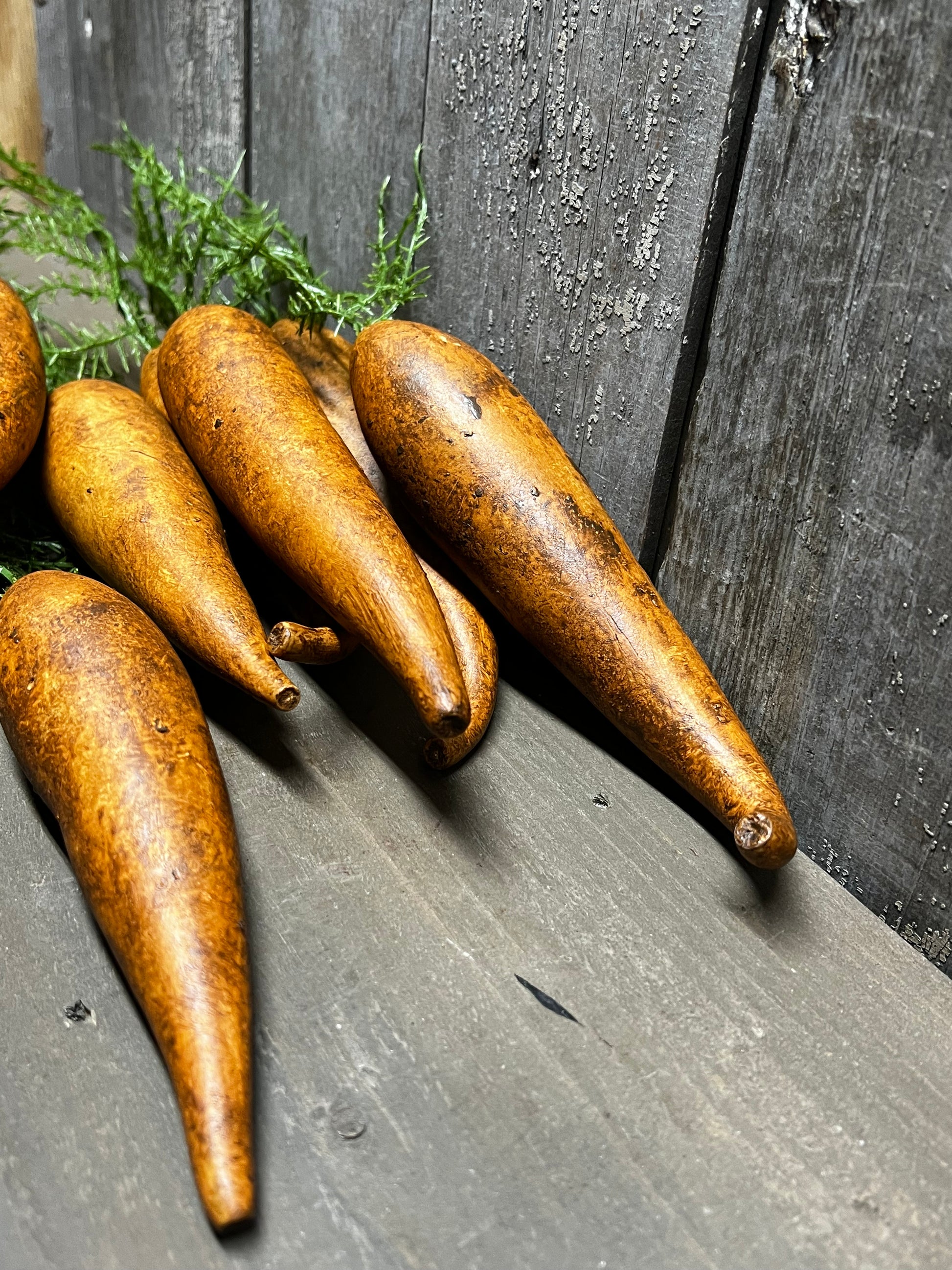 We know you will love our Carrots! Made from painted gourds that have been lightly painted and stained, we added a flocked stem to give them an authentic look. Made from naturally grown and dried gourds so expect variations, marks, holes, twists and curves; every one will be different. Sizes range from 8" to 12" including the stem and if buying multiples we will pull varied sizes. Note...the "shine" on the carrots is a bit brighter due to the camera however they are not dull in look due to the wax finish.