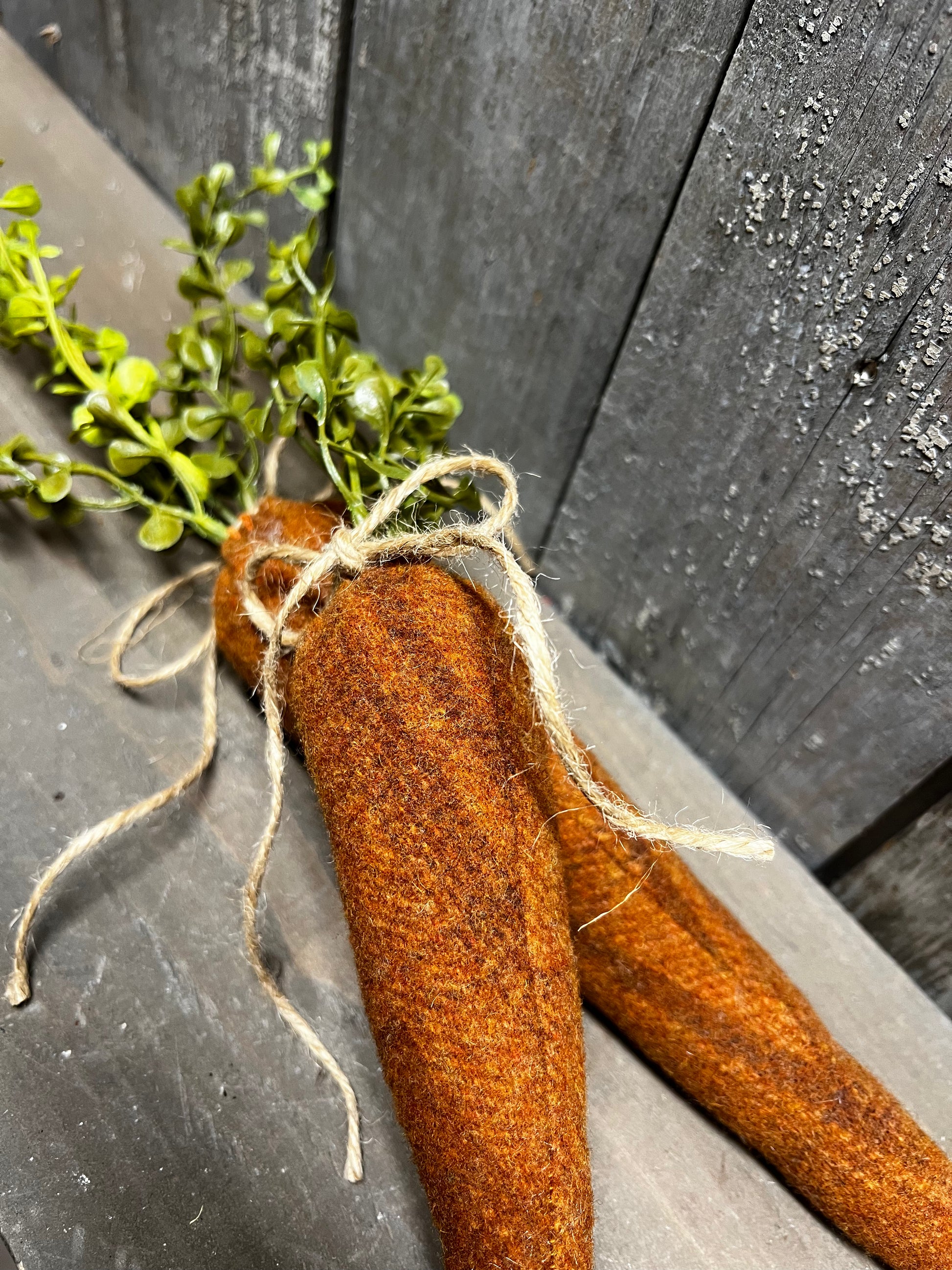 Hand crafted in PA, our wool carrots come in a set of 2. One is 16" and the other 14". Baby Grass stems.