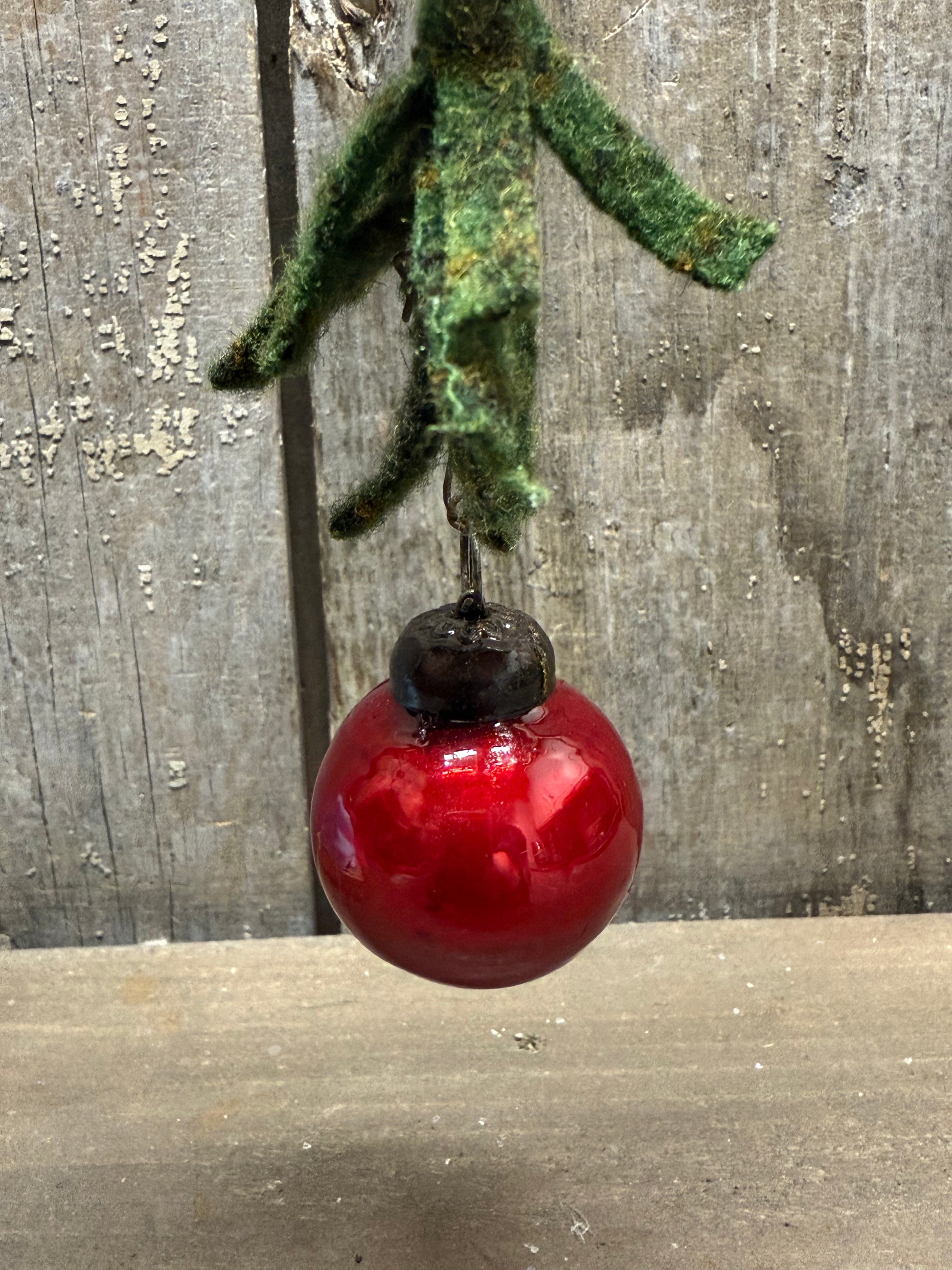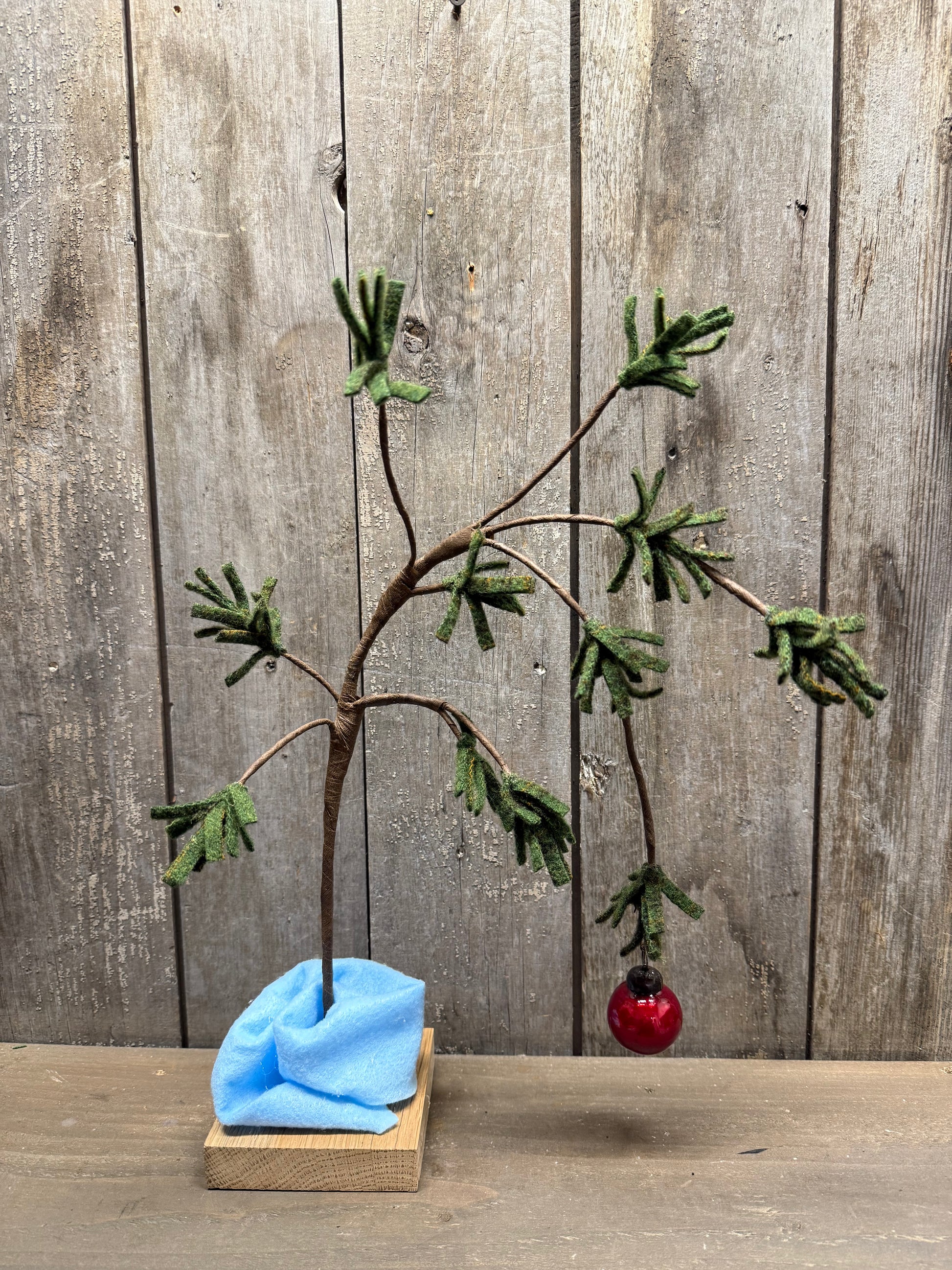 Oh how sweet! Locally crafted from wool, this whimsical cartoon favorite tree is about 15" tall and has a felt blue blanket wrapped around the wood base. A red glass ball hangs from the branch. Each branch and pine sprig is wrapped by hand, so each tree may differ a bit.