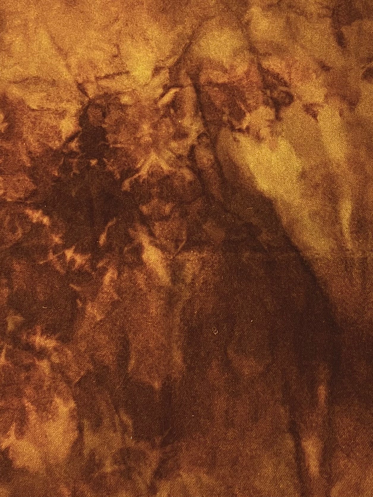 A mixture orange, yellow, rust and brown mixed together in an almost tie-dye pattern. Lots of interest, movement and texture. Dyed on Natural wool, no pattern.
