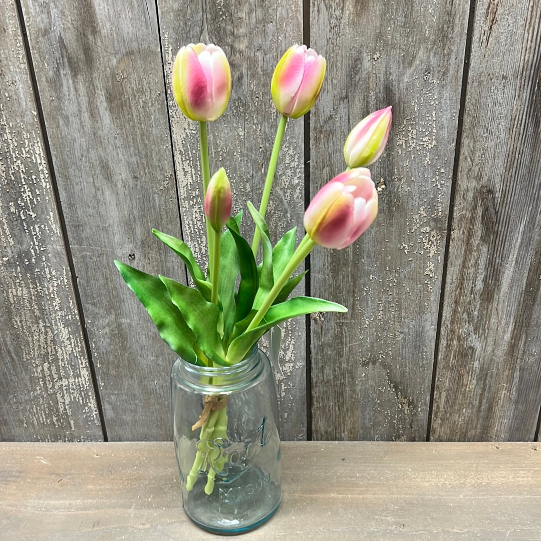 Are they real? It's so hard to tell. Our Real Feel Tulips come in a set of 5 Tulips of varied sizes, lending to an authentic look. Long 15.5" stems, look great in jars, jugs, vases, baskets and more. Both the leaves and the blooms are made from a soft bendable plastic, not foam or sponge, creating a look and feel you will love.