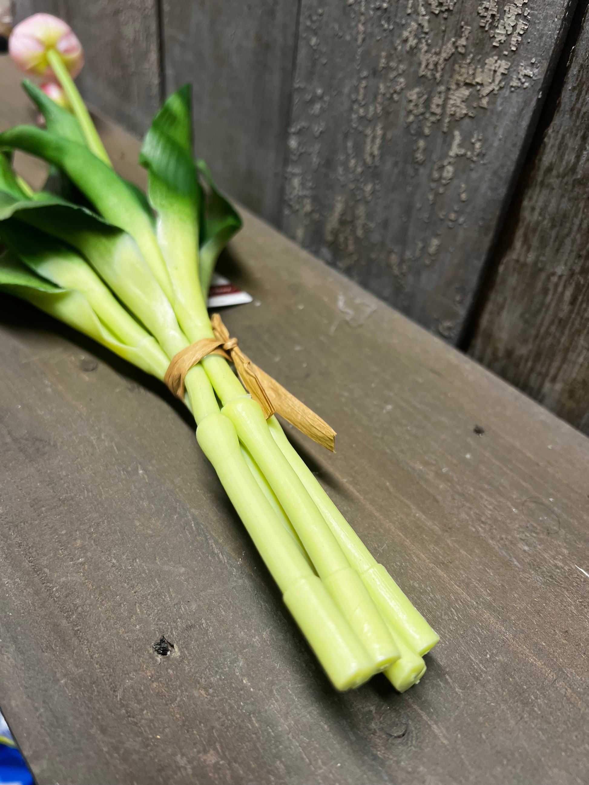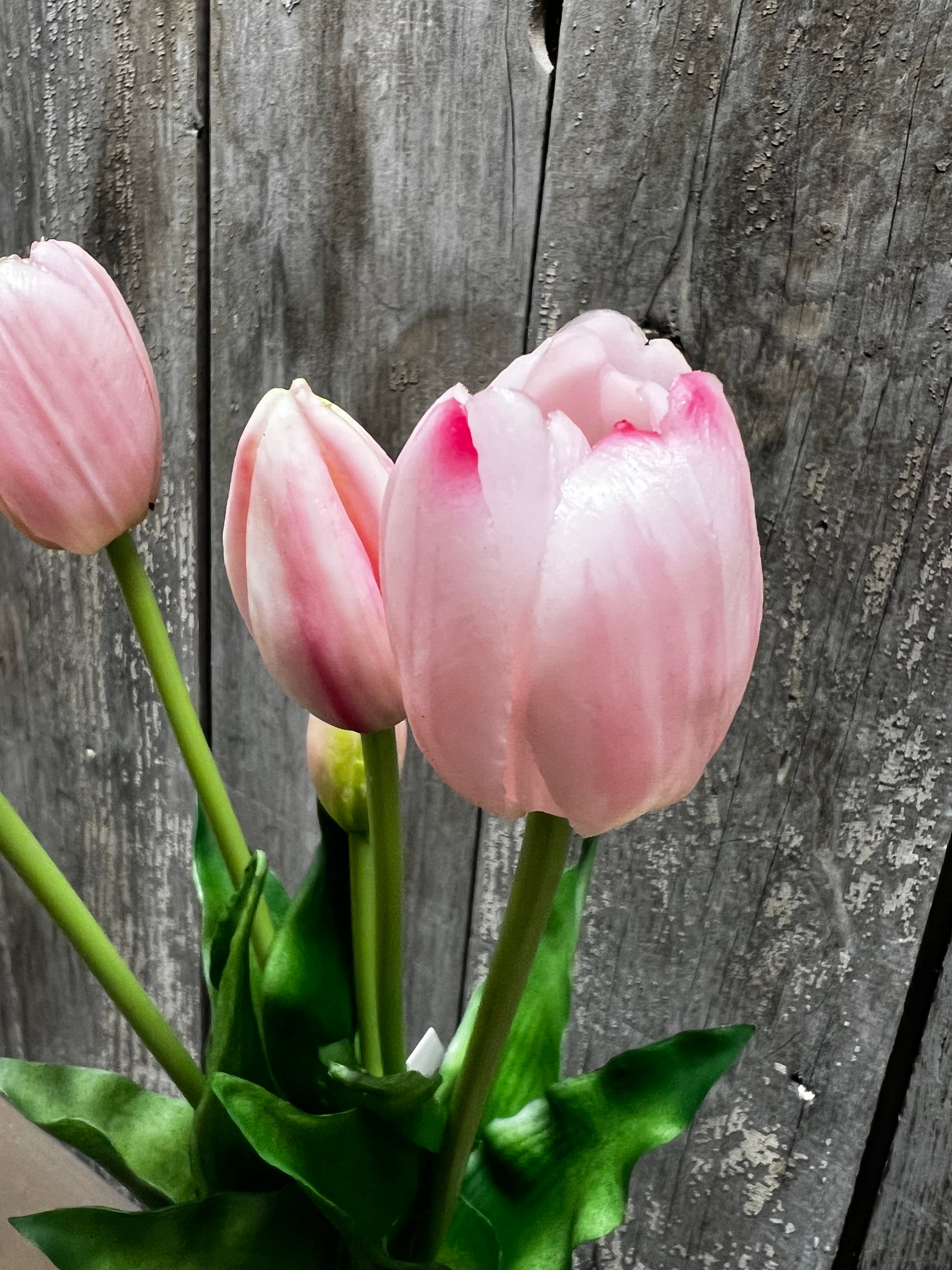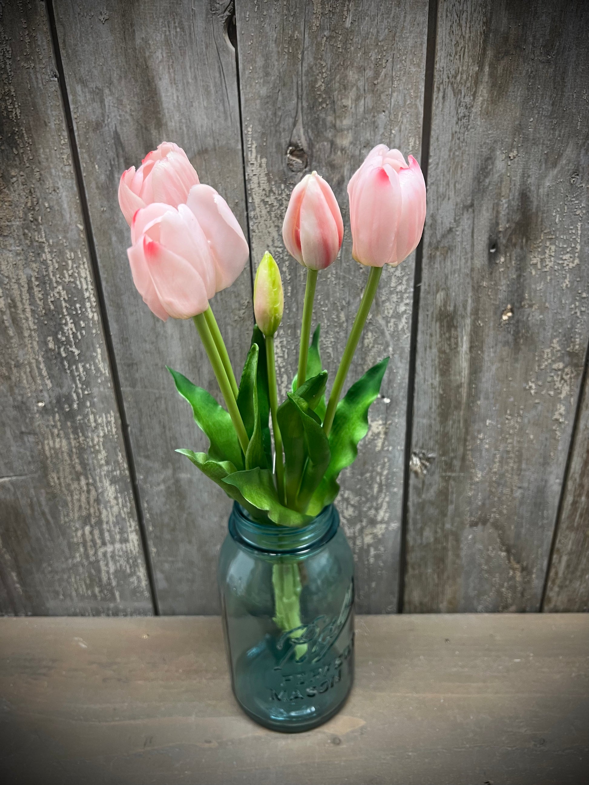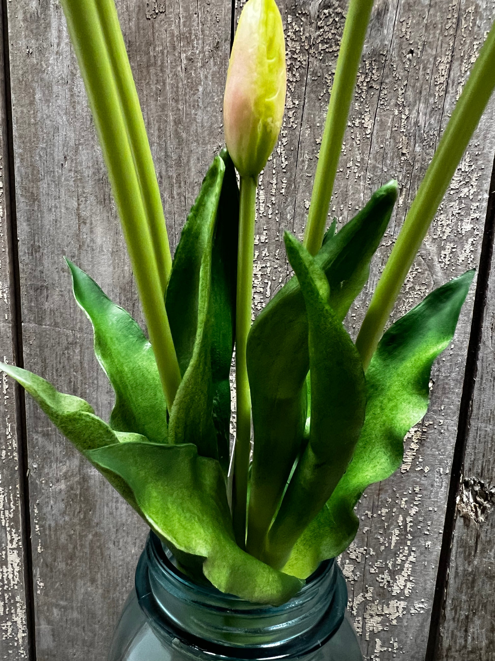 Are they real? It's so hard to tell. Our Real Feel Tulips come in a set of 5 Tulips of varied sizes, lending to an authentic look. Long 16" stems, look great in jars, jugs, vases, baskets and more. Both the leaves and the blooms are made from a soft bendable plastic, not foam or sponge, creating a look and feel you will love.