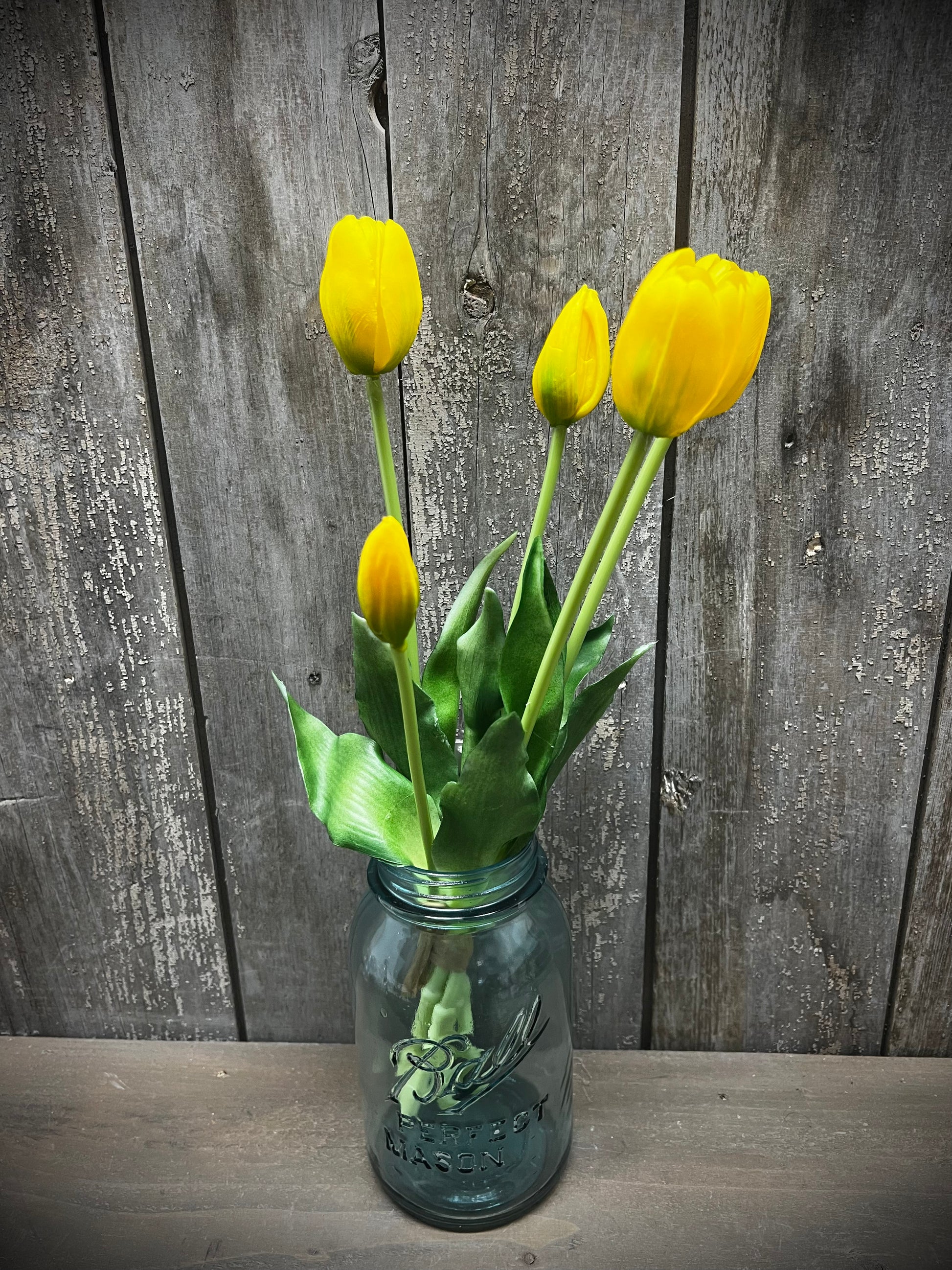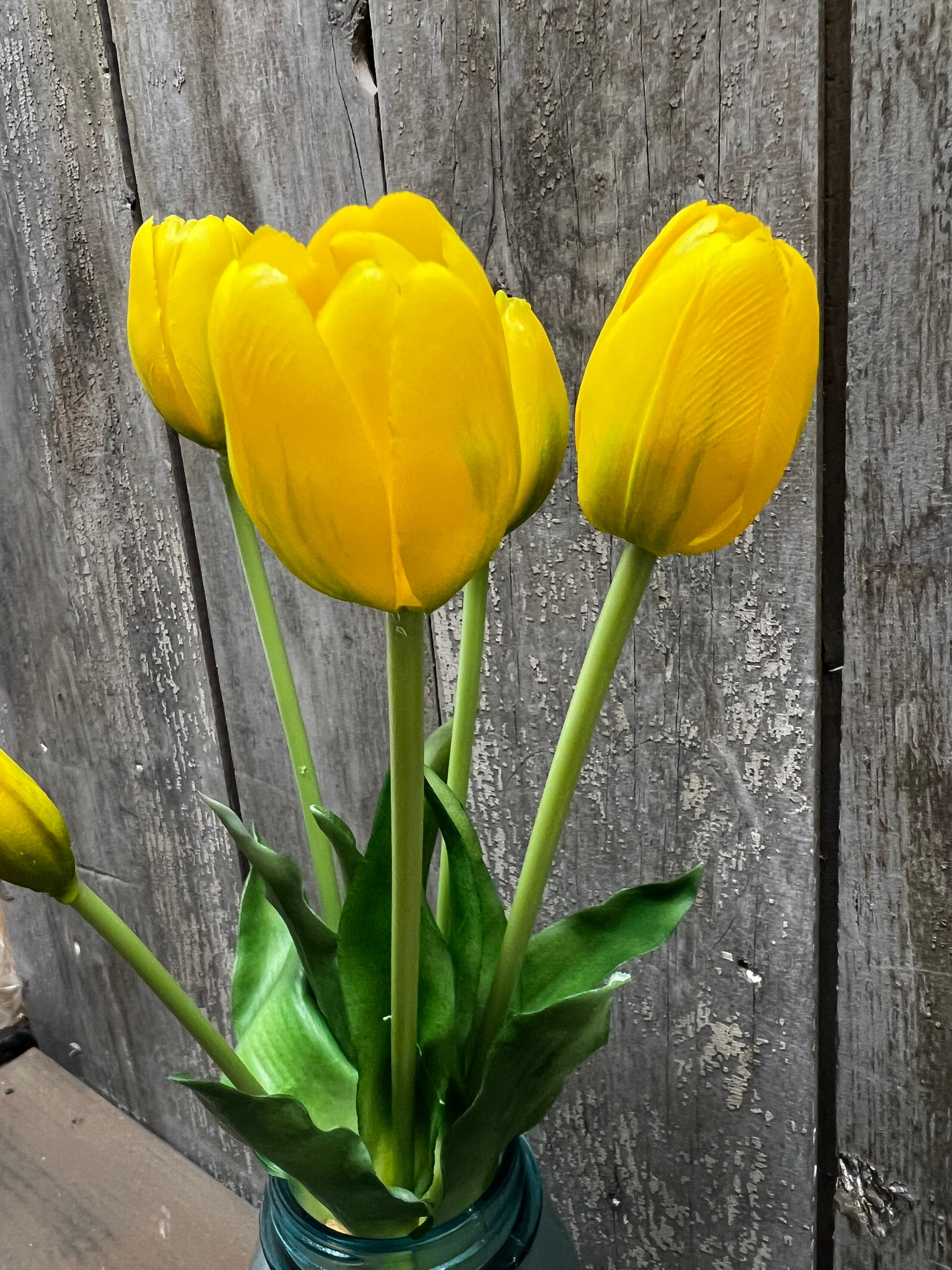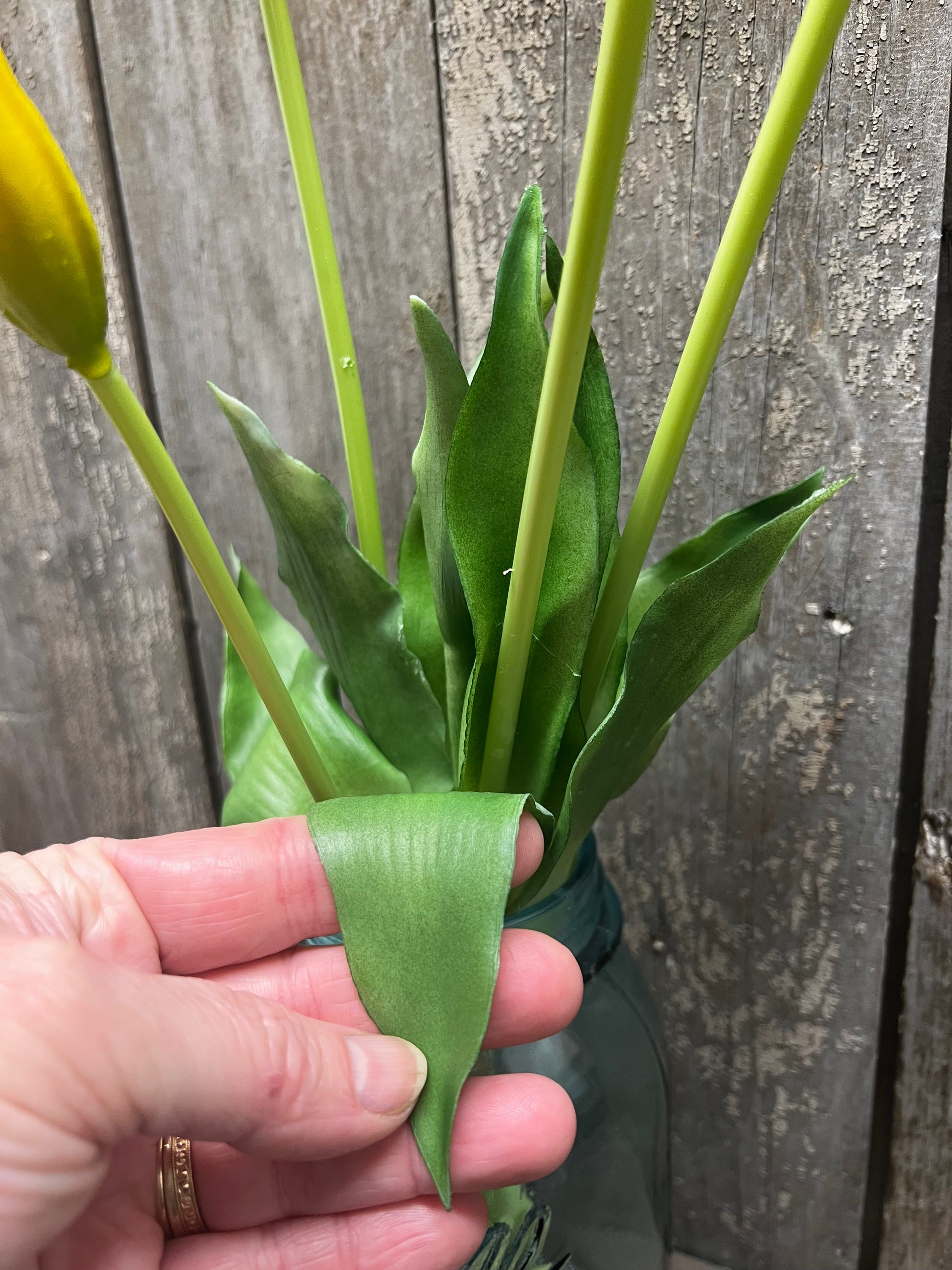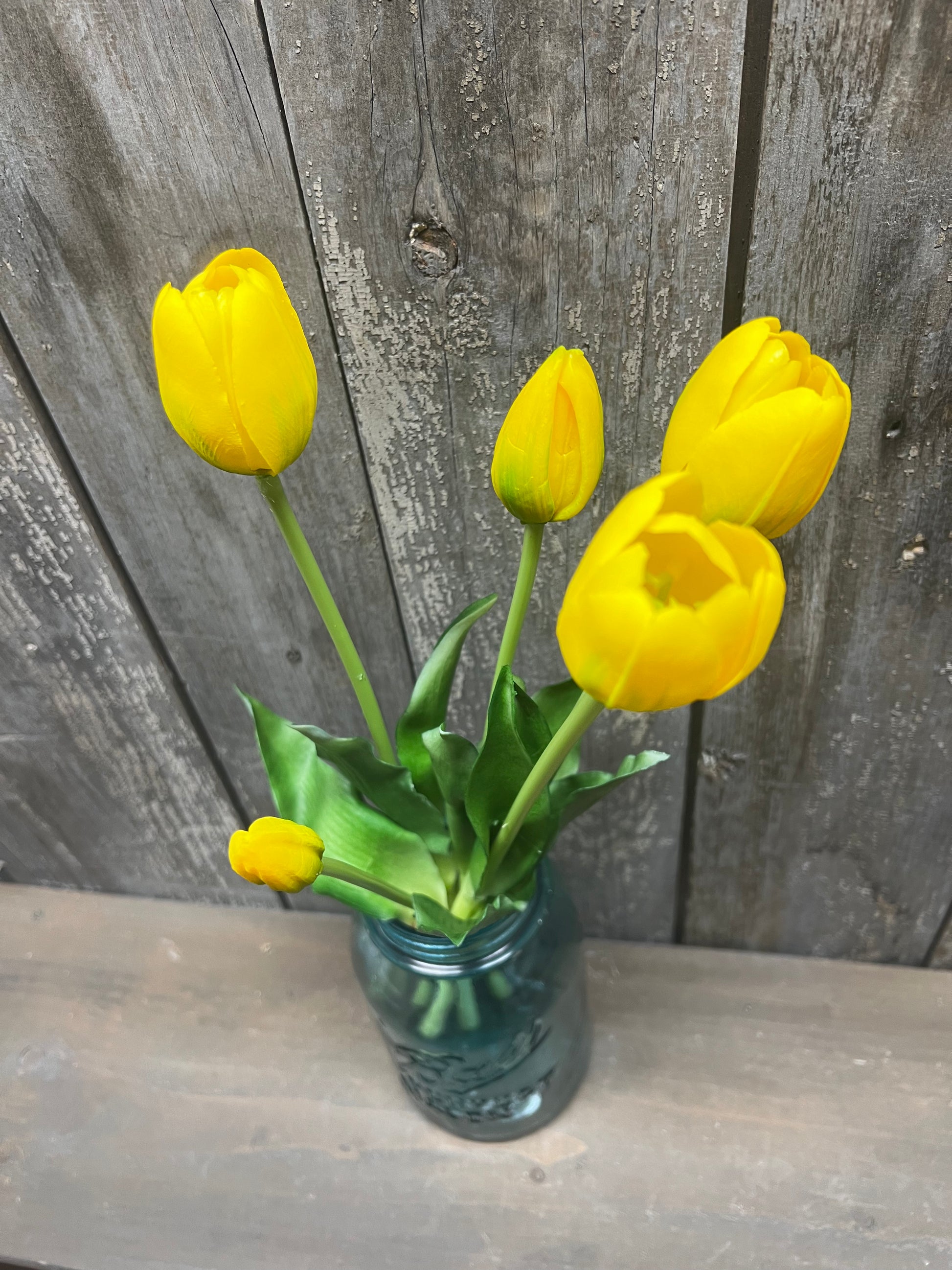 Are they real? It's so hard to tell. Our Real Feel Tulips come in a set of 5 Tulips of varied sizes, lending to an authentic look. Long 16" stems, look great in jars, jugs, vases, baskets and more. Both the leaves and the blooms are made from a soft bendable plastic, not foam or sponge, creating a look and feel you will love.