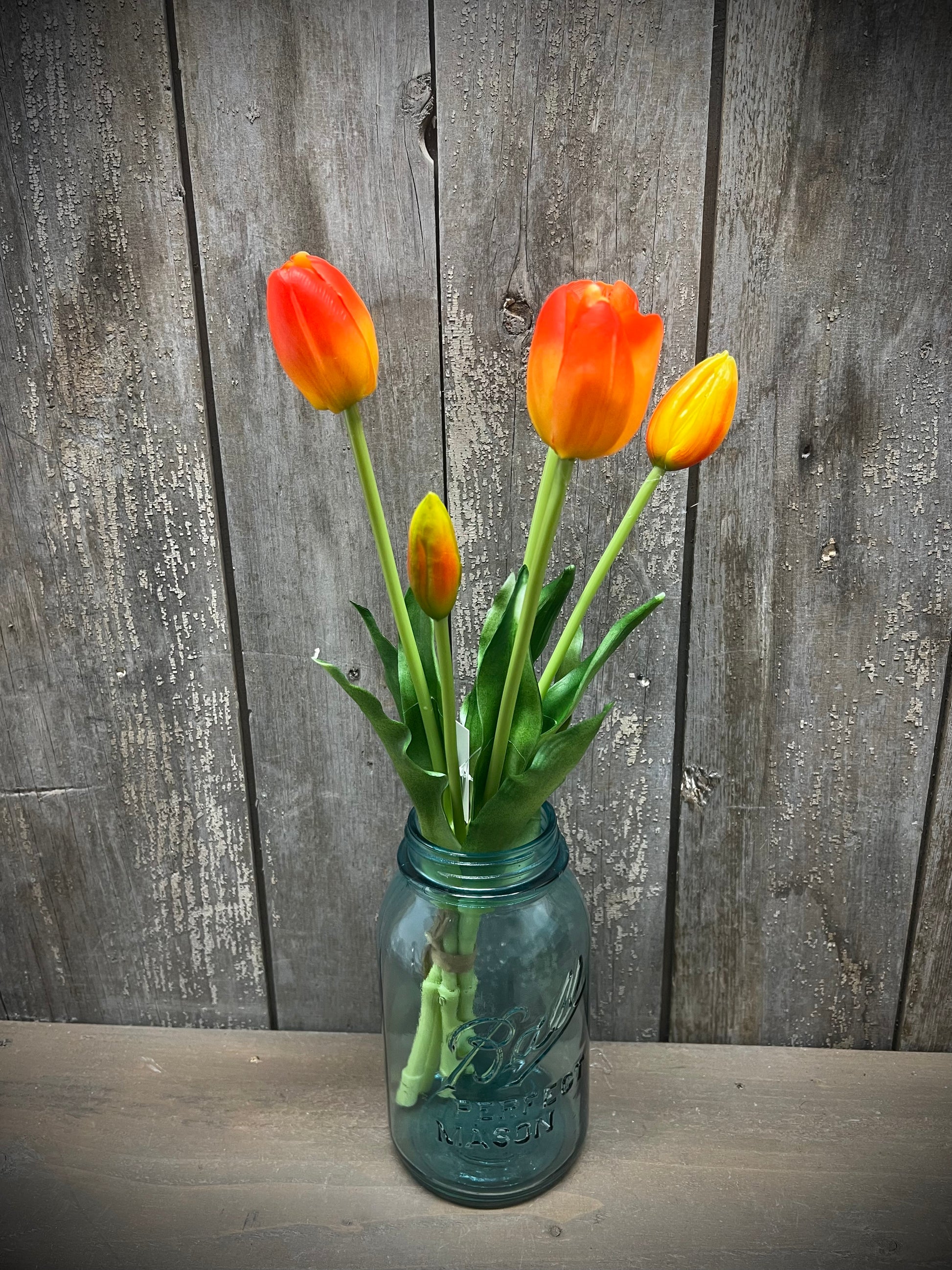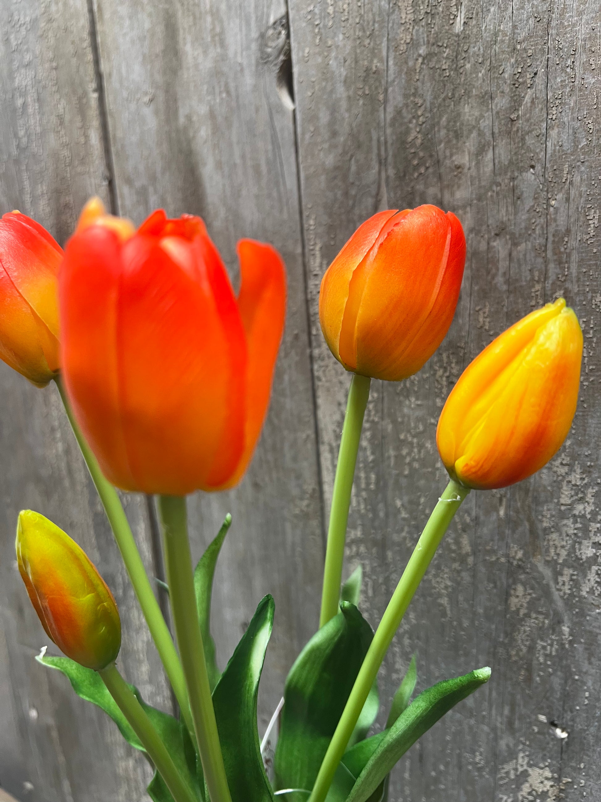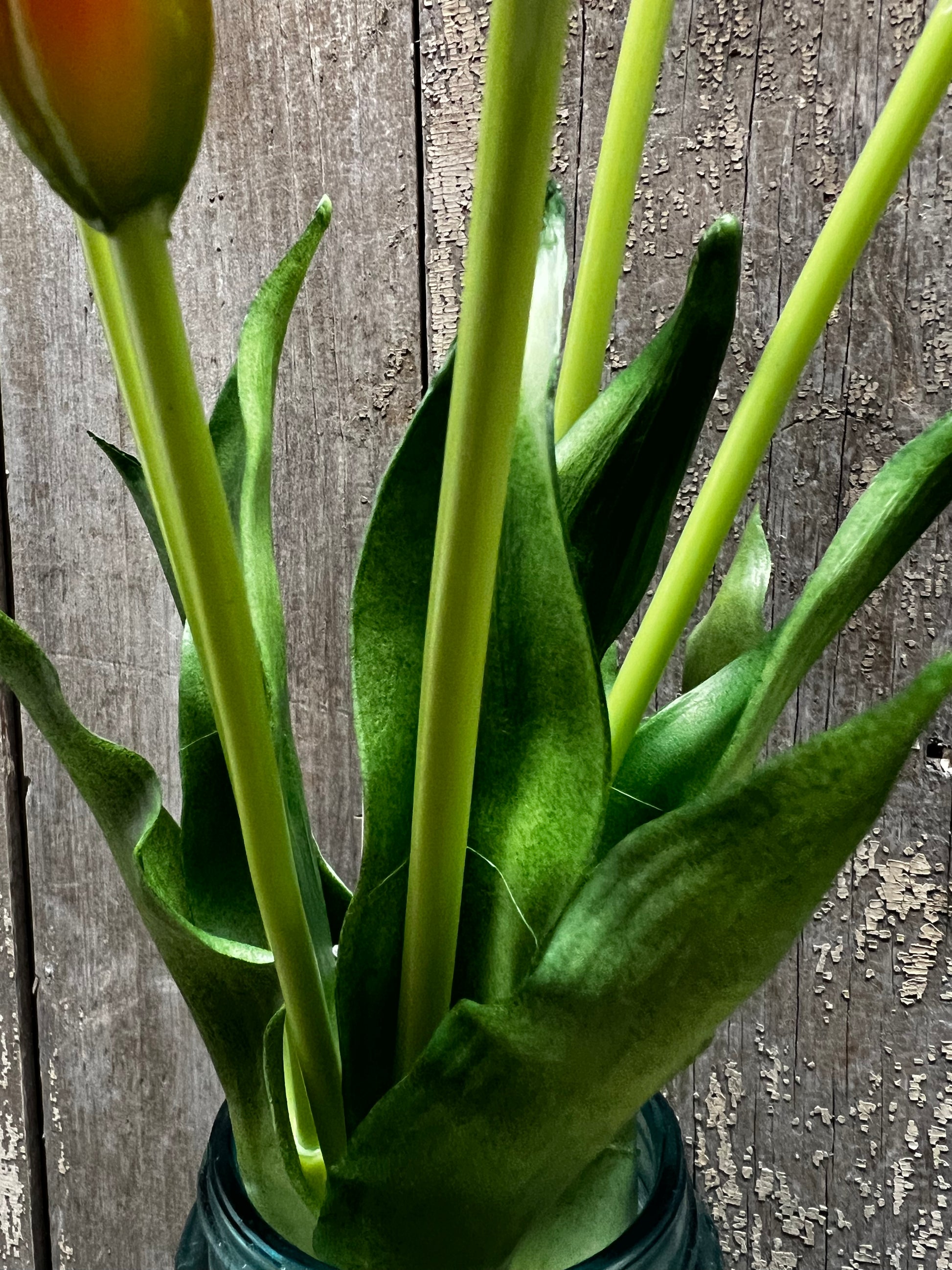 Are they real? It's so hard to tell. Our Real Feel Tulips come in a set of 5 Tulips of varied sizes, lending to an authentic look. Long 16" stems, look great in jars, jugs, vases, baskets and more. Both the leaves and the blooms are made from a soft bendable plastic, not foam or sponge, creating a look and feel you will love.