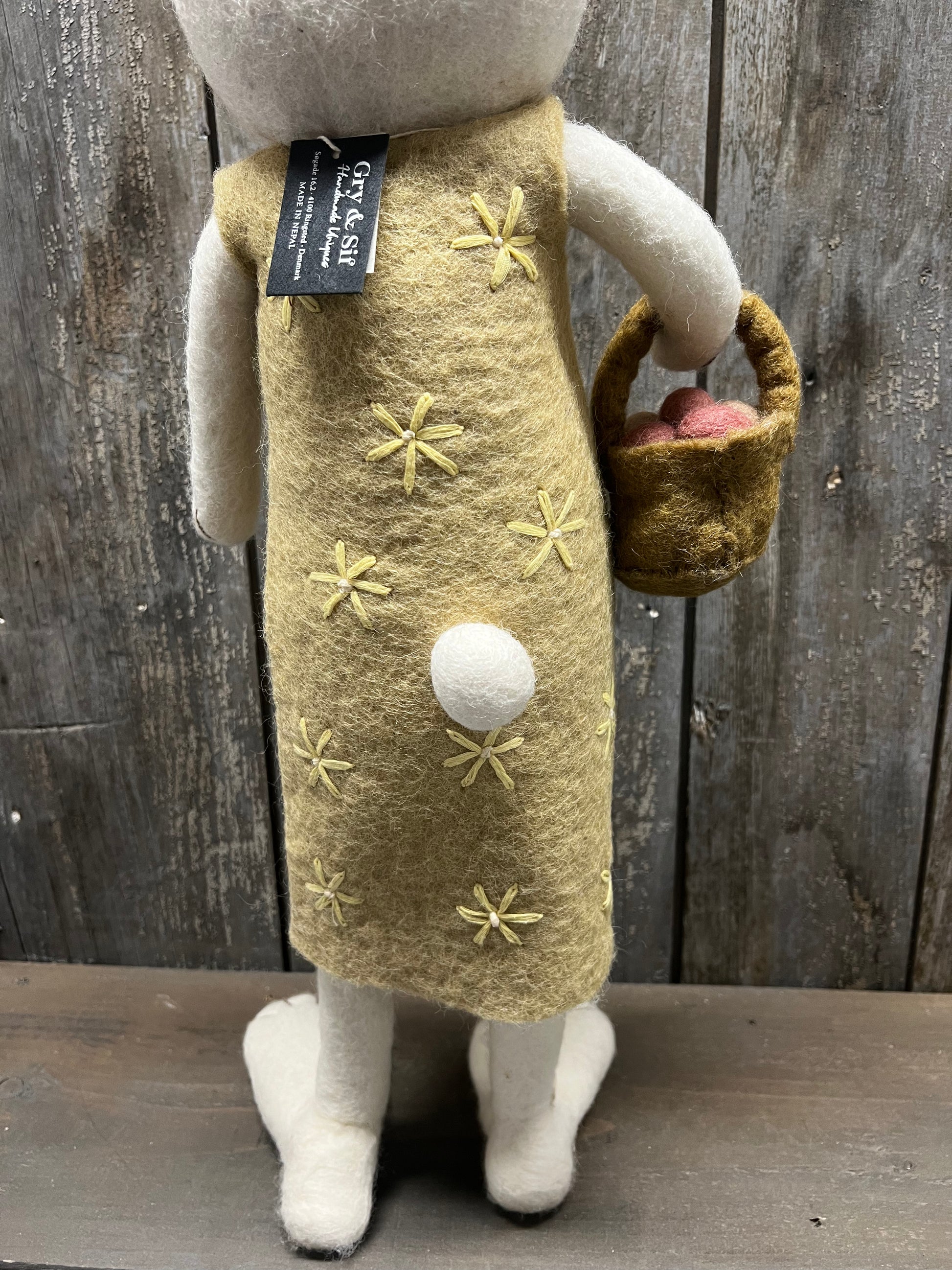 How sweet! This pretty gal wears a yellow embroidered dress and holds a basket of eggs felted from pure natural wool from New Zealand. Uniquely hand crafted in Nepal. Stands about 24" tall and is also posable.