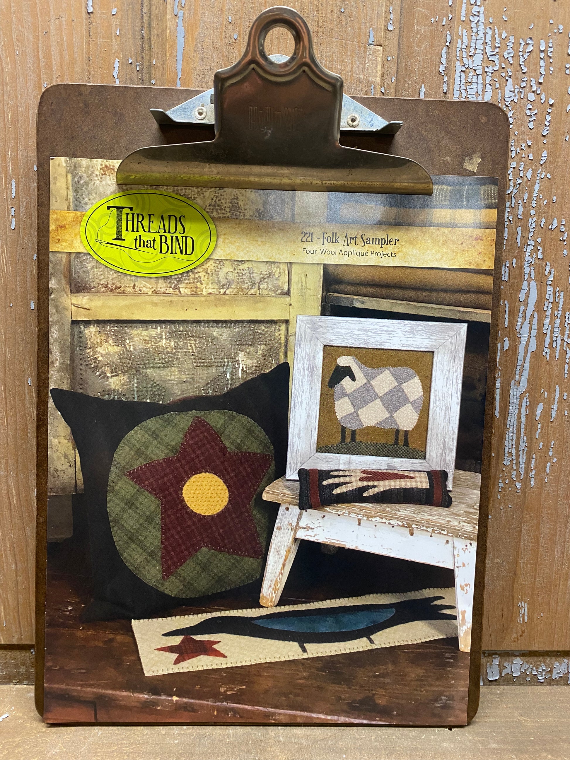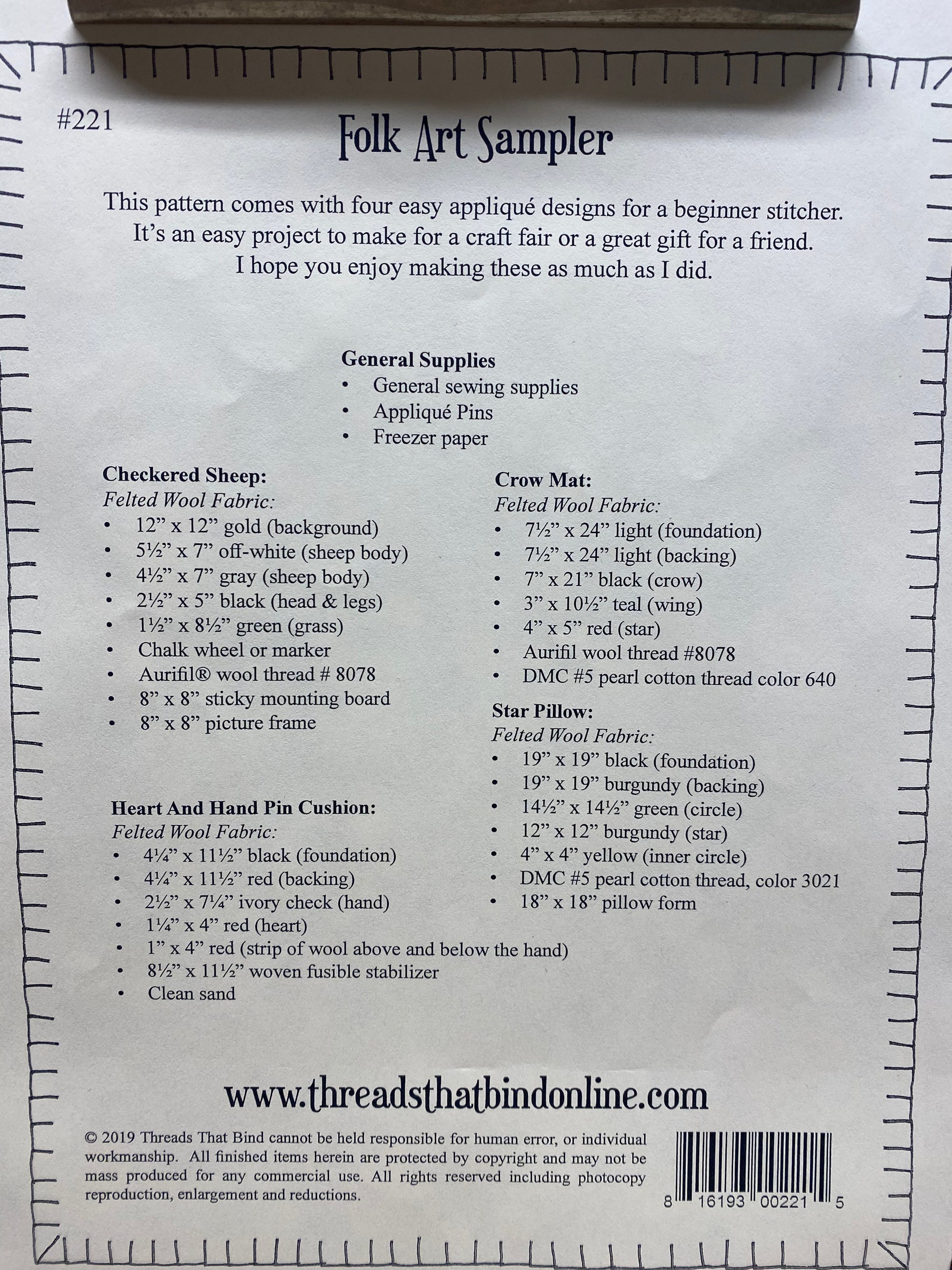 This pattern comes with four easy appliqué designs for a beginner stitcher. Paper patterns included in this package are a checkered sheep (8"x8"), crow mat (7.5" x 24"), heart and hand pin cushion (4.25" x 11.5") and a star pillow (18" x 18")