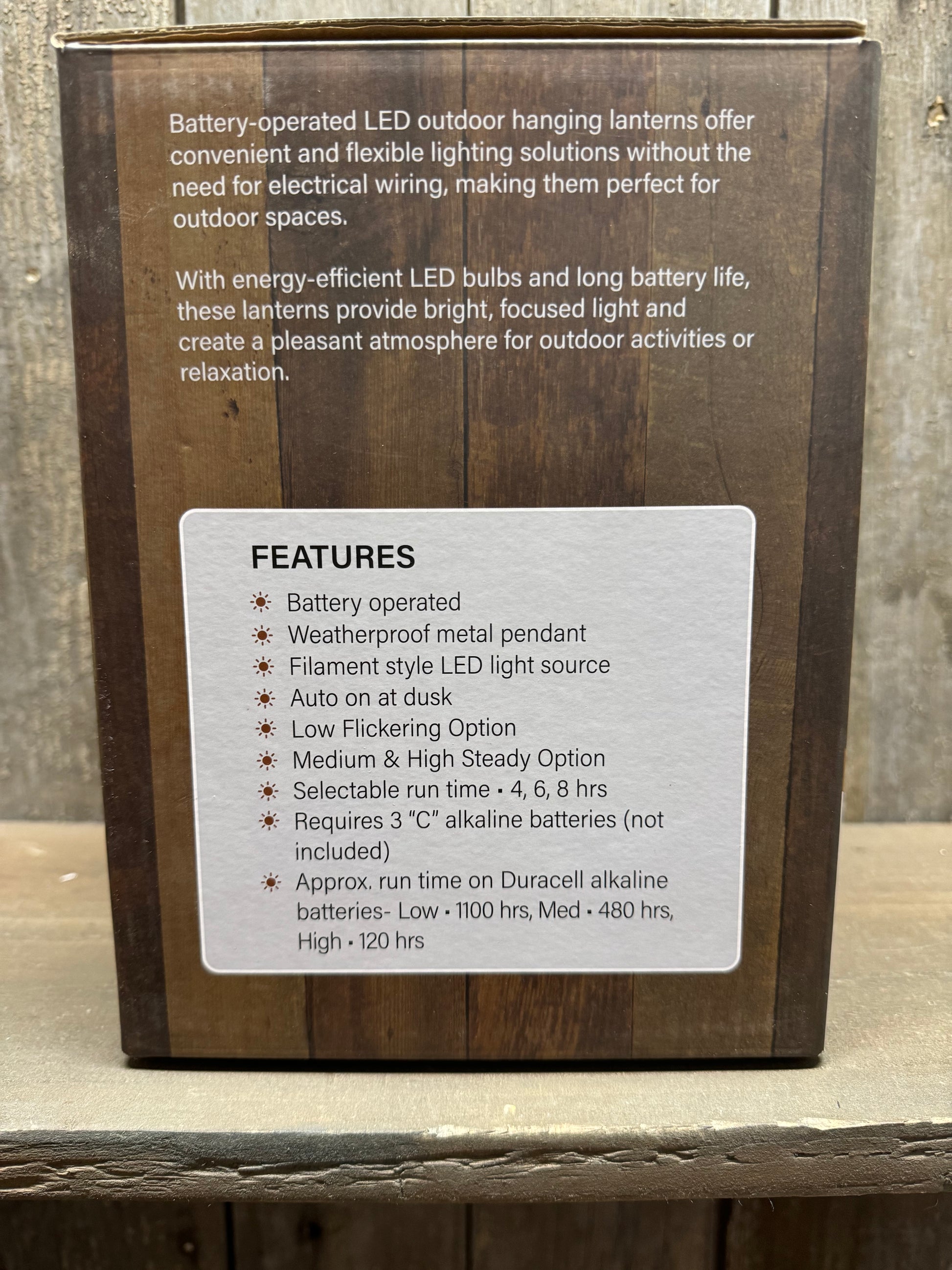 What a beautiful, weatherproof, Lantern with so many great features. Similar to the Hanging Lantern in this style, this option is a bit smaller and will sit as well. Use it on an outdoor table or bench, or inside as a night light or centerpiece. This decorative metal pendant has a lovely vintage look and the Filament style LED light source eliminates the need for bulb replacement. It will automatically turn on at DUSK and has both a 4/6/8 hour TIMER and H/M/L BRIGHTNESS setting. Using 3 "C" Duracell Alkaline batteries (not included), you will have approximately 1100 hours on Low, 480 hours on Medium and 120 hours on High. Other battery brands may differ. Your lantern will light at Dusk and stay on for 4, 6 or 8 hours using the selectable Timer switch.