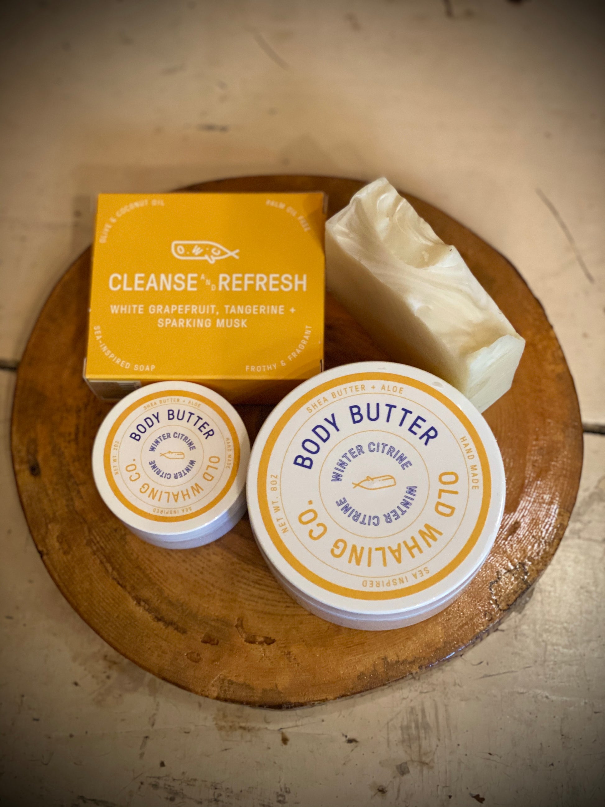 The 8 ounce body butter is perfect for bathrooms and bedside tables, the 2 ounce is the right size for travel and the 5 ounce handcrafted soap bar is perfect for the start of the new year, this fragrance blends a bright citrus scent with subtle hints of a comforting musk and amber blend.