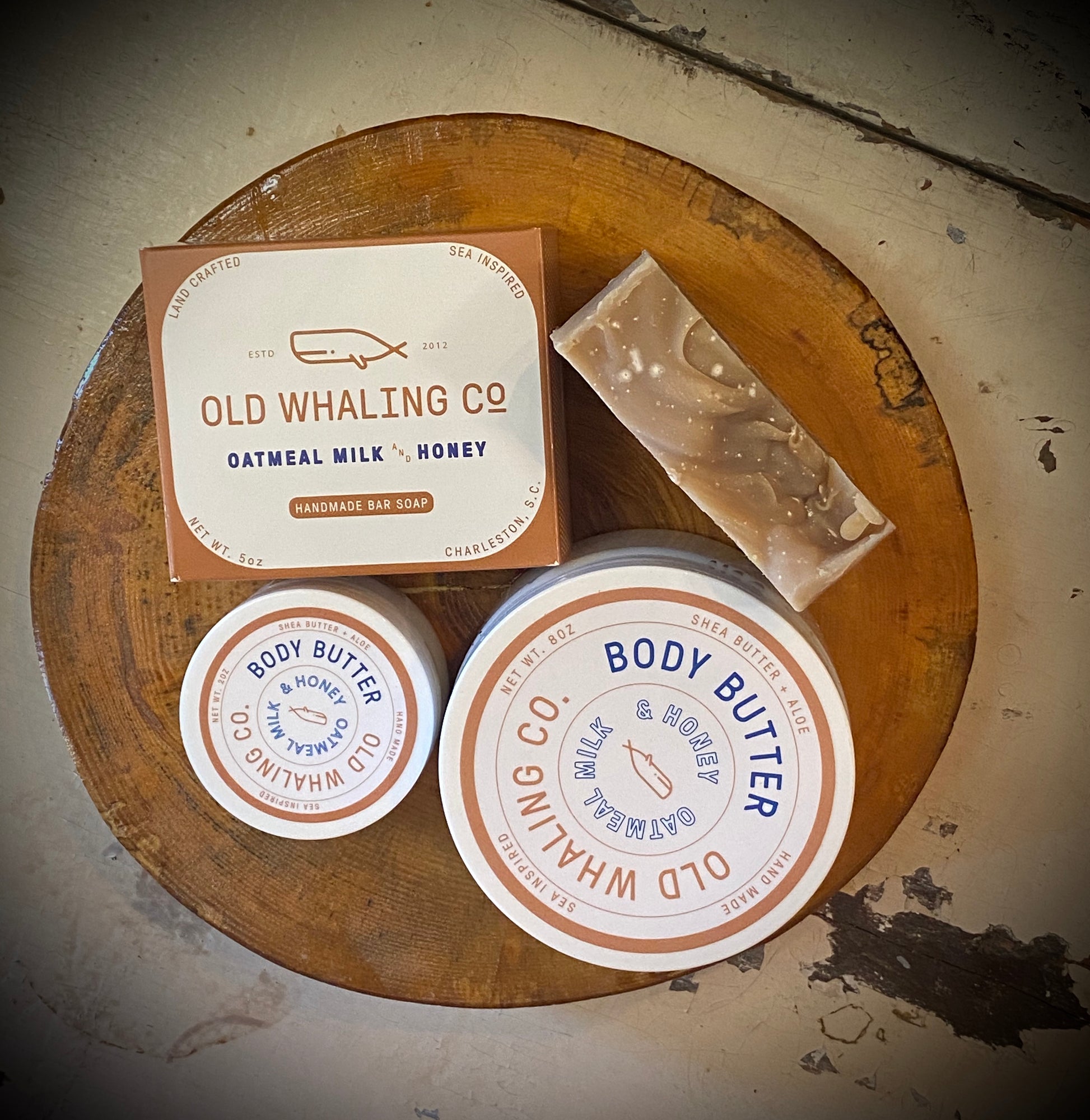 The 8 ounce body butter is perfect for bathrooms and bedside tables, the 2 ounce is the right size for travel and the 5 ounce handcrafted soap bar moisturizes the skin with creamy goat’s milk and golden honey, while gently exfoliating with soothing oatmeal.