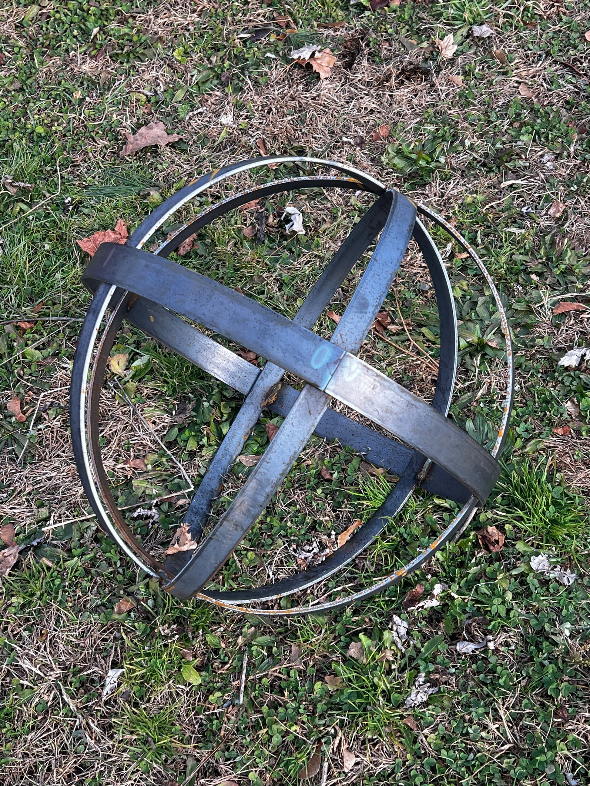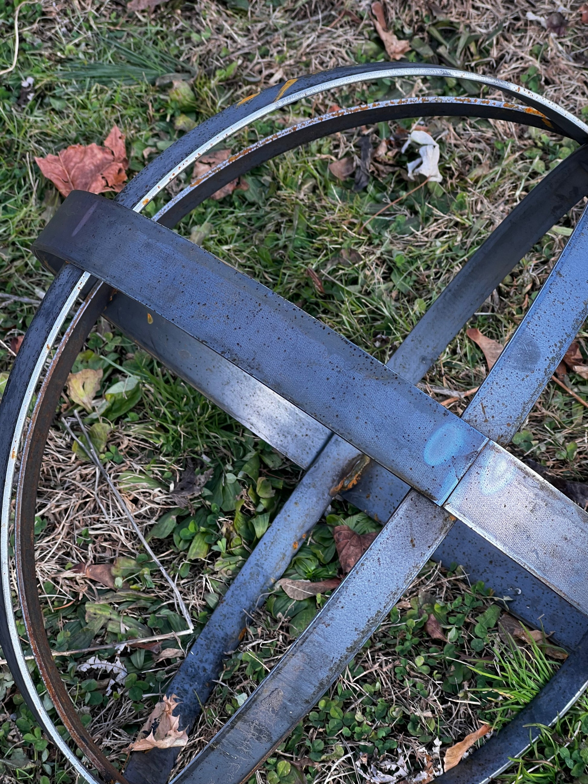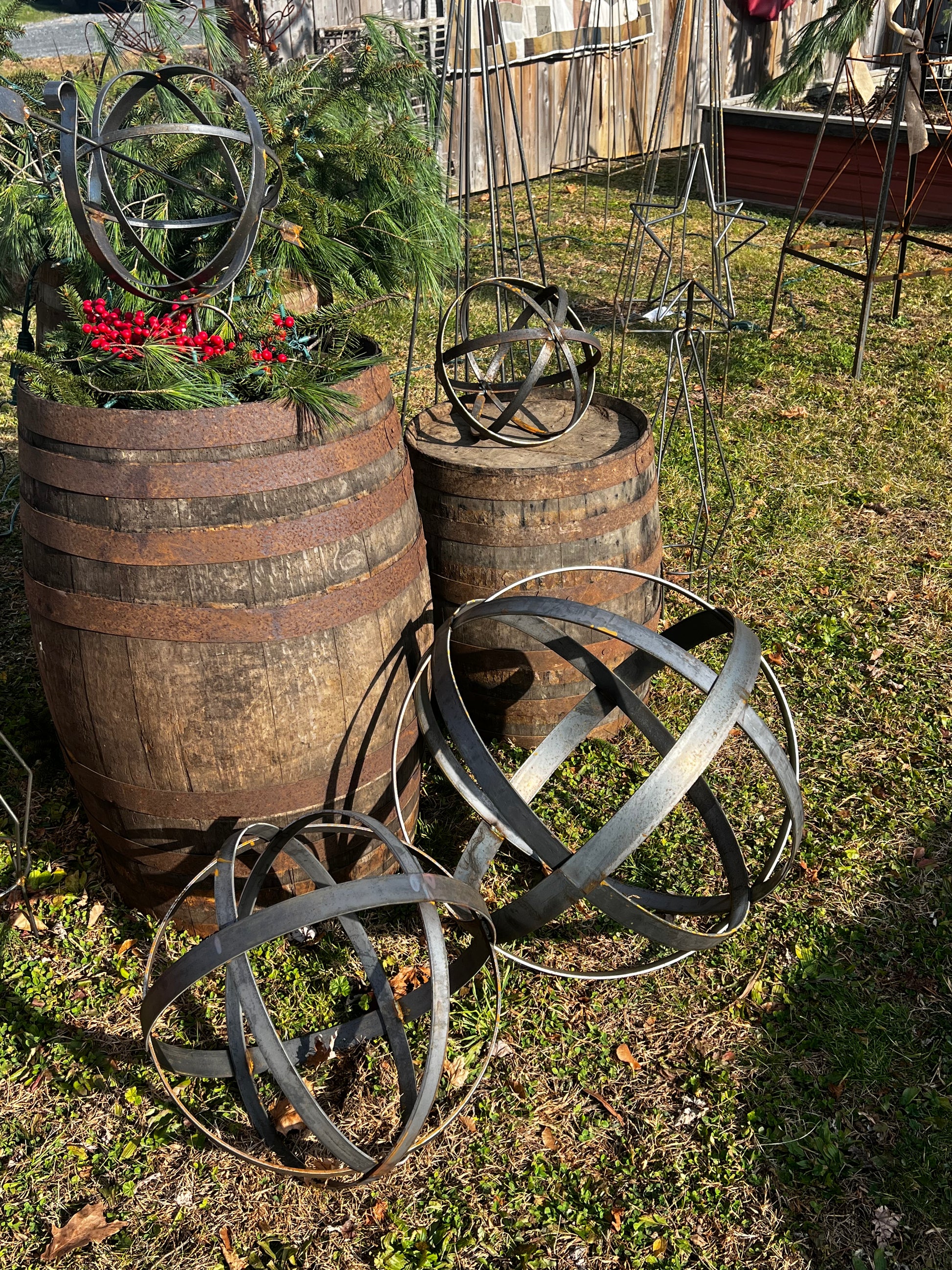 Add interest to your garden or outdoor space with our Amish crafted metal orbs. Unfinished metal...made to rust...in beautiful round shapes. Even hang from a sturdy tree limb. 24”, 18”, 12” and a table top Armillary shown together.