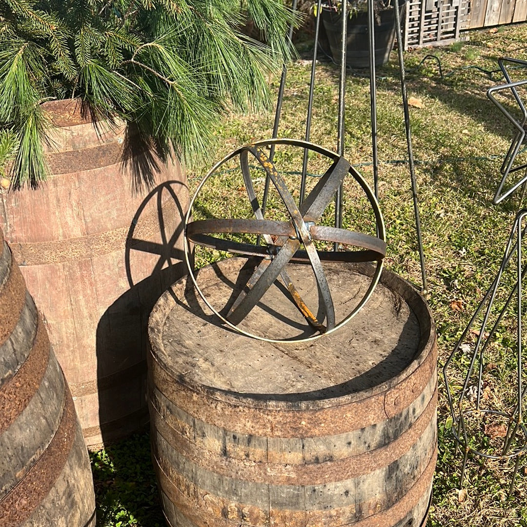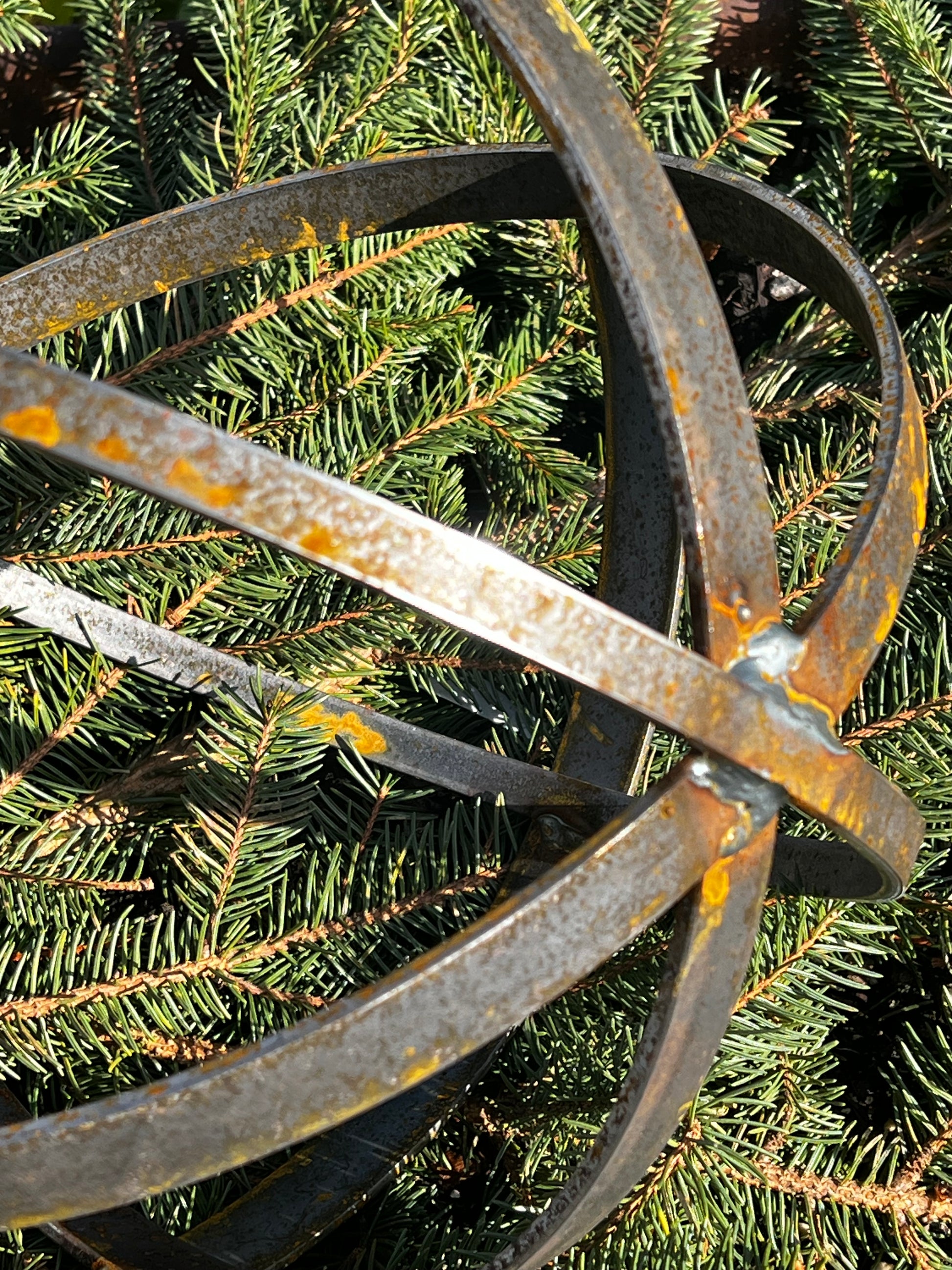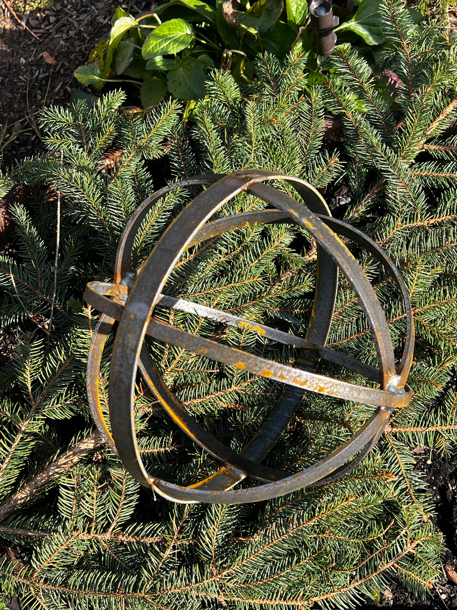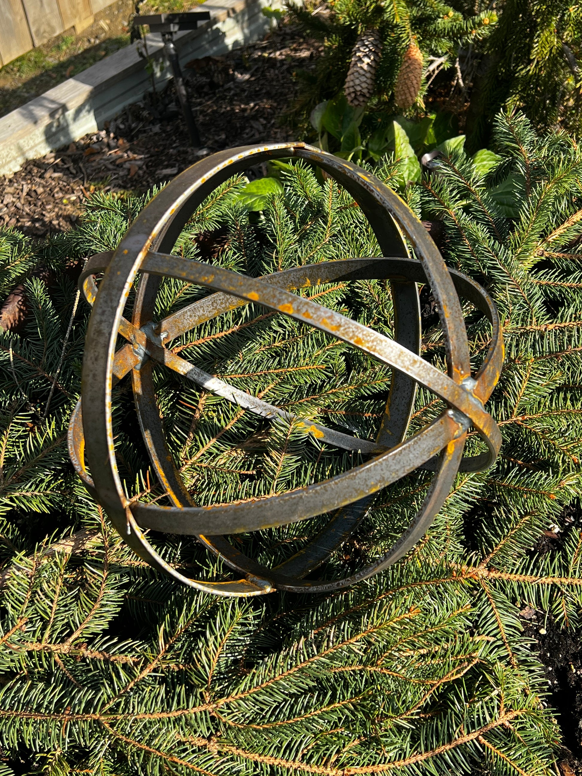 Add interest to your garden or outdoor space with our Amish crafted metal orbs. Unfinished metal...made to rust...in beautiful round shapes. Even hang from a sturdy tree limb. 8” and 12” shown together.