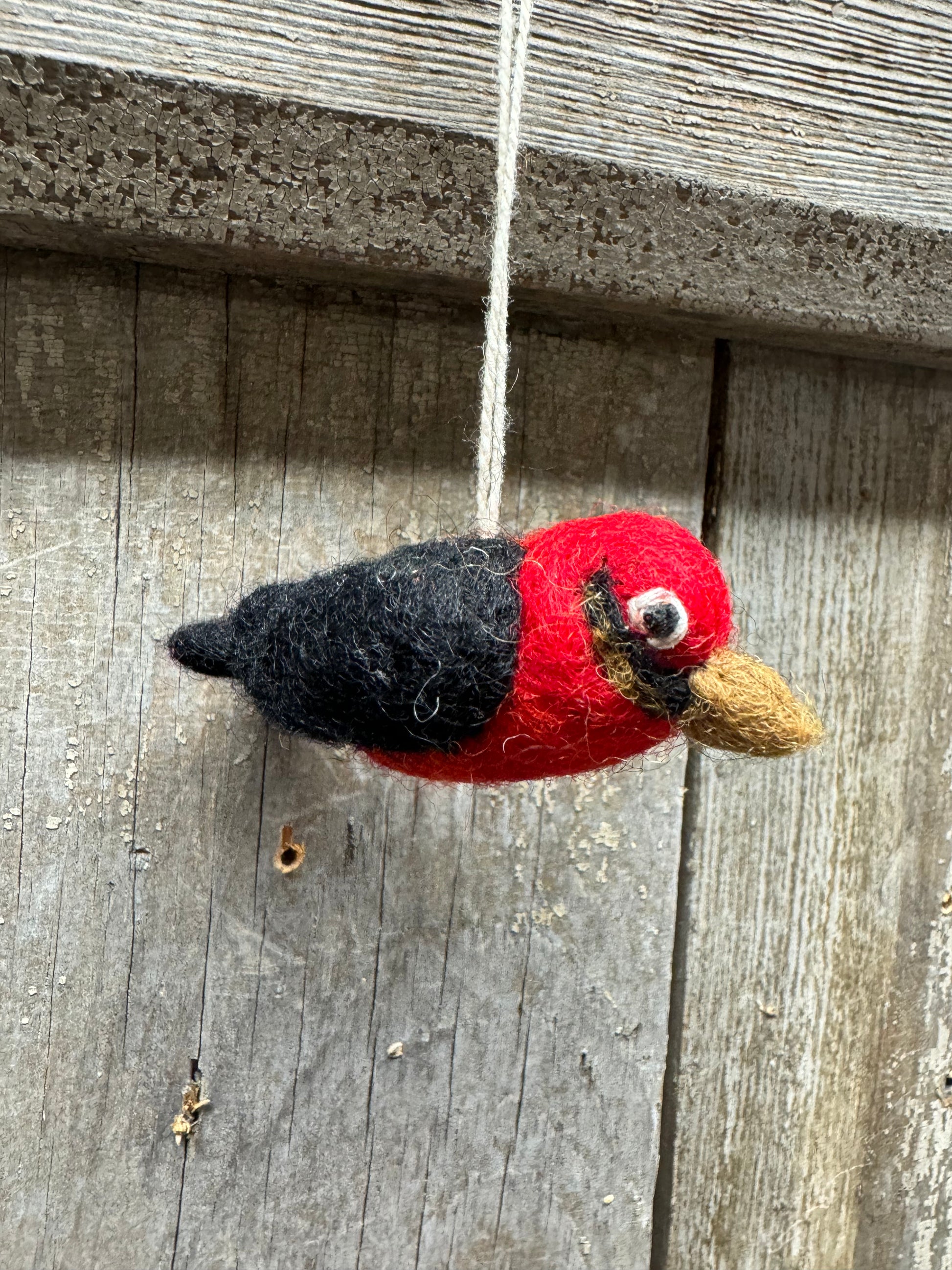 The Scarlet Tanger! Colored in vibrant red, black and white, felted from pure natural wool from New Zealand. Uniquely hand crafted in Nepal. Measures about 2"x 3.5" hang as an ornament add a stick and use as a flower "poke" or a bowl filler when hang tag is removed.