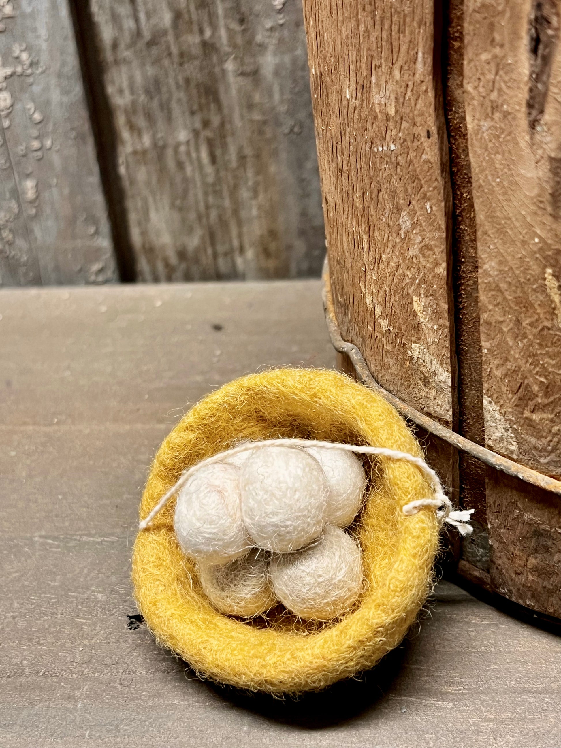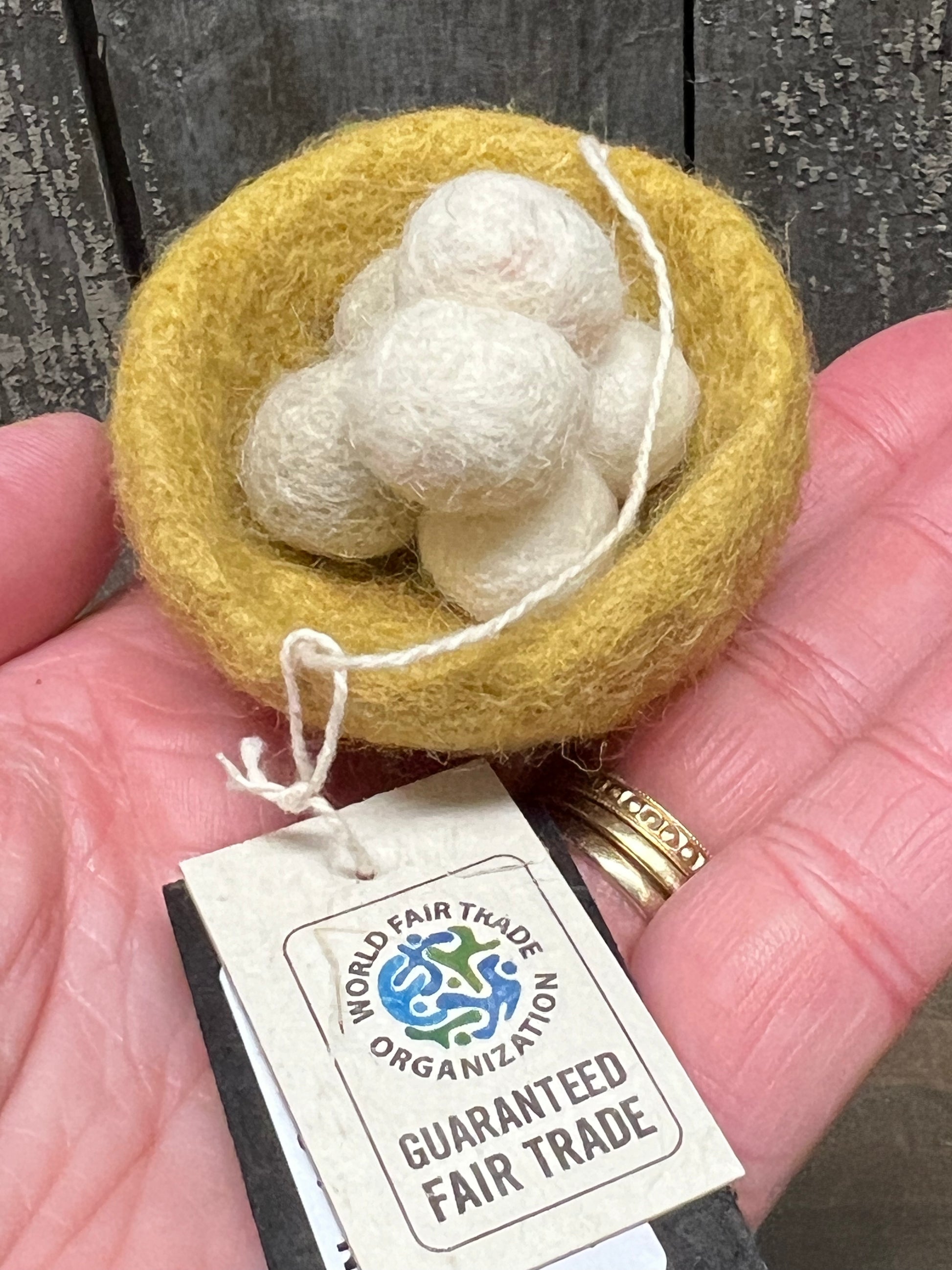Oh how cute! A sweet little nest and eggs in muted ochre and white tones felted from pure natural wool from New Zealand. Uniquely hand crafted in Nepal. Measures about 3"x 3" and can sit on its own or hang as an ornament.