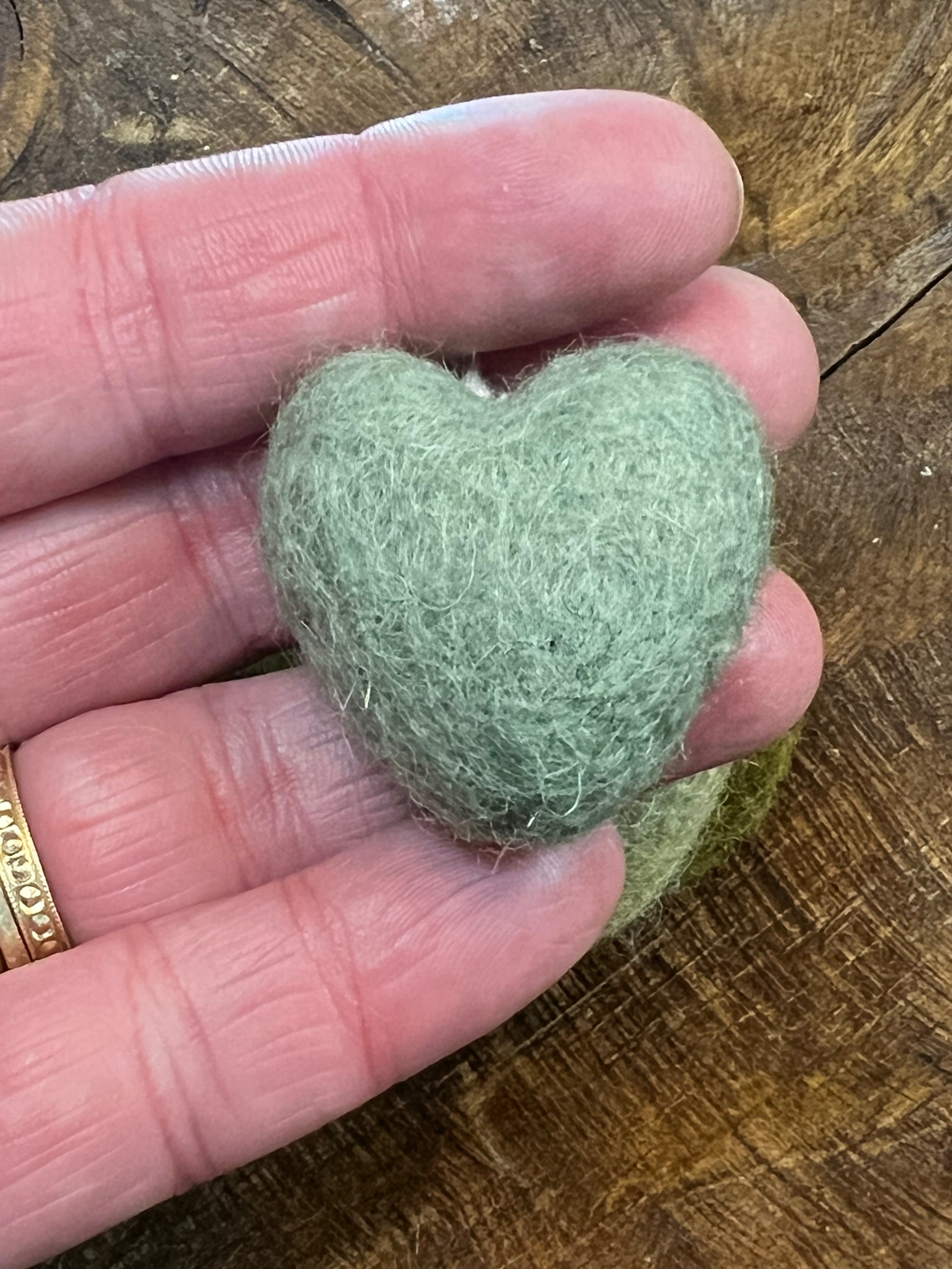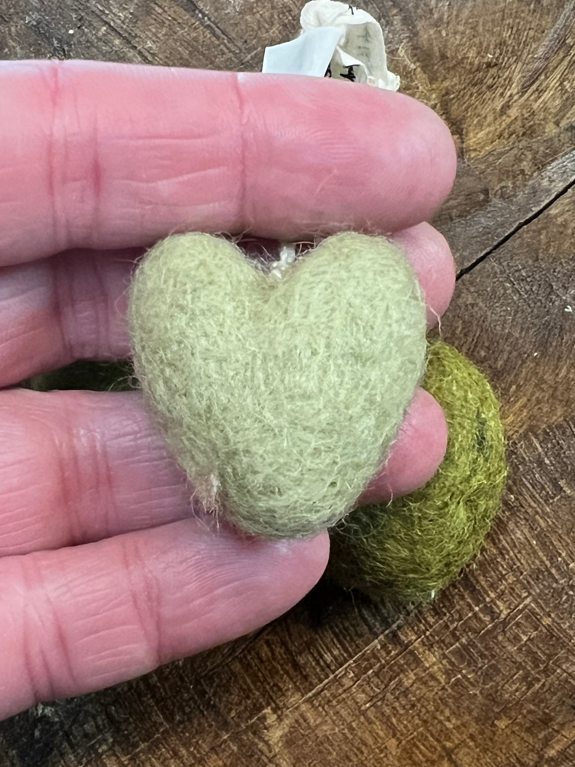 Adorable hearts in muted tones perfect for ornaments and even bowl fillers. Stack in a jar or string on a garland, so many options. Felted from pure natural wool from New Zealand. Uniquely hand crafted in Nepal. Measures about 1.5"x 1.5" and can sit on its own or hang as an ornament.