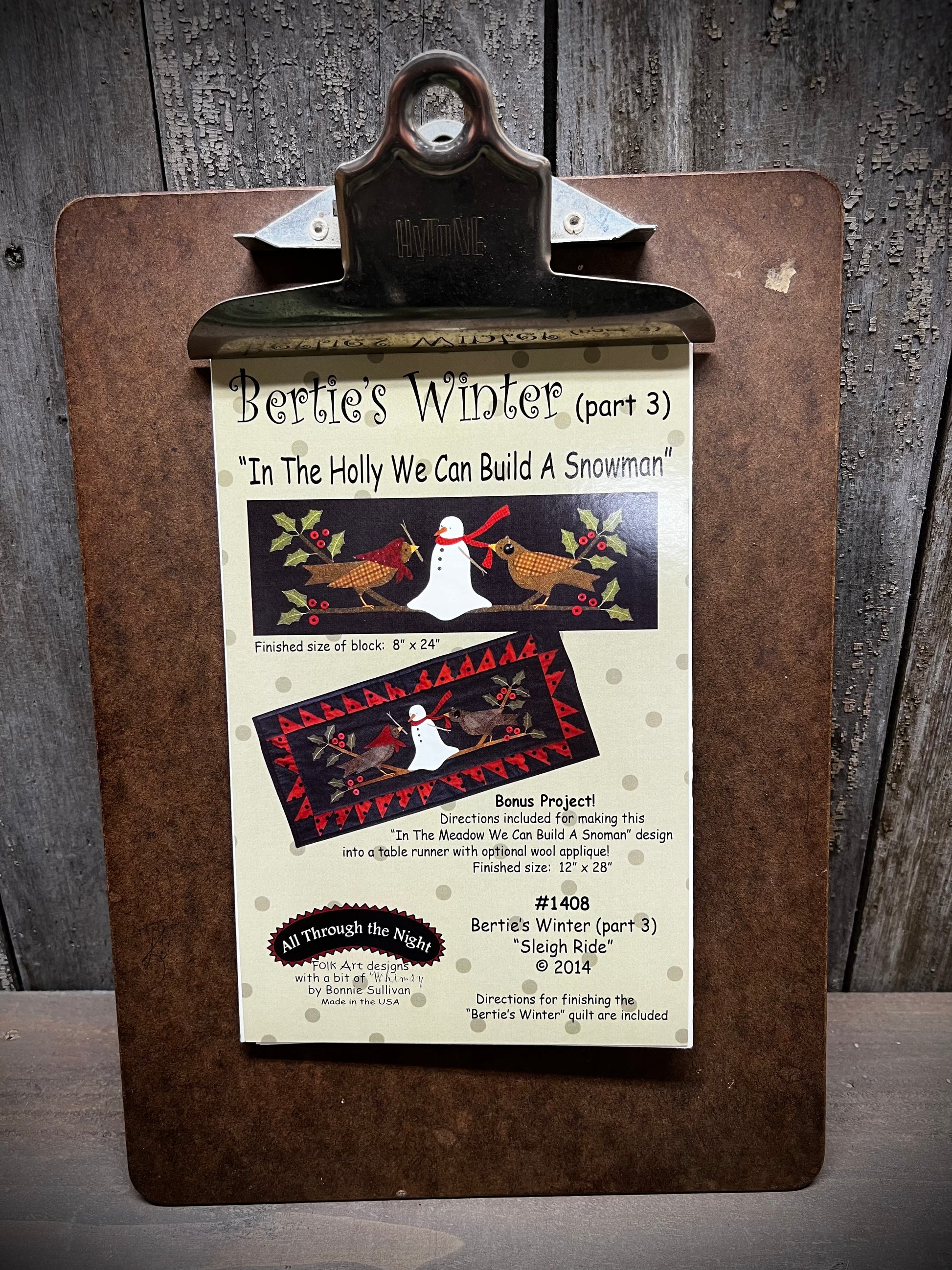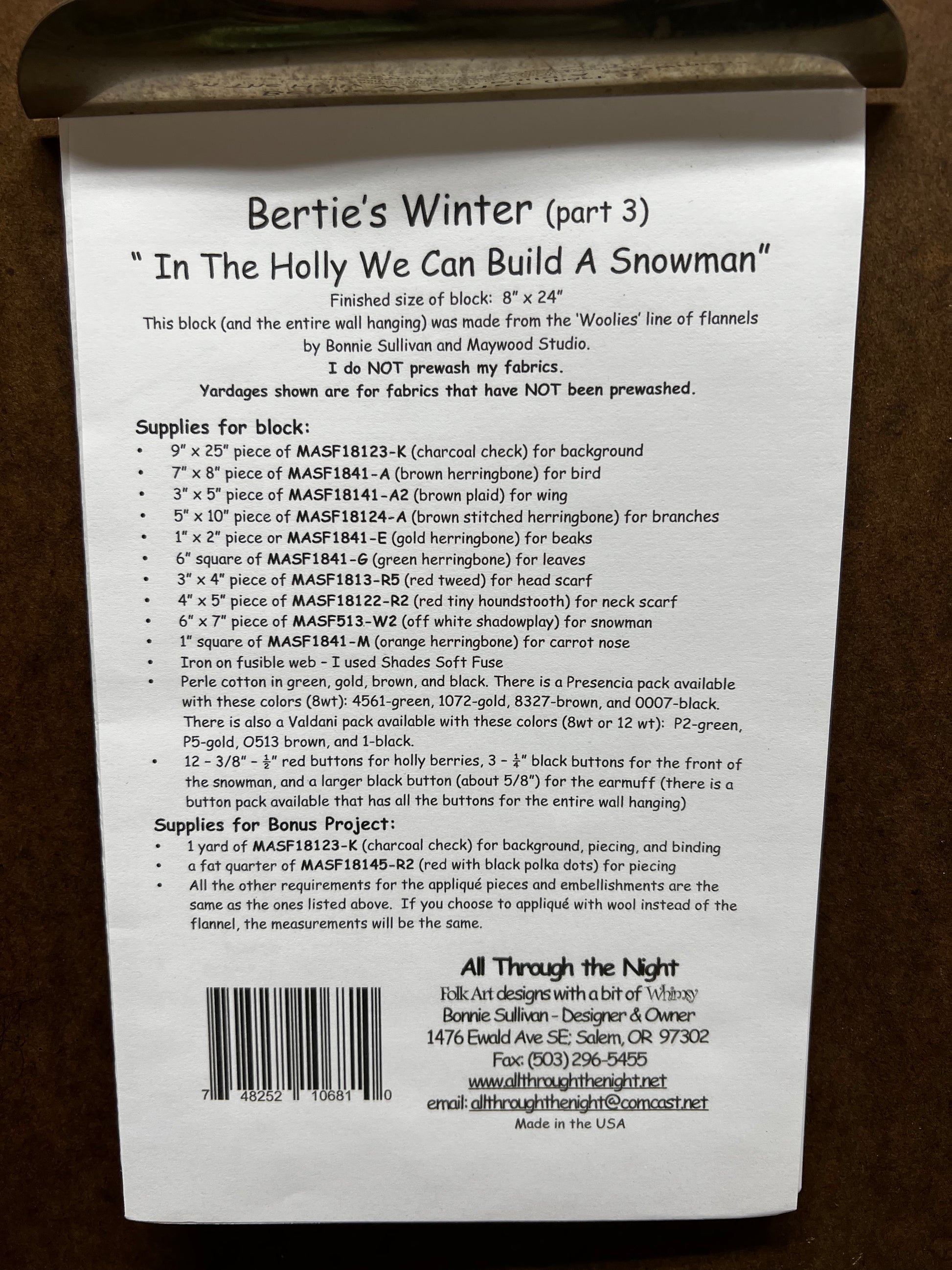 Bertie's Winter block is 8" x 24" and includes the bonus "In the Holly We Can Build a Snowman" design for a pillow with optional wool applique directions. Finished pillow size is 12" x 28"