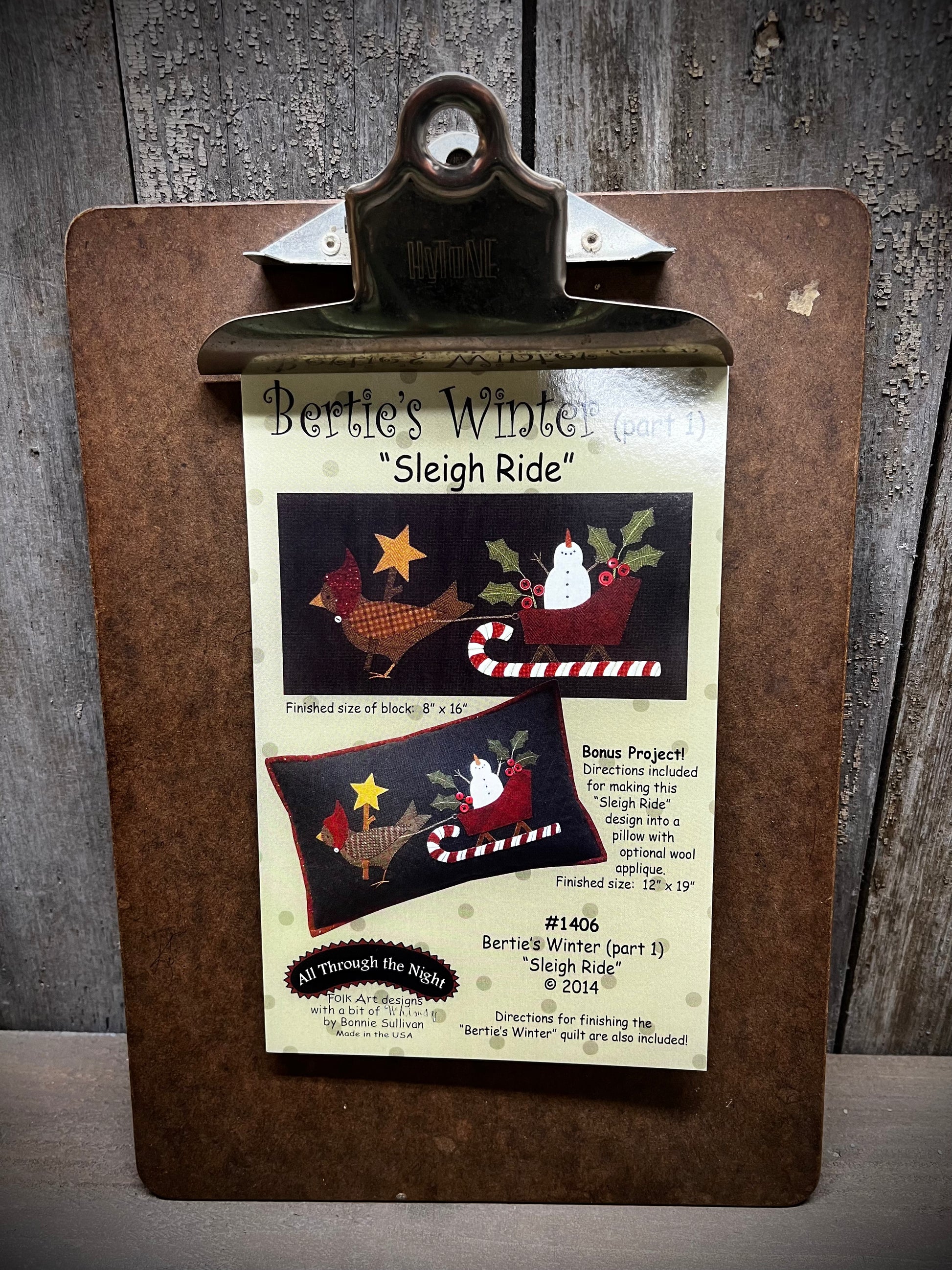 Bertie's Winter block is 8" x 16" and includes the bonus "Sleigh Ride" design for a pillow with optional wool applique directions. Finished pillow size is 12" x 19"