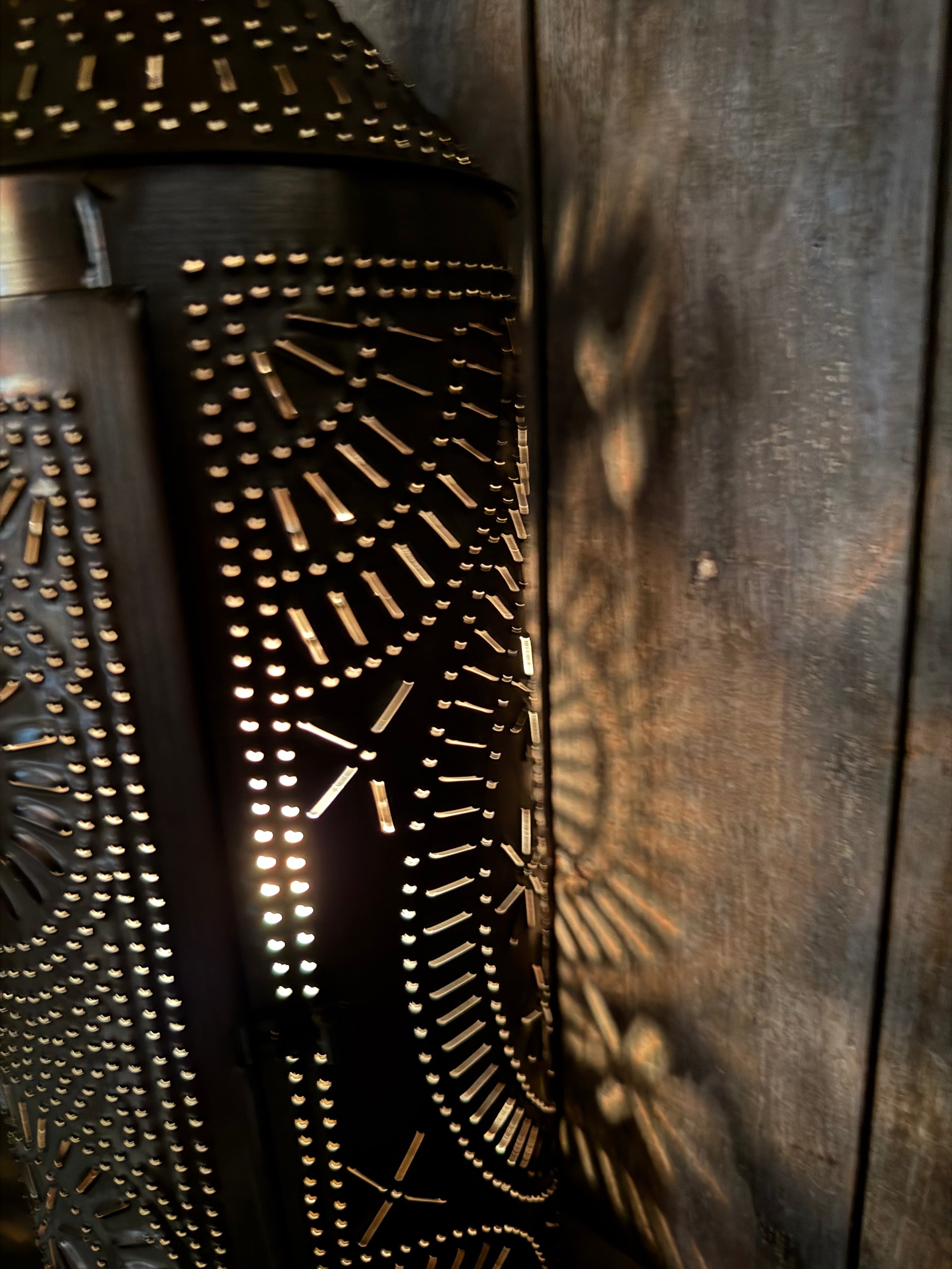 The Chimney Lantern, in Kettle Black, is made using Irvin’s Tinware's most popular punched tin pattern. This is the perfect accent light and looks great sitting or hanging. Shown with a silicone bulb, not included.